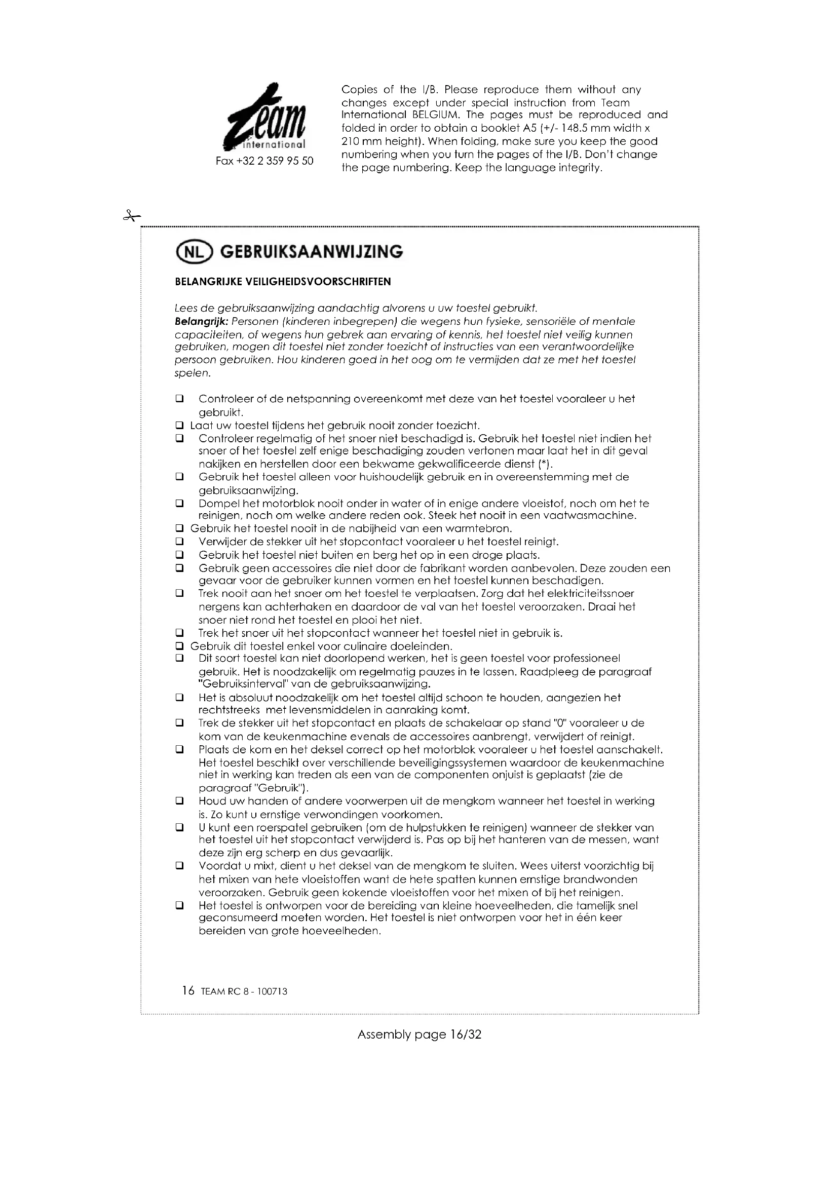 Om ons milieu en onze gezondheid te beschermen, moet afgedankte elektrische en elektronische apparatuur in overeenstemming met welbepaalde regels weggegooid worden. Dit vergt zowel de inzet van de leveranciers als van de gebruikers. Om deze reden mag uw apparaat, zoals op het typeplaatje of op de verpakking aangegeven door het symbool , niet met het gewone huisvuil weggegooid worden. De gebruiker heeft het recht het toestel naar een gemeentelijk centrum van gescheiden inzameling te brengen waar het overeenkomstig de richtlijn hergebruikt, gerecycleerd of voor andere doeleinden gebruikt zal worden. Copies of the I/B. Please reproduce them without any changes except under special instruction from Team International BELGIUM. The pages must be reproduced and folded in order to obtain a booklet A5 (+/- 148.5 mm width x 210 mm height). When folding, make sure you keep the good numbering when you turn the pages of the I/B. Don’t change the page numbering. Keep the language integrity.