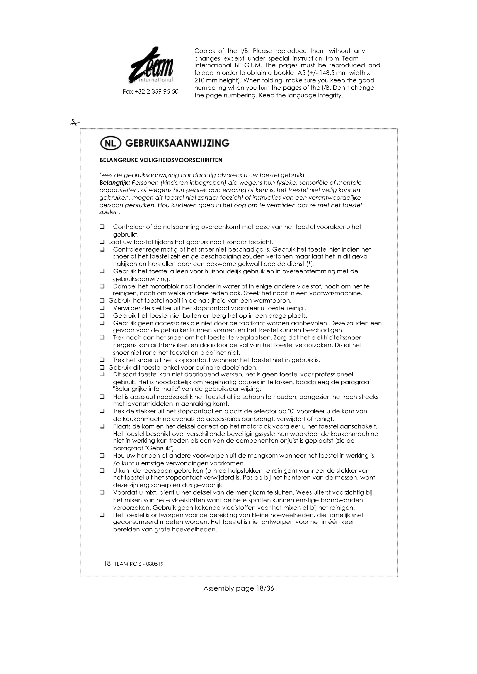 Om ons milieu en onze gezondheid te beschermen, moet afgedankte elektrische en elektronische apparatuur in overeenstemming met welbepaalde regels weggegooid worden. Dit vergt zowel de inzet van de leveranciers als van de gebruikers. Om deze reden mag uw apparaat, zoals op het typeplaatje of op de verpakking aangegeven door het symbool , niet met het gewone huisvuil weggegooid worden. De gebruiker heeft het recht het toestel naar een gemeentelijk centrum van gescheiden inzameling te brengen waar het overeenkomstig de richtlijn hergebruikt, gerecycleerd of voor andere doeleinden gebruikt zal worden. Copies of the I/B. Please reproduce them without any changes except under special instruction from Team International BELGIUM. The pages must be reproduced and folded in order to obtain a booklet A5 (+/- 148.5 mm width x 210 mm height). When folding, make sure you keep the good numbering when you turn the pages of the I/B. Don’t change the page numbering. Keep the language integrity.