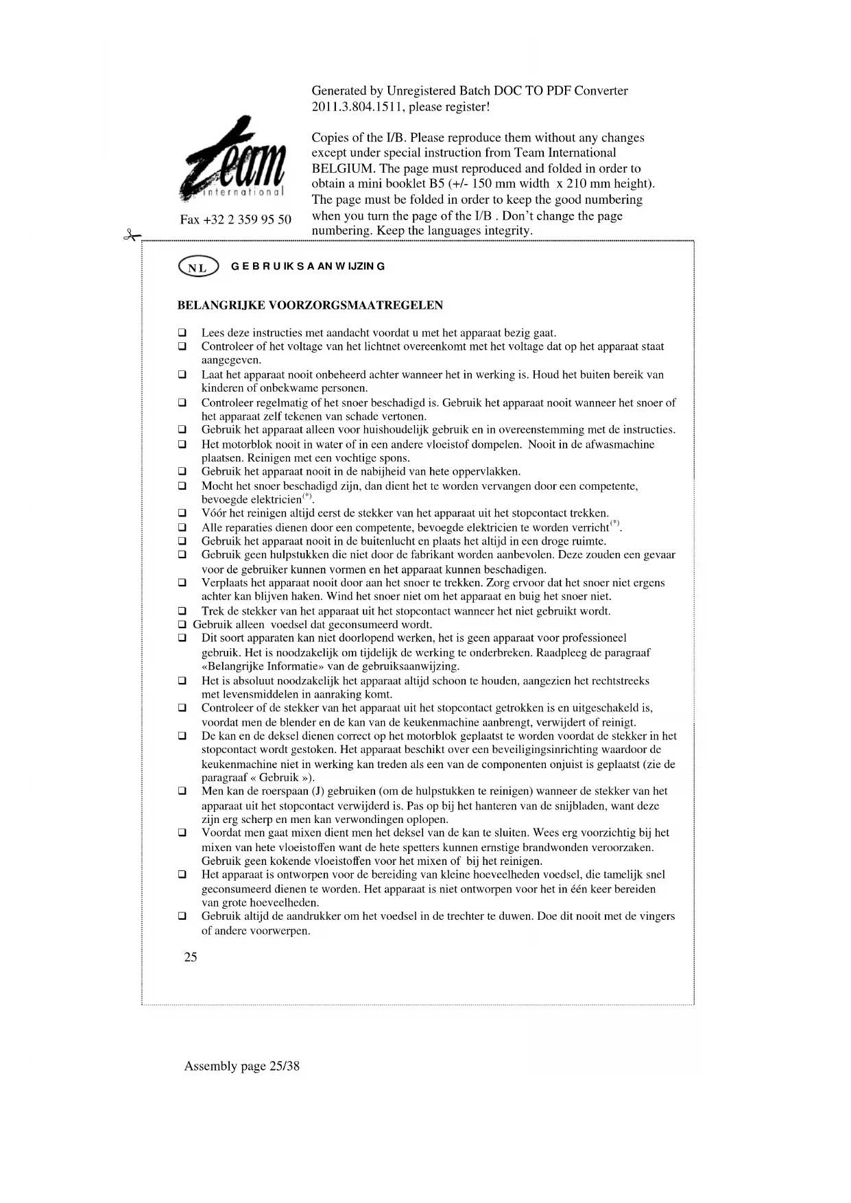 Gebruik het apparaat nooit in de buitenlucht en plaats het altijd in een droge ruimte. Gebruik geen hulpstukken die niet door de fabrikant worden aanbevolen. Deze zouden een gevaar voor de gebruiker kunnen vormen en het apparaat kunnen beschadigen. Verplaats het apparaat nooit door aan het snoer te trekken. Zorg ervoor dat het snoer niet ergens achter kan blijven haken. Wind het snoer niet om het apparaat en buig het snoer niet. Trek de stekker van het apparaat uit het stopcontact wanneer het niet gebruikt wordt. Gebruik alleen voedsel dat geconsumeerd wordt. Dit soort apparaten kan niet doorlopend werken, het is geen apparaat voor professioneel gebruik. Het is noodzakelijk om tijdelijk de werking te onderbreken. Raadpleeg de paragraaf «Belangrijke Informatie» van de gebruiksaanwijzing. Het is absoluut noodzakelijk het apparaat altijd schoon te houden, aangezien het rechtstreeks met levensmiddelen in aanraking komt. Controleer of de stekker van het apparaat uit het stopcontact getrokken is en uitgeschakeld is, voordat men de blender en de kan van de keukenmachine aanbrengt, verwijdert of reinigt. De kan en de deksel dienen correct op het motorblok geplaatst te worden voordat de stekker in het stopcontact wordt gestoken. Het apparaat beschikt over een beveiligingsinrichting waardoor de keukenmachine niet in werking kan treden als een van de componenten onjuist is geplaatst (zie de paragraaf « Gebruik »). Men kan de roerspaan (J) gebruiken (om de hulpstukken te reinigen) wanneer de stekker van het apparaat uit het stopcontact verwijderd is. Pas op bij het hanteren van de snijbladen, want deze zijn erg scherp en men kan verwondingen oplopen. Voordat men gaat mixen dient men het deksel van de kan te sluiten. Wees erg voorzichtig bij het mixen van hete vloeistoffen want de hete spetters kunnen ernstige brandwonden veroorzaken. Gebruik geen kokende vloeistoffen voor het mixen of bij het reinigen. Het apparaat is ontworpen voor de bereiding van kleine hoeveelheden voedsel, die tamelijk snel geconsumeerd dienen te worden. Het apparaat is niet ontworpen voor het in één keer bereiden van grote hoeveelheden. Gebruik altijd de aandrukker om het voedsel in de trechter te duwen. Doe dit nooit met de vingers of andere voorwerpen.Generated by Unregistered Batch DOC TO PDF Converter 2011.3.804.1511, please register! Copies of the I/B. Please reproduce them without any changes except under special instruction from Team International BELGIUM. The page must reproduced and folded in order to obtain a mini booklet B5 (+/- 150 mm width x 210 mm height). The page must be folded in order to keep the good numbering when you turn the page of the I/B . Don’t change the page numbering. Keep the languages integrity.