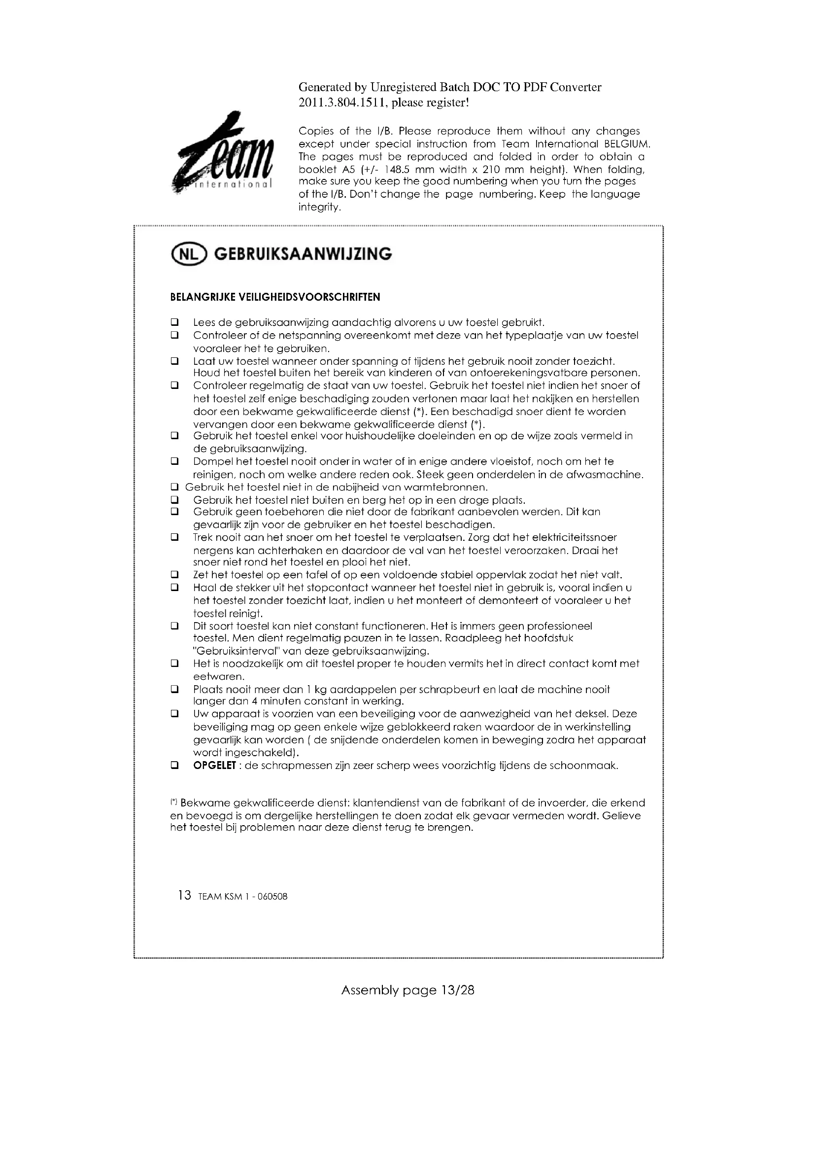 Om ons milieu en onze gezondheid te beschermen, moet afgedankte elektrische en elektronische apparatuur in overeenstemming met welbepaalde regels weggegooid worden. Dit vergt zowel de inzet van de leveranciers als van de gebruikers. Om deze reden mag uw apparaat, zoals op het typeplaatje of op de verpakking aangegeven door het symbool , niet met het gewone huisvuil weggegooid worden. De gebruiker heeft het recht het toestel naar een gemeentelijk centrum van gescheiden inzameling te brengen waar het overeenkomstig de richtlijn hergebruikt, gerecycleerd of voor andere doeleinden gebruikt zal worden.Generated by Unregistered Batch DOC TO PDF Converter 2011.3.804.1511, please register! Copies of the I/B. Please reproduce them without any changes except under special instruction from Team International BELGIUM. The pages must be reproduced and folded in order to obtain a booklet A5 (+/- 148.5 mm width x 210 mm height). When folding, make sure you keep the good numbering when you turn the pages of the I/B. Don’t change the page numbering. Keep the language integrity.