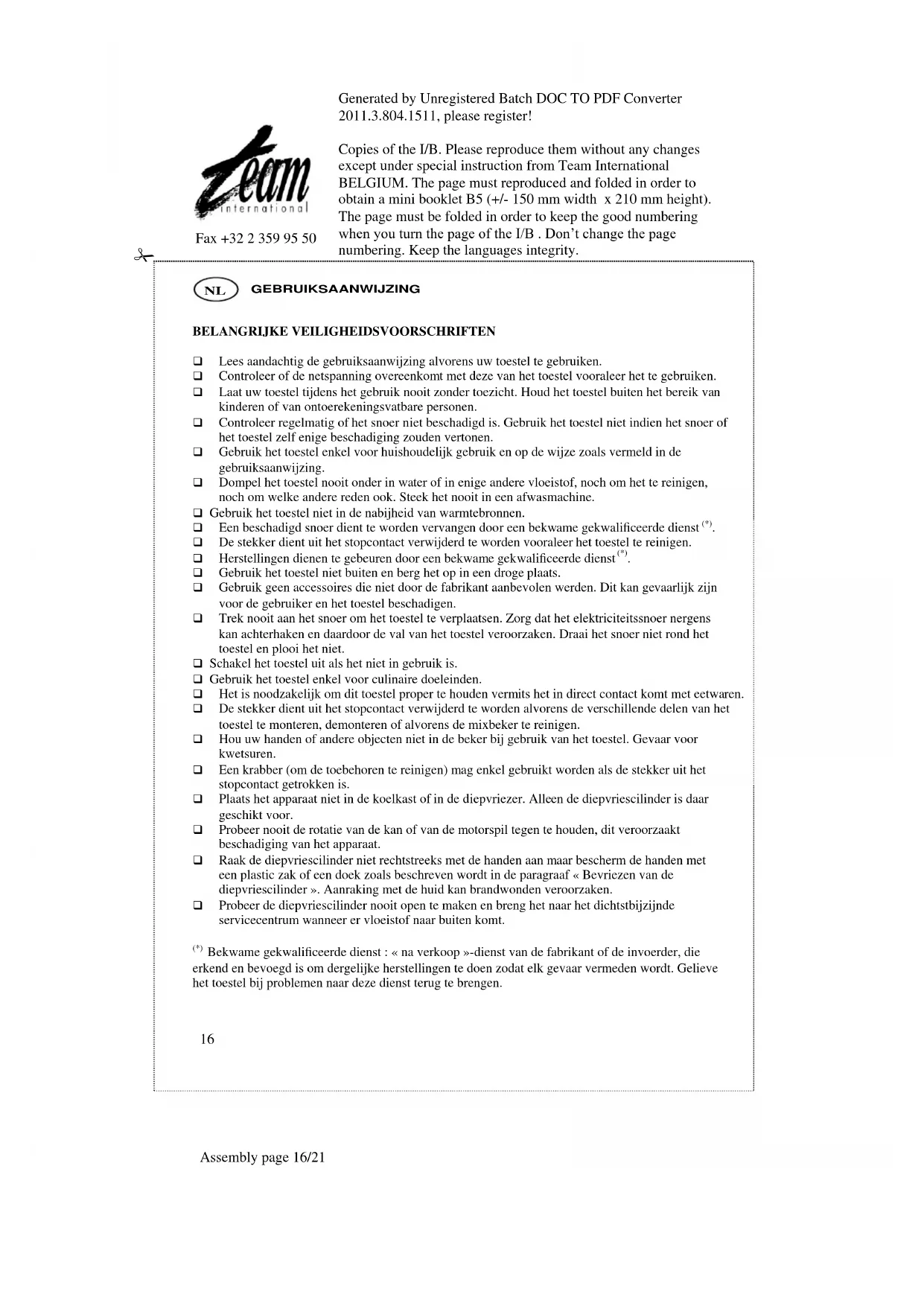 Maak gebruik van recepten om ijsmengsels te maken. Men kan van ieder soort recept gebruik maken op voorwaarde dat niet meer dan een kwart gallon (1 liter) ingrediënten nodig zijn. Haal de diepvriescilinder uit de diepvriezer en plaats het in de mengkan en op de motorbasis. De diepvriescilinder moet onmiddellijk in gebruik worden genomen nadat het uit de diepvriezer is gehaald, want de ontdooiing begint direct. Plaats de spatel in de mengkan en het deksel op de mengkan, zoals de tekening laat zien. Controleer of de 3 tipjes van het deksel op juiste wijze in de openingen op de motorbasis zijn aangebracht. Is het deksel juist geplaatst dan kan het niet met de wijzers van de klok mee gedraaid worden. Een slecht gemonteerd deksel heeft een slechte werking van het apparaat tot gevolg. Steek de stekker in het stopcontact en zet de aan/uit schakelaar op aan. Vervolgens giet u onmiddellijk, beetje bij beetje, uw dessertmengsel door de gietopening van het deksel in de mengkan, en sluit u het deksel. Laat het apparaat ongeveer 20-40 minuten in werking, of tot het mengsel bevroren raakt. De tijdspanne hangt af van de stevigheid van het ijs die u wenst te bekomen (hoe langer de bereiding hoe steviger het ijs). Vergeet niet dat vers eigengemaakt ijs niet de zelfde dikte heeft als het harde ijs dat u in de winkel koopt. Het ijs zal bevroren zijn maar toch zacht. Voor hard ijs schept u met een rubber spatel of een houten lepel het ijs uit de mengkan in een lucht doorlaatbare houder. Enkele uren in de diepvriezer plaatsen, of tot het ijs hard is geworden. U kunt het ijs in de mengkan laten of het voor korte tijd in de diepvriezer, in de mengkan, hard laten worden (niet langer dan 30 minuten). Voor het gedurende lange tijd laten bevriezen dient u een lucht doorlaatbare houder te gebruiken. Voor een direkte bereiding (zonder een extra invriesperiode) schakelt u het apparaat uit, schept u met rubber, plastic of houten lepel het teveel aan dessert weg en pas dan verwijdert u het deksel en schept u het dessert uit de mengkan.Generated by Unregistered Batch DOC TO PDF Converter 2011.3.804.1511, please register! Copies of the I/B. Please reproduce them without any changes except under special instruction from Team International BELGIUM. The page must reproduced and folded in order to obtain a mini booklet B5 (+/- 150 mm width x 210 mm height). The page must be folded in order to keep the good numbering when you turn the page of the I/B . Don’t change the page numbering. Keep the languages integrity.