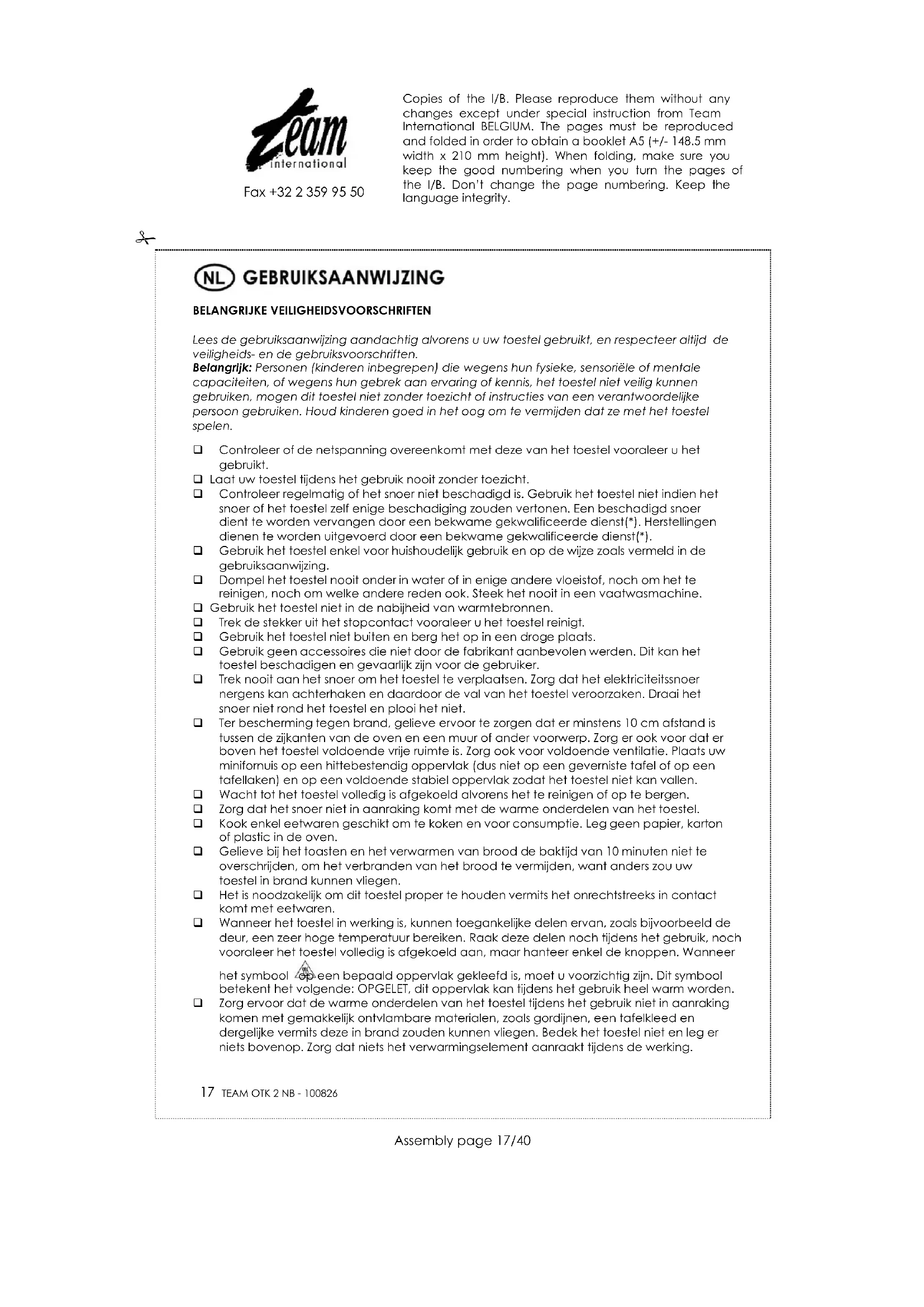 BELANGRIJKE VEILIGHEIDSVOORSCHRIFTEN Lees de gebruiksaanwijzing aandachtig alvorens u uw toestel gebruikt, en respecteer altijd de veiligheids- en de gebruiksvoorschriften. Belangrijk: Personen (kinderen inbegrepen) die wegens hun fysieke, sensoriële of mentale capaciteiten, of wegens hun gebrek aan ervaring of kennis, het toestel niet veilig kunnen gebruiken, mogen dit toestel niet zonder toezicht of instructies van een verantwoordelijke persoon gebruiken. Houd kinderen goed in het oog om te vermijden dat ze met het toestel spelen. Controleer of de netspanning overeenkomt met deze van het toestel vooraleer u het gebruikt. Laat uw toestel tijdens het gebruik nooit zonder toezicht. Controleer regelmatig of het snoer niet beschadigd is. Gebruik het toestel niet indien het snoer of het toestel zelf enige beschadiging zouden vertonen. Een beschadigd snoer dient te worden vervangen door een bekwame gekwalificeerde dienst(*). Herstellingen dienen te worden uitgevoerd door een bekwame gekwalificeerde dienst(*). Gebruik het toestel enkel voor huishoudelijk gebruik en op de wijze zoals vermeld in de gebruiksaanwijzing. Dompel het toestel nooit onder in water of in enige andere vloeistof, noch om het te reinigen, noch om welke andere reden ook. Steek het nooit in een vaatwasmachine. Gebruik het toestel niet in de nabijheid van warmtebronnen. Trek de stekker uit het stopcontact vooraleer u het toestel reinigt. Gebruik het toestel niet buiten en berg het op in een droge plaats. Gebruik geen accessoires die niet door de fabrikant aanbevolen werden. Dit kan het toestel beschadigen en gevaarlijk zijn voor de gebruiker. Trek nooit aan het snoer om het toestel te verplaatsen. Zorg dat het elektriciteitssnoer nergens kan achterhaken en daardoor de val van het toestel veroorzaken. Draai het snoer niet rond het toestel en plooi het niet. Ter bescherming tegen brand, gelieve ervoor te zorgen dat er minstens 10 cm afstand is tussen de zijkanten van de oven en een muur of ander voorwerp. Zorg er ook voor dat er boven het toestel voldoende vrije ruimte is. Zorg ook voor voldoende ventilatie. Plaats uw minifornuis op een hittebestendig oppervlak (dus niet op een geverniste tafel of op een tafellaken) en op een voldoende stabiel oppervlak zodat het toestel niet kan vallen. Wacht tot het toestel volledig is afgekoeld alvorens het te reinigen of op te bergen. Zorg dat het snoer niet in aanraking komt met de warme onderdelen van het toestel. Kook enkel eetwaren geschikt om te koken en voor consumptie. Leg geen papier, karton of plastic in de oven. Gelieve bij het toasten en het verwarmen van brood de baktijd van 10 minuten niet te overschrijden, om het verbranden van het brood te vermijden, want anders zou uw toestel in brand kunnen vliegen. Het is noodzakelijk om dit toestel proper te houden vermits het onrechtstreeks in contact komt met eetwaren. Wanneer het toestel in werking is, kunnen toegankelijke delen ervan, zoals bijvoorbeeld de deur, een zeer hoge temperatuur bereiken. Raak deze delen noch tijdens het gebruik, noch vooraleer het toestel volledig is afgekoeld aan, maar hanteer enkel de knoppen. Wanneer het symbool op een bepaald oppervlak gekleefd is, moet u voorzichtig zijn. Dit symbool betekent het volgende: OPGELET, dit oppervlak kan tijdens het gebruik heel warm worden. Zorg ervoor dat de warme onderdelen van het toestel tijdens het gebruik niet in aanraking komen met gemakkelijk ontvlambare materialen, zoals gordijnen, een tafelkleed en dergelijke vermits deze in brand zouden kunnen vliegen. Bedek het toestel niet en leg er niets bovenop. Zorg dat niets het verwarmingselement aanraakt tijdens de werking. Copies of the I/B. Please reproduce them without any changes except under special instruction from Team International BELGIUM. The pages must be reproduced and folded in order to obtain a booklet A5 (+/- 148.5 mm width x 210 mm height). When folding, make sure you keep the good numbering when you turn the pages of the I/B. Don’t change the page numbering. Keep the language integrity.