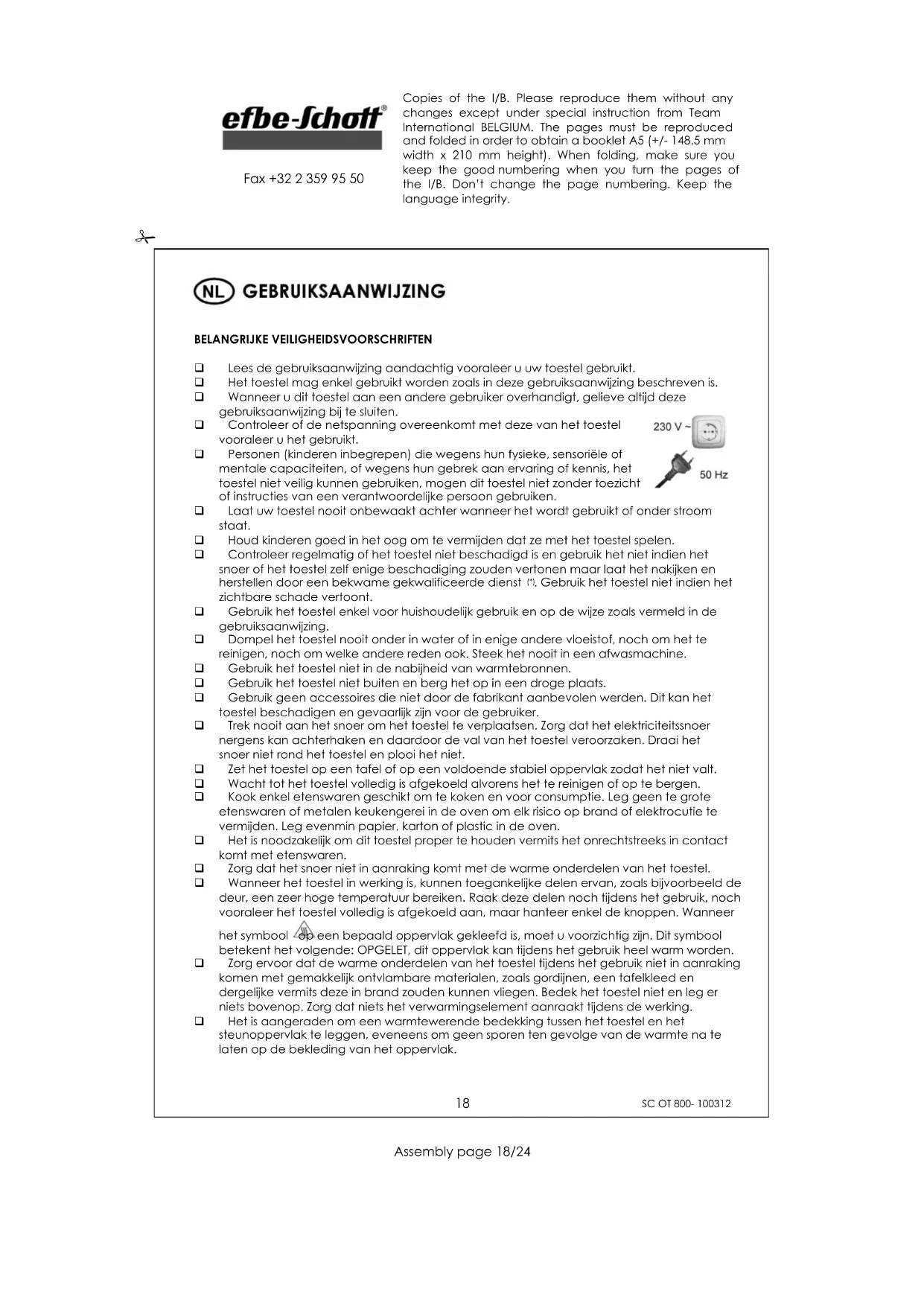Fax +32 2 359 95 50 Olie- of vetbereidingen kunnen in brand vliegen bij oververhitting. Voor het toasten van sneetjes brood, gelieve tijdens het toasten en het verwarmen van het brood de baktijd van 10 minuten niet te overschrijden, om het aanbranden van het brood te vermijden. Zelfs al is een insteltijd van 60 minuten mogelijk, dit is niet bestemd voor het toasten en verwarmen van brood. Opgelet: Zorg ervoor dat de oven aan de zijkanten ten minste 10cm en aan de bovenkant ten minste 25cm vrije ruimte heeft om een goede ventilatie mogelijk te maken. Bedek nooit de ventilatieopeningen. Uw toestel mag nooit worden aangezet door middel van een externe timer of een separaat systeem met afstandsbediening.