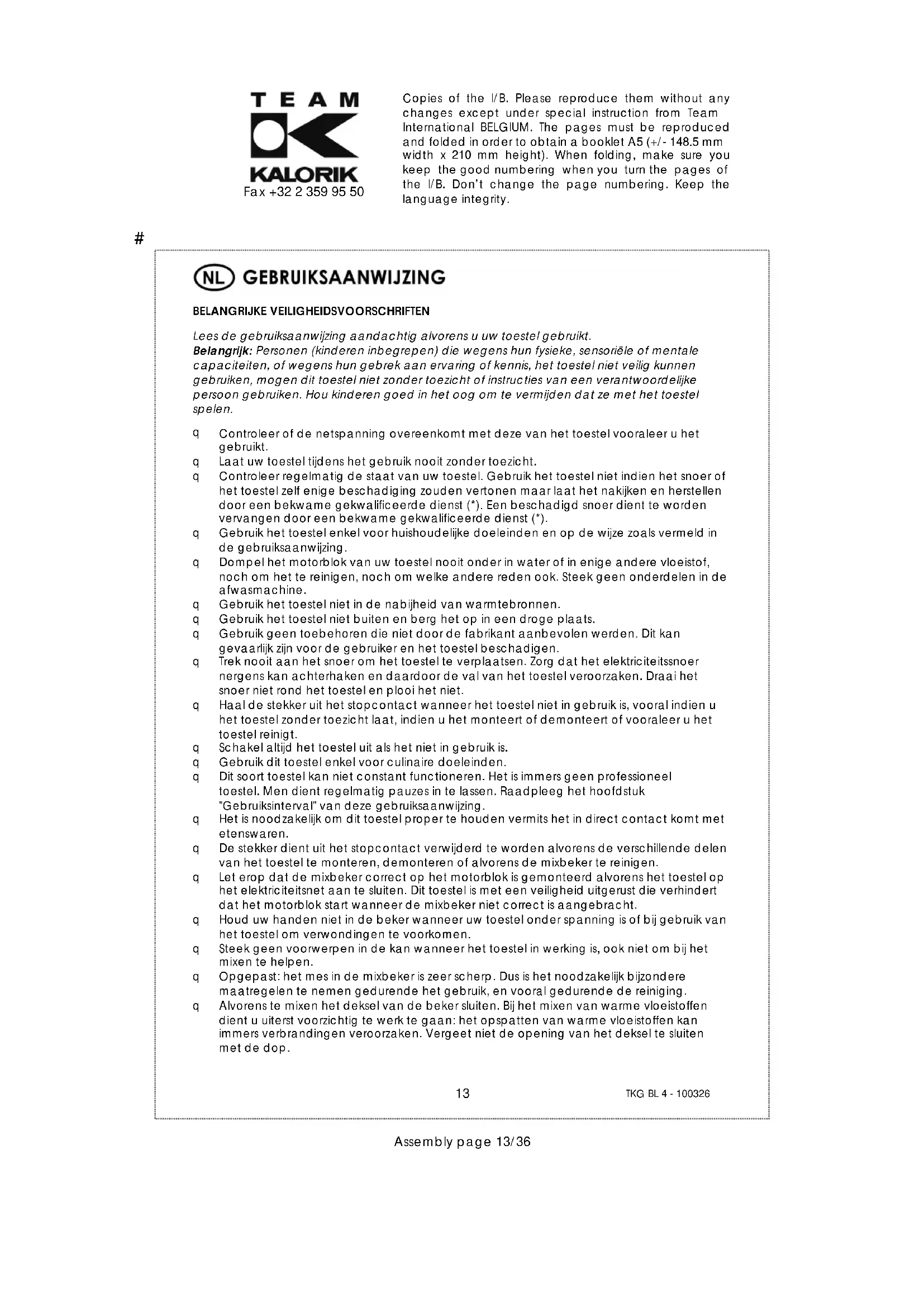 Alvorens te mixen het deksel van de beker sluiten. Bij het mixen van warme vloeistoffen dient u uiterst voorzichtig te werk te gaan: het opspatten van warme vloeistoffen kan immers verbrandingen veroorzaken. Vergeet niet de opening van het deksel te sluiten met de dop.# Copies of the I/B. Please reproduce them without any changes except under special instruction from Team International BELGIUM. The pages must be reproduced and folded in order to obtain a booklet A5 (+/- 148.5 mm width x 210 mm height). When folding, make sure you keep the good numbering when you turn the pages of the I/B. Don’t change the page numbering. Keep the language integrity.