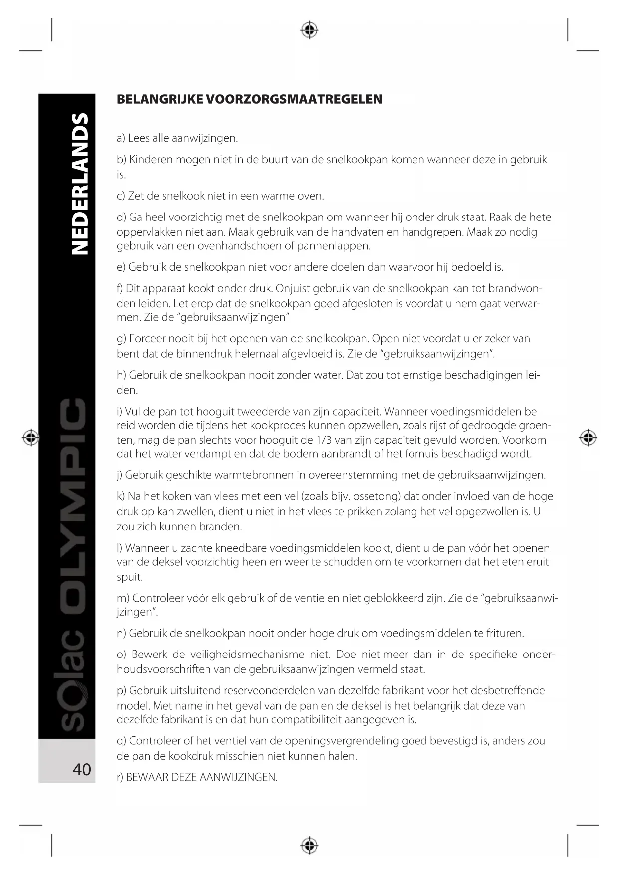 f) Dit apparaat kookt onder druk. Onjuist gebruik van de snelkookpan kan tot brandwonden leiden. Let erop dat de snelkookpan goed afgesloten is voordat u hem gaat verwar-men. Zie de "gebruiksaanwijzingen"