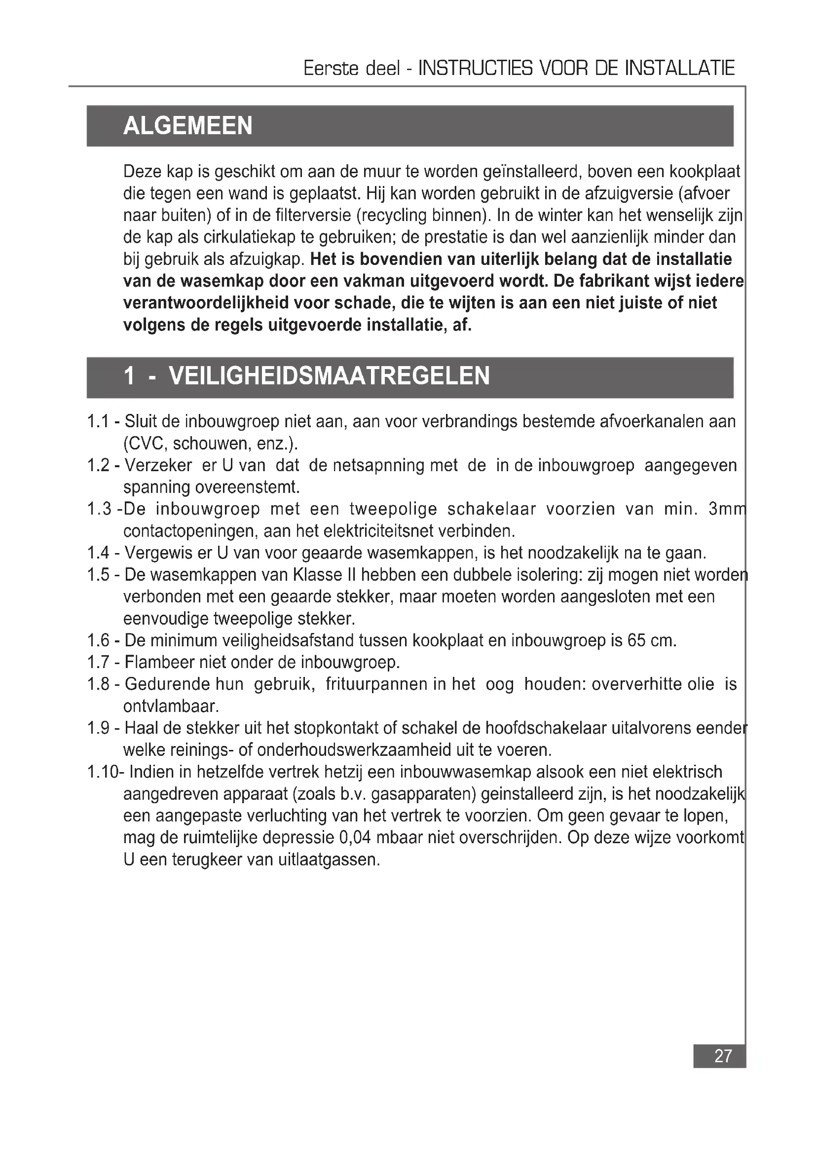 welke reinings- of onderhoudswerkzaamheid uit te voeren. 1.10- Indien in hetzelfde vertrek hetzij een inbouwwasemkap alsook een niet elektrisch aangedreven apparaat (zoals b.v. gasapparaten) geinstalleerd zijn, is het noodzakelijk een aangepaste verluchting van het vertrek te voorzien. Om geen gevaar te lopen, mag de ruimtelijke depressie 0,04 mbaar niet overschrijden. Op deze wijze voorkomt U een terugkeer van uitlaatgassen.28 Eerste deel - INSTRUCTIES VOOR DE INSTALLATIE