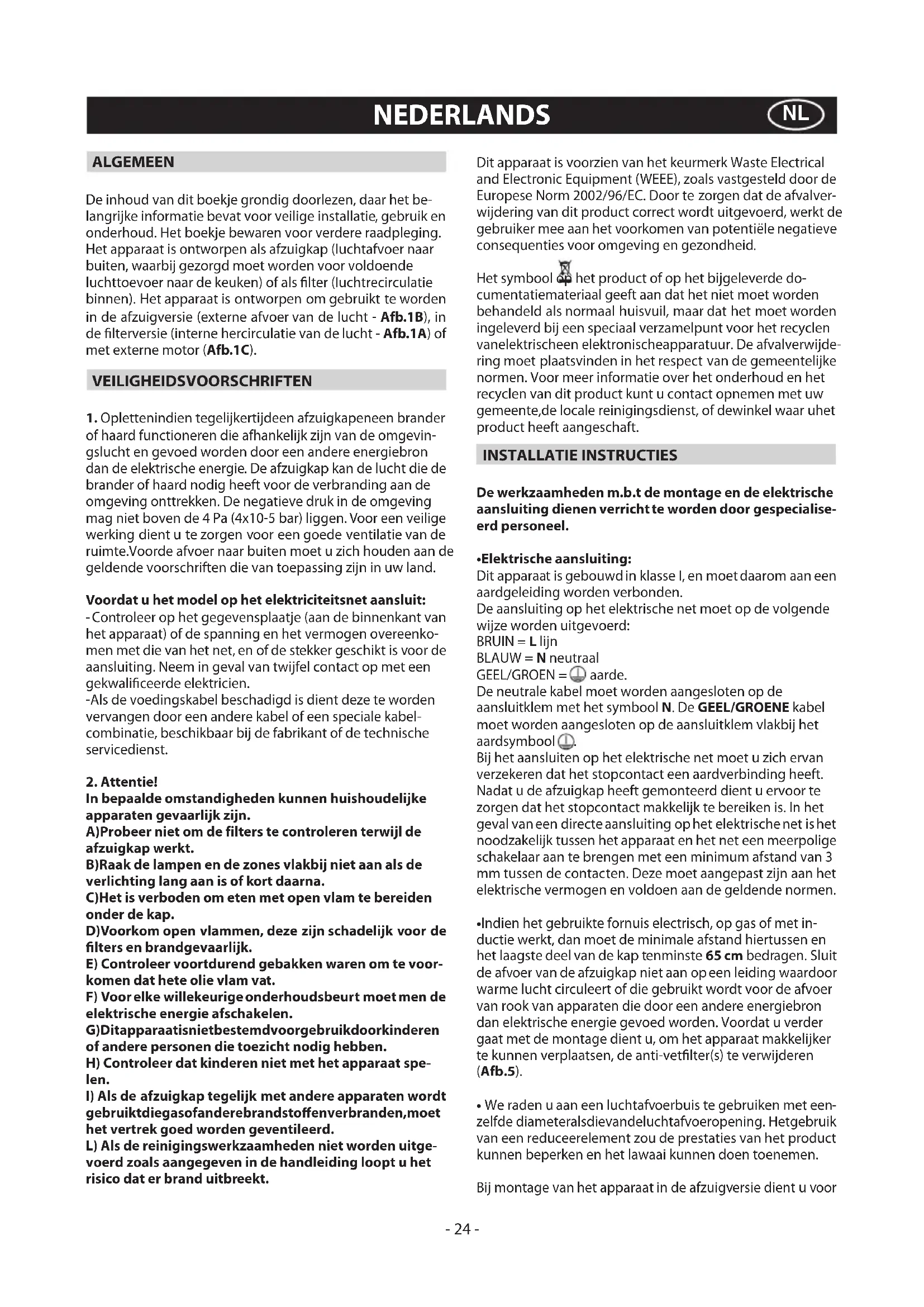 gebruiktdiegasofanderebrandstoenverbranden,moet het vertrek goed worden geventileerd. L) Als de reinigingswerkzaamheden niet worden uitge- voerd zoals aangegeven in de handleiding loopt u het risico dat er brand uitbreekt. Dit apparaat is voorzien van het keurmerk Waste Electrical and Electronic Equipment (WEEE), zoals vastgesteld door de Europese Norm 2002/96/EC. Door te zorgen dat de afvalver- wijdering van dit product correct wordt uitgevoerd, werkt de gebruiker mee aan het voorkomen van potentiële negatieve consequenties voor omgeving en gezondheid. Het symbool op het product of op het bijgeleverde do- cumentatiemateriaal geeft aan dat het niet moet worden behandeld als normaal huisvuil, maar dat het moet worden ingeleverd bij een speciaal verzamelpunt voor het recyclen vanelektrischeen elektronischeapparatuur. De afvalverwijde- ring moet plaatsvinden in het respect van de gemeentelijke normen. Voor meer informatie over het onderhoud en het recyclen van dit product kunt u contact opnemen met uw gemeente,de locale reinigingsdienst, of dewinkel waar uhet product heeft aangeschaft. INSTALLATIE INSTRUCTIES De werkzaamheden m.b.t de montage en de elektrische aansluiting dienen verricht te worden door gespecialise- erd personeel.