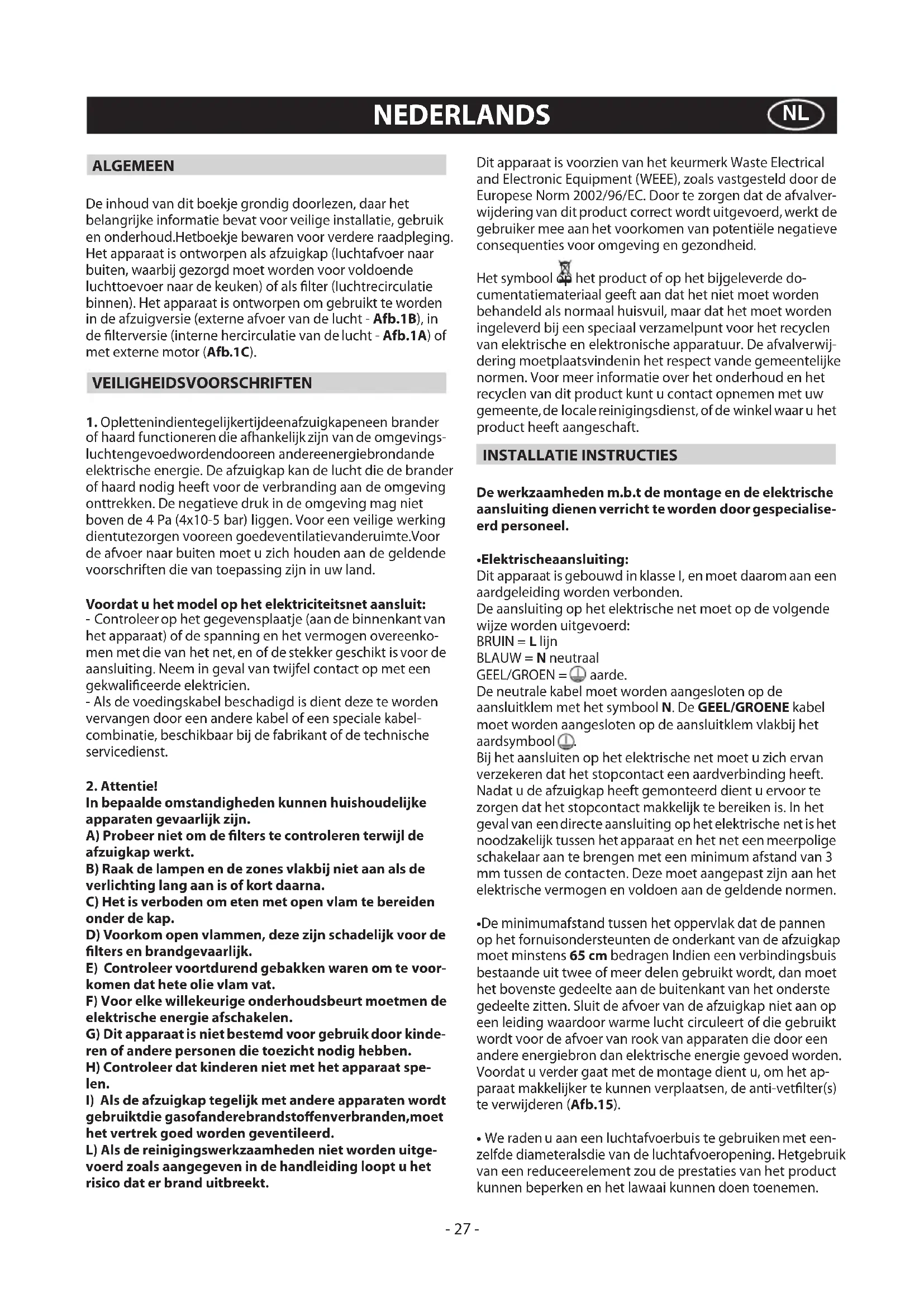 gebruiktdie gasofanderebrandstoenverbranden,moet het vertrek goed worden geventileerd. L) Als de reinigingswerkzaamheden niet worden uitge- voerd zoals aangegeven in de handleiding loopt u het risico dat er brand uitbreekt. Dit apparaat is voorzien van het keurmerk Waste Electrical and Electronic Equipment (WEEE), zoals vastgesteld door de Europese Norm 2002/96/EC. Door te zorgen dat de afvalver- wijdering van dit product correct wordt uitgevoerd, werkt de gebruiker mee aan het voorkomen van potentiële negatieve consequenties voor omgeving en gezondheid. Het symbool op het product of op het bijgeleverde do- cumentatiemateriaal geeft aan dat het niet moet worden behandeld als normaal huisvuil, maar dat het moet worden ingeleverd bij een speciaal verzamelpunt voor het recyclen van elektrische en elektronische apparatuur. De afvalverwij- dering moetplaatsvindenin het respect vande gemeentelijke normen. Voor meer informatie over het onderhoud en het recyclen van dit product kunt u contact opnemen met uw gemeente,de localereinigingsdienst, of de winkel waar u het product heeft aangeschaft. INSTALLATIE INSTRUCTIES De werkzaamheden m.b.t de montage en de elektrische aansluiting dienen verricht te worden door gespecialise- erd personeel.
