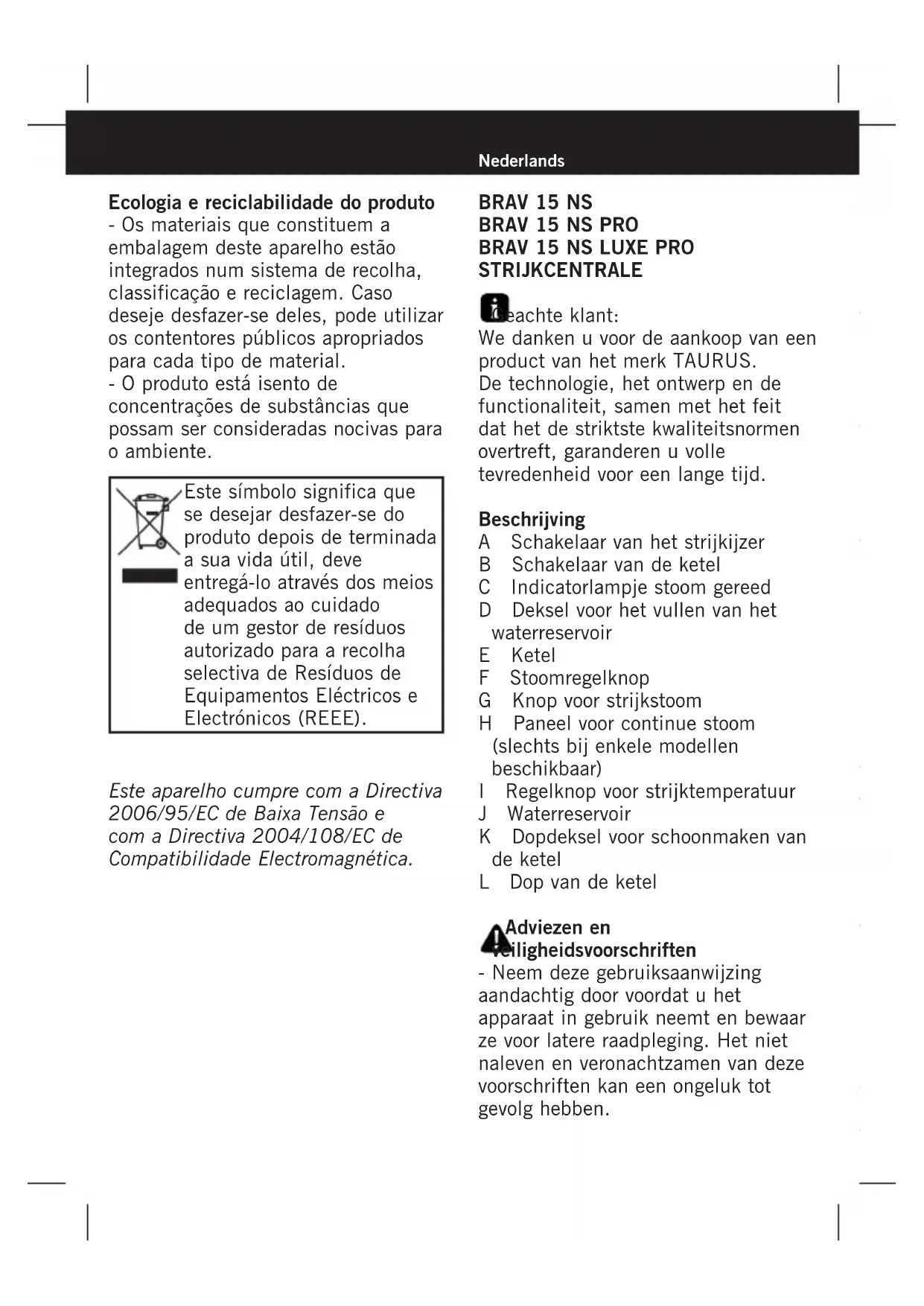 STRIJKCENTRALE Geachte klant: We danken u voor de aankoop van een product van het merk TAURUS. De technologie, het ontwerp en de functionaliteit, samen met het feit dat het de striktste kwaliteitsnormen overtreft, garanderen u volle tevredenheid voor een lange tijd. Beschrijving A Schakelaar van het strijkijzer B Schakelaar van de ketel C Indicatorlampje stoom gereed D Deksel voor het vullen van het waterreservoir E Ketel F Stoomregelknop G Knop voor strijkstoom H Paneel voor continue stoom (slechts bij enkele modellen beschikbaar) I Regelknop voor strijktemperatuur J Waterreservoir K Dopdeksel voor schoonmaken van de ketel L Dop van de ketel Adviezen en veiligheidsvoorschriften - Neem deze gebruiksaanwijzing aandachtig door voordat u het apparaat in gebruik neemt en bewaar ze voor latere raadpleging. Het niet naleven en veronachtzamen van deze voorschriften kan een ongeluk tot gevolg hebben. Gebruiksomgeving: - Het apparaat moet op een vlakke en stabiele oppervlakte geplaatst en gebruikt worden. - WAARSCHUWING: Om oververhitting te vermijden, het apparaat niet afdekken. Elektrische veiligheid: - Het apparaat niet gebruiken wanneer het snoer of de stekker beschadigd is. - Voordat u het apparaat op het stroomnet aansluit, dient u de spanningsgegevens op het typeplaatje te vergelijken met de waarden van het stroomnet. - Het apparaat aansluiten op een stopcontact dat minimaal 10 ampère aankan. - De stekker van het apparaat moet geschikt zijn voor het stopcontact. De stekker nooit wijzigen. Geen stekkeradapters gebruiken. - Het apparaat niet gebruiken wanneer het gevallen is, wanneer er zichtbare schade is, of indien er een lek bestaat. - Het stroomsnoer niet forceren. Het snoer nooit gebruiken om het apparaat op te tillen, te transporteren of om de stekker uit het stopcontact te trekken. - Zorg ervoor dat het stroomsnoer niet in contact komt met de hete oppervlakken van het apparaat. - De stekker niet met natte handen aanraken. Gebruik en voorzorgsmaatregelen: - Vóór het gebruik, het stroomsnoer van het apparaat volledig afrollen. Ecologia e reciclabilidade do produto - Os materiais que constituem a embalagem deste aparelho estão integrados num sistema de recolha, classificação e reciclagem. Caso deseje desfazer-se deles, pode utilizar os contentores públicos apropriados para cada tipo de material. - O produto está isento de concentrações de substâncias que possam ser consideradas nocivas para o ambiente. Este aparelho cumpre com a Directiva 2006/95/EC de Baixa Tensão e com a Directiva 2004/108/EC de Compatibilidade Electromagnética. Este símbolo significa que se desejar desfazer-se do produto depois de terminada a sua vida útil, deve entregá-lo através dos meios adequados ao cuidado de um gestor de resíduos autorizado para a recolha selectiva de Resíduos de Equipamentos Eléctricos e Electrónicos (REEE).BRAV 15 NS