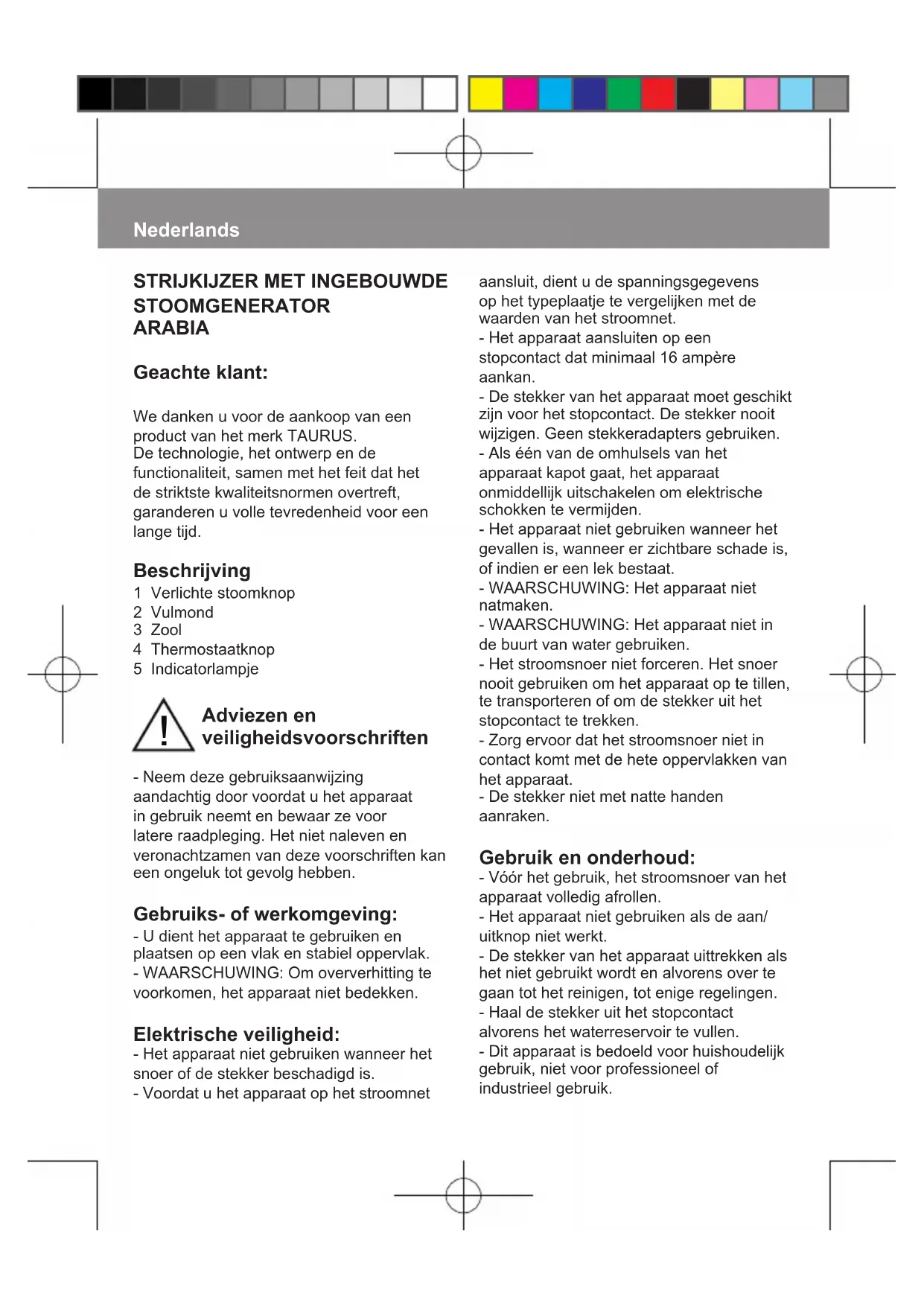 STOOMGENERATOR ARABIA Geachte klant: We danken u voor de aankoop van een product van het merk TAURUS. De technologie, het ontwerp en de functionaliteit, samen met het feit dat het de striktste kwaliteitsnormen overtreft, garanderen u volle tevredenheid voor een lange tijd. Beschrijving 1 Verlichte stoomknop 2 Vulmond 3 Zool 4 Thermostaatknop 5 Indicatorlampje Adviezen en veiligheidsvoorschriften - Neem deze gebruiksaanwijzing aandachtig door voordat u het apparaat in gebruik neemt en bewaar ze voor latere raadpleging. Het niet naleven en veronachtzamen van deze voorschriften kan een ongeluk tot gevolg hebben. Gebruiks- of werkomgeving: - U dient het apparaat te gebruiken en plaatsen op een vlak en stabiel oppervlak. - WAARSCHUWING: Om oververhitting te voorkomen, het apparaat niet bedekken. Elektrische veiligheid: - Het apparaat niet gebruiken wanneer het snoer of de stekker beschadigd is. - Voordat u het apparaat op het stroomnet Nederlands !- Dit apparaat is geen speelgoed. De kinderen moeten in het oog gehouden worden om te verzekeren dat ze niet met het apparaat spelen. - Dit apparaat is bedoeld voor gebruik door volwassenen. Laat niet toe dat het apparaat gebruikt wordt door gehandicapten, kinderen of door personen die niet vertrouwd zijn met dit type producten. - Dit apparaat opbergen buiten het bereik van kinderen en/of gehandicapten. - Het apparaat niet opbergen als het nog warm is. - Houd de strijkzool goed schoon voor een goede werking, en houd deze niet tegen metalen voorwerpen (zoals de strijkplank, knoppen, ritsen enz.). - Het apparaat uitsluitend met water gebruiken. - Het gebruik van gedistilleerd water wordt aanbevolen, met name als het kraanwater troebel is (na onderhoud van leidingen of in sommige laagveengebieden) of hard is (als het kalk of magnesium bevat). - Het apparaat altijd onder toezicht gebruiken. - Laat het apparaat nooit zonder toezicht aan staan. U bespaart hierdoor energie en verlengt tevens de levensduur van het apparaat. - Het apparaat niet op lichaamsdelen van mens of dier gebruiken. - De thermostaatregelaar op de minimum positie (MIN) draaien garandeert niet dat de friteuse permanent is uitgeschakeld. - Een onjuist gebruik, of een gebruik dat niet overeenstemt met de gebruiksaanwijzing, kan gevaar inhouden en doet de garantie en de aansprakelijkheid van de fabrikant teniet. Gebruiksaanwijzing Alvorens het gebruik: - Trek de beschermende lm van het apparaat. - Enkele delen van het strijkijzer zijn gesmeerd waardoor het apparaat bij het eerste gebruik enigszins kan roken. Na korte tijd stopt dit vanzelf. Vullen met water: - Als u de stoomfunctie wilt gebruiken is het noodzakelijk dat u eerst het reservoir met water vult. - Open het deksel van de vulmond. - Vul het reservoir met koud water. - Vul het reservoir, let hierbij op het maximale waterniveau MAX (Afb. 1). - Sluit het deksel van de vulmond. Gebruik: - Het snoer helemaal afrollen alvorens de stekker in het stopcontact te steken. - Zorg dat de elektriciteitsaansluiting stevig aangesloten is in het apparaat. - Het controlelampje (5) gaat aan - Stel de thermostaatknop in op de gewenste temperatuur. - Gebruik geen hogere temperatuur dan aangegeven op de kledingstukken die U gaat strijken. ● Temperatuur voor syntetische stof fen (Polyester, Nylon…). ●● Temperatuur voor zijde, wol. ●●● Temperatuur voor linnen. (Minimum temperatuur voor stoomstrijken) Max Temperatuur voor linnen. - Als de stof uit meerdere vezeltypes bestaat, kies dan de temperatuur overeenkomstig met de vezel die de laagste temperatuur vereist. (Bijvoorbeeld voor een stof die 60% polyester en 40% katoen bevat dient U de bijbehorende temperatuur voorReiniging - Trek de stekker van het apparaat uit en laat het afkoelen alvorens het te reinigen. - Maak het apparaat schoon met een vochtige doek met een paar druppels afwasmiddel en maak het apparaat daarna goed droog. - Gebruik geen oplosmiddelen of producten met een zure of basisch ph, zoals bleekwater, noch schuurmiddelen, om het apparaat schoon te maken. - Dompel het apparaat niet onder in water of een andere vloeistof en houd het niet onder de kraan. Zelfreinigingsfunctie: - Het is belangrijk om de zelfreinigingsfunctie minstens eens per maand uit te voeren om kalkresten en andere mineralen uit het apparaat te verwijderen. - Vul tot het maximale niveau, zoals aangegeven in de alinea “Vullen met water”. - Plaats het strijkijzer rechtop, steek de stekker in het stopcontact en kies de hoogste temperatuur. - Laat het apparaat opwarmen tot het controlelichtje aangeeft dat de juiste temperatuur bereikt is. - Trek de stekker uit het stopcontact en plaats het strijkijzer in de gootsteenbak. - Druk op de zelfreinigingsknop en blijf deze indrukken. - Laat het water uit de stoomgaten in de strijkzool lopen en schud het apparaat licht. - Laat de zelfreinigingsknop los na een minuut of als het reservoir leeg is. - Laat het strijkijzer rechtop staan tot deze afkoelt. Behandeling van de kalkaanslag: - Voor een perfecte werking van het polyester te kiezen). - Wacht tot het waarschuwingslampje (5) uit gaat. Dit geeft aan dat het apparaat de gewenste temperatuur bereikt heeft. Strijken met stoom: - Het is mogelijk met stoom te strijken als het reservoir water bevat en de gekozen temperatuur geschikt is. - Het apparaat beschikt over een knop (1) die de stoomknop kan blokkeren zodat U constante stoom heeft en niet steeds op de stoomknop hoeft te drukken. Verticaal strijken Het is mogelijk om opgehangen gordijnen of kledingstukken op een kledinghanger, etc. te strijken. Dit kunt U als volgt doen: - Kies de gewenste strijktemperatuur door de thermostaatknop van het strijkijzer met de klok mee te draaien. - Haal het strijkijzer van boven naar beneden langs het te strijken stuk. Druk hierbij op de stoomknop ( 1 ). Belangrijk: voor katoen en linnen is het aan te raden de strijkzool op de stof te houden. Voor andere jnere textielen raden wij aan de strijkzool enkele centimeters van de stof verwij