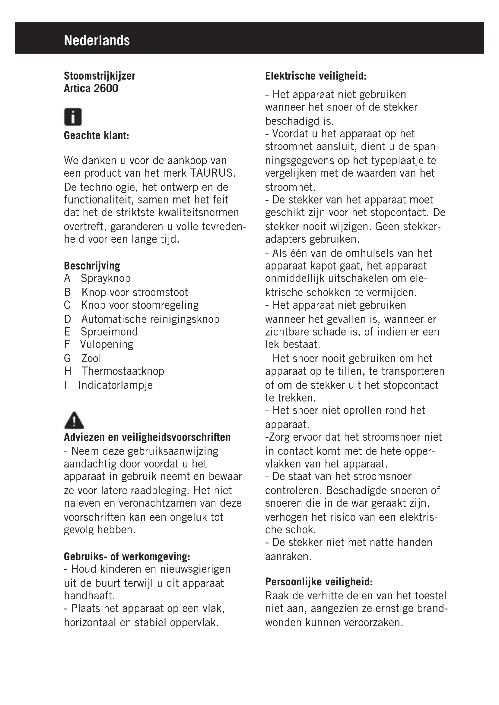 - • • Temperatura para algodão. (Temperatura mínima para engomar a vapor). Max Temperatura para linho. - Se um tecido contém fibras mistas, seleccionar a temperatura corres- pondente à fibra que requer uma tem- peratura mais baixa. (Por exemplo, para um tecido que contenha 60% de poliéster e 40% de algodão, deve seleccionar-se a temperatura corres- pondente ao poliéster). - Aguardar que a luz-piloto luminosa (I) se desligue, facto que indicará que o aparelho atingiu a temperatura adequada. - Durante o uso do aparelho, o piloto luminoso (I) ligar-se-á e desligar-se-á de forma automática, indicando deste modo o funcionamento dos elementos de aquecimento para manter a tem- peratura pretendida. Engomar sem vapor: - O aparelho dispõe de um regulador de vapor que colocado na posição “0”, permite engomar em seco (sem vapor). Passagem a vapor: - É possível passar a vapor sempre que o depósito contenha água e a temperatura seleccionada seja a adequada. Controlo do fluxo de vapor: - O aparelho dispõe do comando (C) que permite regular o fluxo de vapor. Spray: - O spray pode ser utilizado tanto na passagem a seco como na passagem a vapor. - Pressionar o botão spray ( A ) para efectuar esta operação. - É necessário pressionar várias vezes para iniciar pela primeira vez esta função. Golpe de vapor: - Esta função proporciona vapor extra para eliminar as rugas mais fortes. - Pressionar o botão de golpe devapor (B). Esperar uns segundos para que o vapor penetre nas fibras da peça de vestuário antes de voltar a pressionar novamente. Para uma óp- tima qualidade do vapor não aplicar mais de três pressões sucessivas de cada vez. - É necessário pressionar várias vezes para iniciar pela primeira vez esta função. Passagem a ferro na vertical: É possível passar a ferro cortinas que se encontram no seu lugar, vestuário no seu próprio cabide, etc. Para o fazer, proceder da seguinte forma: - Seleccionar a temperatura máxima do ferro de engomar, girando o regu- lador de temperatura do ferro para a direita (Fig 2) - Passar o ferro de engomar de cima para baixo com o interruptor de vapor accionado ( B ). Importante: recomenda-se colocar a base do ferro em contacto com tecidos como o algodão e o linho. Para outros tecidos mais delicados recomenda-se situar a base do ferro de engomar a uns centímetros de distância. Uma vez terminada a utilização do aparelho: - Seleccionar a posição mínima (MIN) através do comando selector de temperatura. - Desligar o aparelho da rede eléc- trica. - Retirar a água do depósito. - Limpar o aparelho. Limpeza - Desligar o aparelho da rede eléctrica e deixá-lo arrefecer antes de iniciar qualquer operação de limpeza. - Limpar o aparelho com um pano húmido com algumas gotas de deter- gente e secá-lo de seguida. - Não utilizar solventes, produtos com um factor pH ácido ou básico como a lixívia nem produtos abrasivos para a limpeza do aparelho. - Não submergir o aparelho em água ou em qualquer outro líquido nem o coloque debaixo da torneira. Função Auto Limpeza: - É importante realizar a função auto limpeza pelo menos uma vez por mês, de forma a eliminar os restos de calcário e de outros minerais acumu- lados no interior do aparelho. - Encher o depósito até ao nível máxi- mo, conforme é indicado na secção “enchimento de água”. - Colocar o ferro de engomar na posição vertical, ligar a corrente e seleccionar a temperatura máxima. - Deixar que o aparelho aqueça até a luz-piloto indicar que se atingiu a temperatura necessária. - Desligar o aparelho e colocá-lo no lava-louças. - Accionar o botão de auto limpeza e mantê-lo pressionado. - Permitir que a água saia através das saídas de vapor da base, agitando ligeiramente o aparelho. - Largar o botão de auto limpeza durante um minuto ou enquanto o depósito se esvazia.- Deixar o ferro de engomar na po- sição vertical até arrefecer. Anomalias e reparação - Em caso de avaria, levar o aparelho a um Serviço de Assistência Técnica autorizado. Não o tente desmontar ou reparar, já que pode ser perigoso. - Se a ligação de rede estiver dani- ficada, deve ser substituída e deve agir-se como em caso de avaria. Para produtos da União Europeia e/ou conforme os requisitos da regulamen- tação do seu país de origem: Ecologia e reciclabilidade do produto Este símbolo significa que se desejar desfazer-se do produto depois de terminada a sua vida útil, deve entregá-lo através dos meios adequados ao cuidado de um gestor de resíduos autorizado para a recolha selectiva de Resíduos de Equipamentos Eléctricos e Electrónicos (REEE). Este aparelho cumpre com a Directiva 2006/95/EC de Baixa Tensão e com a Directiva 2004/108/EC de Compati- bilidade Electromagnética.Nederlands Stoomstrijkijzer Artica 2600 Geachte klant: We danken u voor de aankoop van een product van het merk TAURUS. De technologie, het ontwerp en de functionaliteit, samen met het feit dat het de striktste kwaliteitsnormen overtreft, garanderen u volle tevreden- heid voor een lange tijd. Beschrijving A Sprayknop B Knop voor stroomstoot C Knop voor stoomregeling D Automatische reinigingsknop E Sproeimond F Vulopening G Zool H Thermostaatknop I Indicatorlampje Adviezen en veiligheidsvoorschriften - Neem deze gebruiksaanwijzing aandachtig door voordat u het apparaat in gebruik neemt en bewaar ze voor latere raadpleging. Het niet naleven en veronachtzamen van deze voorschriften kan een ongeluk tot gevolg hebben. Gebruiks- of werkomgeving: - Houd kinderen en nieuwsgierigen uit de buurt terwijl u dit apparaat handhaaft. - Plaats het apparaat op een vlak, horizontaal en stabiel oppervlak. Elektrische veiligheid: - Het apparaat niet gebruiken wanneer het snoer of de stekker beschadigd is. - Voordat u het apparaat op het stroomnet aansluit, dient u de span- ningsgegevens op het typeplaatje te vergelijken met de waarden van het stroomnet. - De stekker van het apparaat moet geschikt zijn v