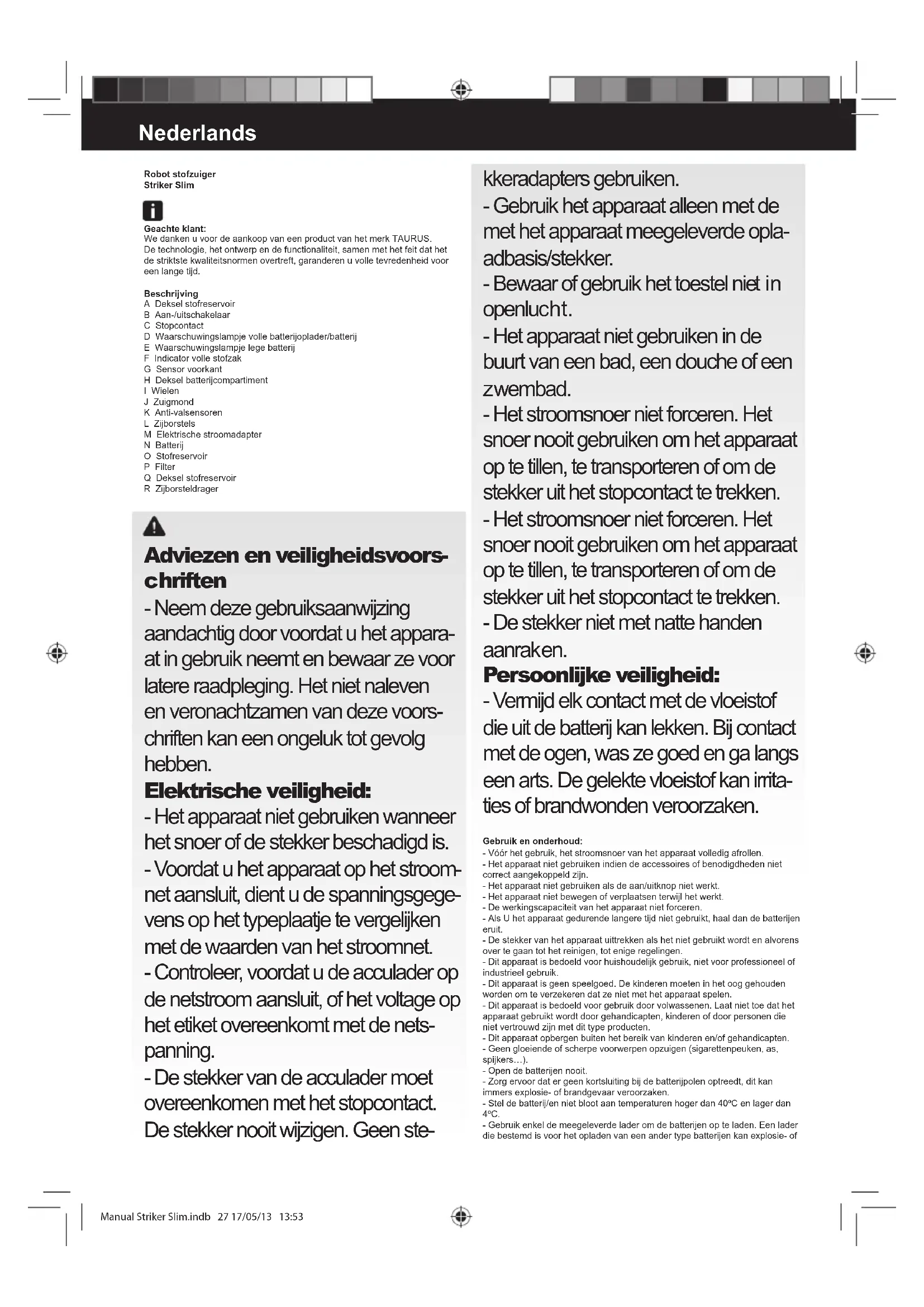 O aparelho desloca-se para trás depois de o colocar em funcionamento. O aparelho encontra-se numa superfície de cor escura (baixo reexo da luz contra o chão) Ajuste os dois sensores de altura na posição 2 ou 3. Manual Striker Slim.indb 25 17/05/13 13:53- Em caso de avaria contactar o atendimento ao cliente, cujo número de telefone está indicado na cha de garantia. Não tente desmontar ou reparar o aparelho, uma vez que existe perigo. - Se a ligação de rede estiver danicada, deve ser substituída e deve agir-se como em caso de avaria. Para produtos da União Europeia e/ou conforme os requisitos da regulamen- tação do seu país de origem: Ecologia e reciclabilidade do produto - Os materiais que constituem a embalagem deste aparelho estão integrados num sistema de recolha, classicação e reciclagem. Caso deseje desfazer-se deles, pode utilizar os contentores públicos apropriados para cada tipo de material. - O produto está isento de concentrações de substâncias que podem ser consideradas nocivas para o ambiente. Este símbolo signica que se desejar desfazer-se do produto depois de terminada a sua vida útil, deve entregá-lo através dos meios adequados ao cuidado de um gestor de resíduos autorizado para a recolha selectiva de Resíduos de Equipamentos Eléctricos e Electrónicos (REEE). Este símbolo signica que o produto pode conter pilhas ou baterias no seu interior, que devem ser retiradas antes de se desfazer do produto. Lembre-se que as pilhas/baterias devem ser depositadas em contentores especiais autorizados. e que nunca devem ser colocadas no fogo. Como retirar as baterias do interior do aparelho: ADVERTÊNCIA: é importante que as baterias estejam completamente desca- rregadas antes de as retirar do aparelho. Uma vez terminada a vida útil do aparelho, para retirar as baterias proce- der da seguinte forma: - Retirar a tampa do compartimento da(s) bateria(s). - Retirar a bateria do seu alojamento. - Fechar a tampa do compartimento da(s) bateria(s). Este aparelho cumpre com a Directiva 2006/95/EC de Baixa Tensão e com a Directiva 2004/108/EC de Compatibilidade Electromagnética. Manual Striker Slim.indb 26 17/05/13 13:53Robot stofzuiger Striker Slim Geachte klant: We danken u voor de aankoop van een product van het merk TAURUS. De technologie, het ontwerp en de functionaliteit, samen met het feit dat het de striktste kwaliteitsnormen overtreft, garanderen u volle tevredenheid voor een lange tijd. Beschrijving A Deksel stofreservoir B Aan-/uitschakelaar C Stopcontact D Waarschuwingslampje volle batterijoplader/batterij E Waarschuwingslampje lege batterij F Indicator volle stofzak G Sensor voorkant H Deksel batterijcompartiment I Wielen J Zuigmond K Anti-valsensoren L Zijborstels M Elektrische stroomadapter N Batterij O Stofreservoir P Filter Q Deksel stofreservoir R Zijborsteldrager Adviezen en veiligheidsvoors- chriften - Neem deze gebruiksaanwijzing aandachtig door voordat u het appara- at in gebruik neemt en bewaar ze voor latere raadpleging. Het niet naleven en veronachtzamen van deze voors- chriften kan een ongeluk tot gevolg hebben. Elektrische veiligheid: - Het apparaat niet gebruiken wanneer het snoer of de stekker beschadigd is. - Voordat u het apparaat op het stroom- net aansluit, dient u de spanningsgege- vens op het typeplaatje te vergelijken met de waarden van het stroomnet. - Controleer, voordat u de acculader op de netstroom aansluit, of het voltage op het etiket overeenkomt met de nets- panning. - De stekker van de acculader moet overeenkomen met het stopcontact. De stekker nooit wijzigen. Geen ste- kkeradapters gebruiken. - Gebruik het apparaat alleen met de met het apparaat meegeleverde opla- adbasis/stekker. - Bewaar of gebruik het toestel nie t in openlucht. - Het apparaat niet gebruiken in de buurt van een bad, een douche of een zwembad. - Het stroomsnoer niet forceren. Het snoer nooit gebruiken om het apparaat op te tillen, te transporteren of om de stekker uit het stopcontact te trekken. - Het stroomsnoer niet forceren. Het snoer nooit gebruiken om het apparaat op te tillen, te transporteren of om de stekker uit het stopcontact te trekken. - De stekker niet met natte handen aanraken. Persoonlijke veiligheid: - Vermijd elk contact met de vloeistof die uit de batterij kan lekken. Bij contact met de ogen, was ze goed en ga langs een arts. De gelekte vloeistof kan irrita- ties of brandwonden veroorzaken. Gebruik en onderhoud: - Vóór het gebruik, het stroomsnoer van het apparaat volledig afrollen. - Het apparaat niet gebruiken indien de accessoires of benodigdheden niet correct aangekoppeld zijn. - Het apparaat niet gebruiken als de aan/uitknop niet werkt. - Het apparaat niet bewegen of verplaatsen terwijl het werkt. - De werkingscapaciteit van het apparaat niet forceren. - Als U het apparaat gedurende langere tijd niet gebruikt, haal dan de batterijen eruit. - De stekker van het apparaat uittrekken als het niet gebruikt wordt en alvorens over te gaan tot het reinigen, tot enige regelingen. - Dit apparaat is bedoeld voor huishoudelijk gebruik, niet voor professioneel of industrieel gebruik. - Dit apparaat is geen speelgoed. De kinderen moeten in het oog gehouden worden om te verzekeren dat ze niet met het apparaat spelen. - Dit apparaat is bedoeld voor gebruik door volwassenen. Laat niet toe dat het apparaat gebruikt wordt door gehandicapten, kinderen of door personen die niet vertrouwd zijn met dit type producten. - Dit apparaat opbergen buiten het bereik van kinderen en/of gehandicapten. - Geen gloeiende of scherpe voorwerpen opzuigen (sigarettenpeuken, as, spijkers…). - Open de batterijen nooit. - Zorg ervoor dat er geen kortsluiting bij de batterijpolen optreedt, dit kan immers explosie- of brandgevaar veroorzaken. - Stel de batterij/en niet bloot aan temperaturen hoger dan 40ºC en lager dan 4ºC. - Gebruik enkel de meegeleverde lader om de batterijen op te laden. Een lader die bestemd is voor het opladen van een ander type batterijen ka