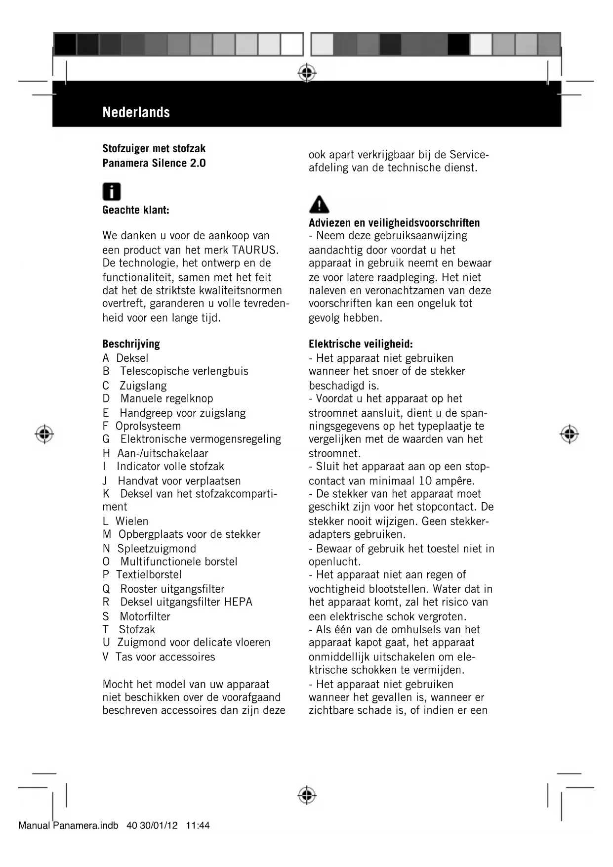 Download de handleiding voor uw Stofzuiger in PDF-formaat gratis! Vind uw handleiding Panamera Silence 2.0 - TAURUS en neem uw elektronisch apparaat weer in handen. Op deze pagina staan alle documenten die nodig zijn voor het gebruik van uw apparaat. Panamera Silence 2.0 van het merk TAURUS.