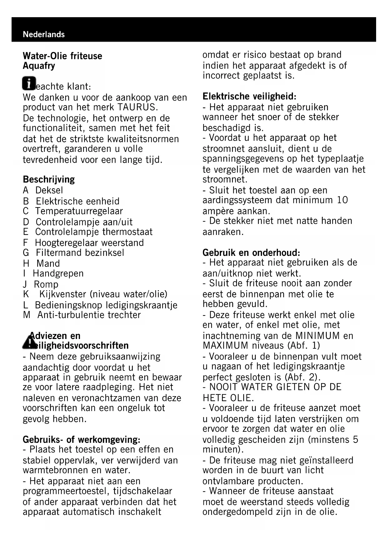 GESLOTEN DEKSEL. - Wanneer het baksel klaar is kan u de mand omhoog heffen en haar op de rand van de binnenpan hangen om ervoor te zorgen dat het baksel uitlekt en het teveel aan olie van het voedsel lekt (Abf. 9). - Leeg het frituurmandje. - Ververs de olie ongeveer elke 15 of 20 baksels, of elk 5-6 maanden indien u de friteuse niet regelmatig gebruikt. - Ververs het water elke 2 of 3 dagen indien u de friteuse regelmatig gebruikt. Indien u ze niet regelmatig gebruikt, giet dan het water weg en berg het apparaat op. Vul het opnieuw met water vooraleer u het apparaat terug gebruikt. - Het verversen van het water en de olie moet ALTIJD gebeuren WANNEER DE OLIE KOUD IS. - Vooraleer opnieuw te bakken, moet u minstens 5 minuten wachten nadat u de laatste vloeistof heeft toegevoegd om ervoor te zorgen dat olie en water volledig gescheiden zijn. Na het frituren: - Selecteer de minimumpositie (0) door middel van de thermostaatregelaar. - Haal de stekker van de friteuse uit het stopcontact. - Berg het aansluitsnoer op in de stekkerhouder (Abf.7) - Wanneer u het apparaat lange tijd niet gaat gebruiken, laat het dan eerst afkoelen en giet vervolgens het water weg (giet water weg tot er olie uit de evacuatieleiding begint te stromen). Praktische tips: - Voor etenswaren die veel water bevatten is het beter en sneller ze in twee keer in kleinere hoeveelheden dan in één keer te frituren. Hierdoor wordt de kans op spetten en overlopen ook voorkomen. - Om gelijkmatig gebakken en knapperig voedsel te bekomen, kunt u de “tweefasenmethode” toepassen. Dit systeem bestaat erin het voedsel een eerste keer te bakken tot het bijna klaar is, en daarna nogmaals, met flink hete olie, om het een goudbruine kleur te geven. - Het is raadzaam te bakken met olijfolie met een laag zuurgehalte. - Meng geen olie van verschillende kwaliteit. - Was de aardappelen vóór het bakken om te vermijden dat ze aan elkaar gaan plakken. Reiniging - Trek de stekker van het apparaat uit en laat het afkoelen alvorens het tereinigen. - Verwijder de mand en de elektrische eenheid. Om de elektrische eenheid uit haar houder te halen moet u aan de hoogteregelaar van de weerstand draaien (Abf.8) tot het geheel uit de rail van de houder komt. - Verwijder de filtermand voor het bezinksel. - Open de kraan (L) om het water in een recipiënt te gieten en vervolgens de olie in een ander (niet in de gootsteen). en volg de regels voor afvalverwijdering en verwerking. - Maak het apparaat schoon met een vochtige doek met een paar druppels afwasmiddel en maak het apparaat daarna goed droog. - Gebruik geen oplosmiddelen of producten met een zure of basisch ph, zoals bleekwater, noch schuurmiddelen, om het apparaat schoon te maken. - Dompel het apparaat niet onder in water of een andere vloeistof en houd het niet onder de kraan. Defecten en reparatie - Bij een defect, moet u het apparaat naar een erkende technische dienst brengen. Probeer het apparaat niet zelf te demonteren of te repareren, want dit kan gevaarlijk zijn. - Als de elektriciteitsaansluiting beschadigd is, moet deze vervangen worden zoals bij een defect. Milieuvriendelijkheid en recycleerbaarheid van het product - De verpakking van dit apparaat bestaat uit gerecycleerd materiaal. Als u zich van dit materiaal wenst te ontdoen, kunt u gebruik maken van de openbare containers die voor ieder type materiaal geschikt zijn. - Het product bevat geen concentraties materialen die schadelijk zijn voor het milieu. Dit apparaat voldoet aan de Laagspanningsrichtlijn 2006/95/EG en de richtlijn 2004/108/EG inzake elektromagnetische compatibiliteit. - Dit symbool betekent dat indien u zich van dit product wilt ontdoen als het eenmaal versleten is, het product naar een erkende afvalverwerker dient te brengen die voor de selectieve ophaling van Afgedankte Elektrische en Elektronische Apparatuur (AEEA).Ελληνικά Φριτέζα Νερού-Λαδιού Aquafry Εκλεκτέ μας πελάτη: Σε ευχαριστούμε που αποφάσισες την αγορά μιας ηλεκτρικής οικιακής συσκευής της μάρκας TAURUS. Με την τεχνολογία, το σχέδιο και τη λειτουργικότητά της, μαζί με το γεγονός ότι ξεπερνά τις αυστηρότερες προδιαγραφές ποιότητας θα μείνεις απόλυτα ικανοποιημένος για πολύ