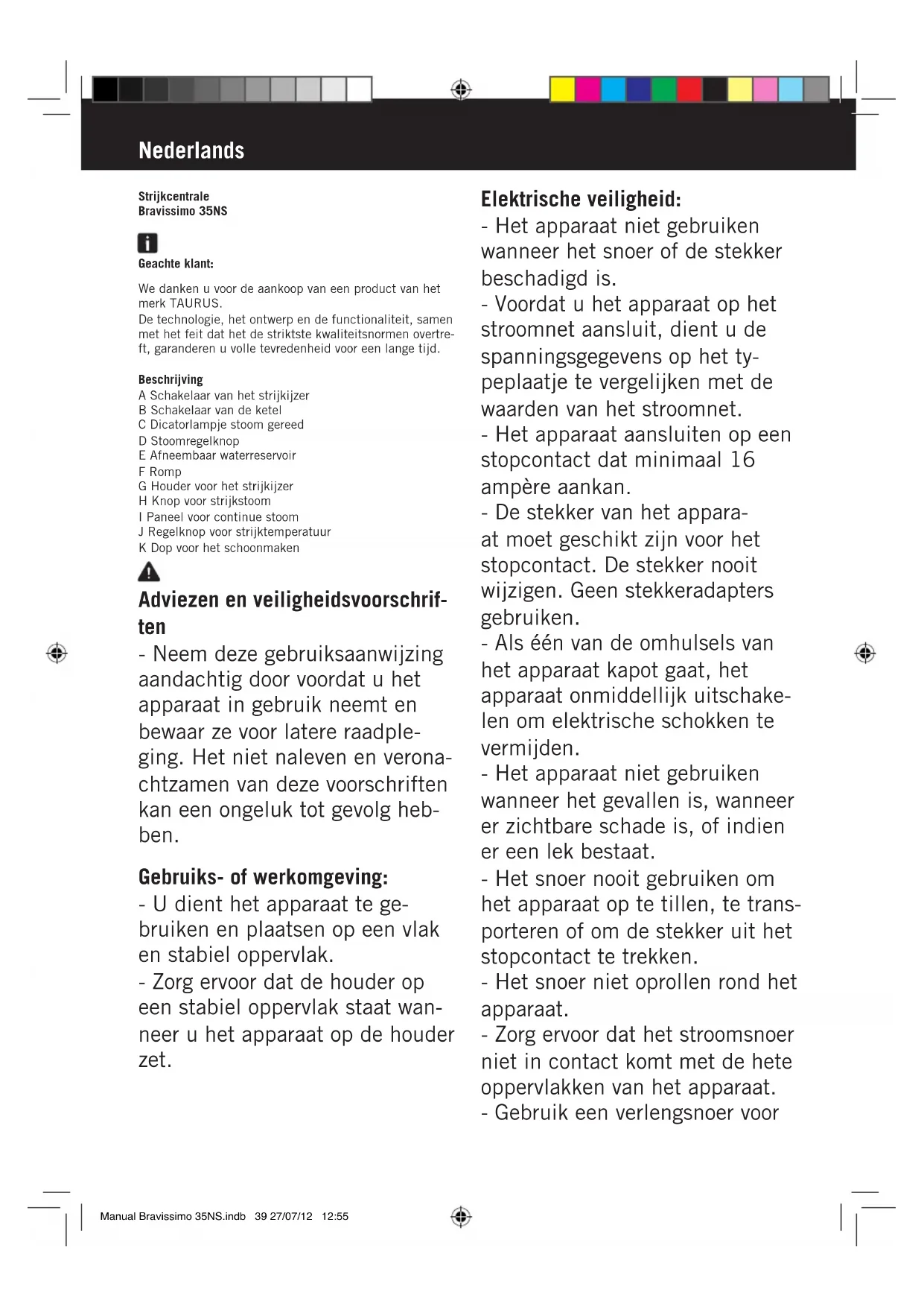 Saída de água pelos orifícios da base do ferro ao apertar o botão do vapor (H). O regulador da temperatura do ferro (J) encontra-se no mínimo. Caldeira demasiado cheia. Caldeira na posição inclinada. Girar o comando do termóstato até à zona de vapor. Retirar água. Colocar o aparelho numa base horizontal. Saída de partículas e impurezas de cal pela base do ferro. Acumulação excessiva de cal na caldeira. Limpar o aparelho. Ver a secção “limpeza”. Saída de vapor pela tampa de limpe- za (K) da caldeira. Tampa de limpeza da caldeira mal enroscada. Deixar a caldeira arrefecer e voltar a enroscar a tampa K até ao fim. Ao apertar o botão de vapor (H) o vapor não sai. Caldeira vazia. Interruptores (A) e (B) na posição 0. Encher o depósito de água. Ver a secção “enchimento de água”. Accionar os interruptores para a posição ligada Portugue¦és.indd 37 31/07/2012 11:48:35Ouvem-se pequenos ruídos no interior do aparelho ao ligar o interruptor da caldeira. Ficaram vestígios de vapor da últi- ma vez que o ferro foi utilizado. O aparelho está frio (os ruídos devem-se à dilatação da caldeira). A caldeira está vazia e necessita de água Apertar o botão do vapor (H) para deixar sair a pressão. Este fenómeno é normal. Após alguns minutos deixará de ouvir os ruídos. É normal e desaparecerá ao acrescentar-se água. Para produtos da União Europeia e/ou conforme os requi- sitos da regulamentação do seu país de origem: Ecologia e reciclabilidade do produto - Os materiais que constituem a embalagem deste aparel- ho estão integrados num sistema de recolha, classificação e reciclagem. Caso deseje desfazer-se deles, pode utilizar os contentores públicos apropriados para cada tipo de material. - O produto está isento de concentrações de substâncias que podem ser consideradas nocivas para o ambiente. Este símbolo significa que se desejar desfazer-se do produto depois de terminada a sua vida útil, deve entregá-lo através dos meios adequados ao cuidado de um gestor de resíduos autorizado para a recolha selectiva de Resíduos de Equipamentos Eléctricos e Electrónicos (REEE). Este aparelho cumpre com a Directiva 2006/95/EC de Baixa Tensão e com a Directiva 2004/108/EC de Compa- tibilidade Electromagnética. Manual Bravissimo 35NS.indb 38 27/07/12 12:55Nederlands Strijkcentrale Bravissimo 35NS Geachte klant: We danken u voor de aankoop van een product van het merk TAURUS. De technologie, het ontwerp en de functionaliteit, samen met het feit dat het de striktste kwaliteitsnormen overtre- ft, garanderen u volle tevredenheid voor een lange tijd. Beschrijving A Schakelaar van het strijkijzer B Schakelaar van de ketel C Dicatorlampje stoom gereed D Stoomregelknop E Afneembaar waterreservoir F Romp G Houder voor het strijkijzer H Knop voor strijkstoom I Paneel voor continue stoom J Regelknop voor strijktemperatuur K Dop voor het schoonmaken Adviezen en veiligheidsvoorschrif- ten - Neem deze gebruiksaanwijzing aandachtig door voordat u het apparaat in gebruik neemt en bewaar ze voor latere raadple- ging. Het niet naleven en verona- chtzamen van deze voorschriften kan een ongeluk tot gevolg heb- ben. Gebruiks- of werkomgeving: - U dient het apparaat te ge- bruiken en plaatsen op een vlak en stabiel oppervlak. - Zorg ervoor dat de houder op een stabiel oppervlak staat wan- neer u het apparaat op de houder zet. Elektrische veiligheid: - Het apparaat niet gebruiken wanneer het snoer of de stekker beschadigd is. - Voordat u het apparaat op het stroomnet aansluit, dient u de spanningsgegevens op het ty- peplaatje te vergelijken met de waarden van het stroomnet. - Het apparaat aansluiten op een stopcontact dat minimaal 16 ampère aankan. - De stekker van het appara- at moet geschikt zijn voor het stopcontact. De stekker nooit wijzigen. Geen stekkeradapters gebruiken. - Als één van de omhulsels van het apparaat kapot gaat, het apparaat onmiddellijk uitschake- len om elektrische schokken te vermijden. - Het apparaat niet gebruiken wanneer het gevallen is, wanneer er zichtbare schade is, of indien er een lek bestaat. - Het snoer nooit gebruiken om het apparaat op te tillen, te trans- porteren of om de stekker uit het stopcontact te trekken. - Het snoer niet oprollen rond het apparaat. - Zorg ervoor dat het stroomsnoer niet in contact komt met de hete oppervlakken van het apparaat. - Gebruik een verlengsnoer voor Manual Bravissimo 35NS.indb 39 27/07/12 12:55buiten als u het apparaat buiten- shuis gebruikt. - De stekker niet met natte han- den aanraken. Persoonlijke veiligheid: - Gebruik het apparaat niet op hittegevoelige personenen. (Het apparaat heeft verhitte opper- vlakken). - Raak de verhitte delen van het toestel niet aan, aangezien ze ernstige brandwonden kunnen veroorzaken. Gebruik en onderhoud: - Vóór het gebruik, het strooms- noer van het apparaat volledig afrollen. - Het apparaat niet gebruiken als de aan/uitknop niet werkt. - Gebruik het apparaat niet scheef en houdt het niet onders- teboven. - Het apparaat niet omdraaien terwijl het in gebruik is of aan- gesloten is op het stroomnet. - Respecteer de MAX en MIN niveau-aanduiding (Abf. 1) - De stekker van het apparaat uittrekken als het niet gebruikt wordt en alvorens over te gaan tot het reinigen, tot enige regelingen. - Dit apparaat is bedoeld voor huishoudelijk gebruik, niet voor professioneel of industrieel ge- bruik. - Dit toestel mag, onder toezicht, door onervaren personen, perso- nen met een beperking of kinde- ren vanaf 8 jaar gebruikt worden mits zij de nodige informatie hebben gekregen om het toestel op een veilige manier te kunnen gebruiken en de gevaren kennen. - Het schoonmaken en het onder- houd van het toestel door kinde- ren moet steeds onder toezicht van een volwassene gebeuren. - Houd het toestel en de net- werkverbinding steeds buiten het bereik van kinderen jonger dan 8 jaar. - De kinderen moeten in het oog gehouden worden om te verzeke- ren dat ze niet met het apparaat spelen. -