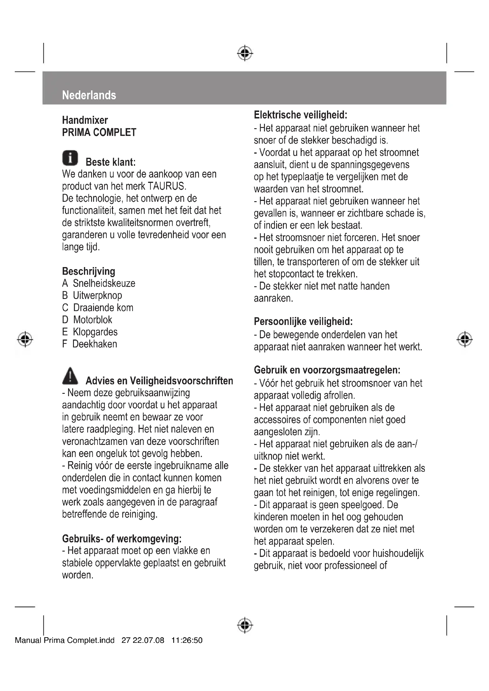 GEBRUIKSAANWIJZING Prima Complet TAURUS