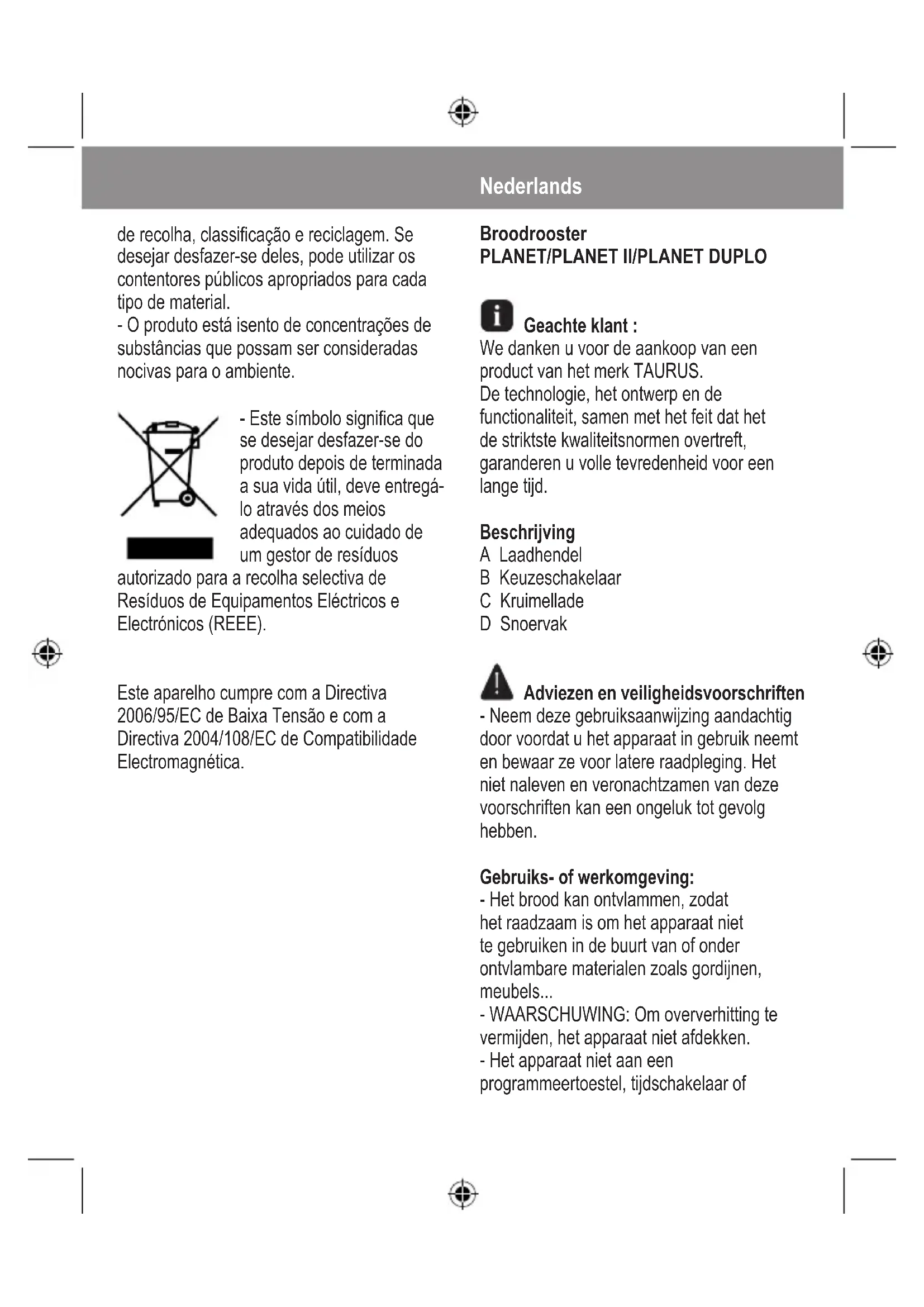 Geachte klant : We danken u voor de aankoop van een product van het merk TAURUS. De technologie, het ontwerp en de functionaliteit, samen met het feit dat het de striktste kwaliteitsnormen overtreft, garanderen u volle tevredenheid voor een lange tijd. Beschrijving A Laadhendel B Keuzeschakelaar C Kruimellade D Snoervak Adviezen en veiligheidsvoorschriften - Neem deze gebruiksaanwijzing aandachtig door voordat u het apparaat in gebruik neemt en bewaar ze voor latere raadpleging. Het niet naleven en veronachtzamen van deze voorschriften kan een ongeluk tot gevolg hebben. Gebruiks- of werkomgeving: - Het brood kan ontvlammen, zodat het raadzaam is om het apparaat niet te gebruiken in de buurt van of onder ontvlambare materialen zoals gordijnen, meubels... - WAARSCHUWING: Om oververhitting te vermijden, het apparaat niet afdekken. - Het apparaat niet aan een programmeertoestel, tijdschakelaar ofander apparaat verbinden dat het apparaat automatisch inschakelt omdat er risico bestaat op brand indien het apparaat afgedekt is of incorrect geplaatst is. Elektrische veiligheid: - Het apparaat niet gebruiken wanneer het snoer of de stekker beschadigd is. - Voordat u het apparaat op het stroomnet aansluit, dient u de spanningsgegevens op het typeplaatje te vergelijken met de waarden van het stroomnet. - Sluit het apparaat aan op een geaard stopcontact van minimum 10 Ampère. - De stekker van het apparaat moet geschikt zijn voor het stopcontact. De stekker nooit wijzigen. Geen stekkeradapters gebruiken. - Bewaar of gebruik het toestel niet in openlucht. - Het apparaat niet gebruiken wanneer het gevallen is, wanneer er zichtbare schade is, of indien er een lek bestaat. - Het stroomsnoer niet forceren. Het snoer nooit gebruiken om het apparaat op te tillen, te transporteren of om de stekker uit het stopcontact te trekken. - Het snoer niet oprollen rond het apparaat. - Let erop dat het snoer niet in contact komt met de warme oppervlakken van het apparaat. - De stekker niet met natte handen aanraken. Persoonlijke veiligheid: - De toegankelijke oppervlakken van het apparaat kunnen erg heet zijn wanneer het apparaat in werking is. Gebruik en voorzorgsmaatregelen: - Vóór het gebruik, het stroomsnoer van het apparaat volledig afrollen. - Het apparaat niet gebruiken als de aan/ uitknop niet werkt. - Het apparaat niet bewegen of verplaatsen terwijl het werkt. - Het apparaat niet omdraaien terwijl het in gebruik is of aangesloten is op het stroomnet. - Trek de stekker van het toestel uit het stopcontact wanneer u het niet gebruikt en vóór de reiniging en het onderhoud. - Dit apparaat is bedoeld voor huishoudelijk gebruik, niet voor professioneel of industrieel gebruik. - Dit apparaat is bedoeld voor gebruik door volwassenen. Laat niet toe dat het apparaat gebruikt wordt door gehandicapten, kinderen of door personen die niet vertrouwd zijn met dit type producten. - Dit apparaat opbergen buiten het bereik van kinderen en/of gehandicapten. - Dit apparaat is geen speelgoed. De kinderen moeten in het oog gehouden worden om te verzekeren dat ze niet met het apparaat spelen. - Het apparaat niet opbergen als het nog warm is. - Een onjuist gebruik, of een gebruik dat niet overeenstemt met de gebruiksaanwijzing, kan gevaar inhouden en doet de garantie en de aansprakelijkheid van de fabrikant teniet. Gebruiksaanwijzing Tips vóór het gebruik: - Bij het eerste gebruik van het product is het raadzaam om het apparaat eerst zonderbrood te laten werken. Gebruik: - Steek de stekker van het toestel in het stopcontact. - Steek het/de sneetje(s) brood in het apparaat. - Stel met de keuzeschakelaar de gewenste toastgraad in. - Zet het apparaat aan door de laadknop naar beneden te schuiven tot u een “klik” hoort. - Het/de sneetje(s) brood zal/zullen automatisch gecentreerd worden voor een uniform toastresultaat. - Om de productie van acrylzuuramide tijdens het toastproces te minimaliseren dient U het brood niet donkerbruin of zwart te laten worden. - Als de ingestelde toasttijd verstreken is, zal het apparaat automatisch uitschakelen. Opheffunctie: - De opheffunctie geeft U de mogelijkheid om de werking van het apparaat te onderbreken; om dit te doen, drukt U op de daarvoor bestemde knop. Als u klaar bent met het gebruik van het apparaat: - Trek de stekker uit het stopcontact. - Berg het snoer op in het snoervak. - Maak het apparaat schoon. Snoervak - Dit apparaat beschikt over een opbergvak voor de elektriciteitskabel aan de onderkant van het apparaat. Reiniging - Trek de stekker van het apparaat uit en laat het afkoelen alvorens het te reinigen. - Maak het apparaat schoon met een vochtige doek met een paar druppels afwasmiddel en maak het apparaat daarna goed droog. - Gebruik geen oplosmiddelen of schuurmiddelen, noch producten met een zure of basisch pH, zoals bleekwater, om het apparaat schoon te maken. - Het apparaat niet onderdompelen in water of om het even welke andere vloeistof en het ook niet onder de kraan houden. - Het is raadzaam om het apparaat geregeld schoon te maken en om alle voedselresten te verwijderen. Kruimellade: - Het apparaat beschikt over een kruimellade waarin de kruimels opgevangen worden die anders binnenin het apparaat zouden verbranden. - Trek de lade uit het apparaat - Maak de kruimellade leeg. - Schud zachtjes met het apparaat om de laatste restjes brood binnenin het apparaat te verwijderen. - Breng de kruimellade terug op haar plaats aan. Defecten en reparatie - Bij een defect, moet u het apparaat naar een erkende technische dienst brengen. Probeer het apparaat niet zelf te demonteren of te repareren, want dit kan gevaarlijk zijn. - Als de elektriciteitsaansluiting beschadigd is, moet deze vervangen worden zoals bijeen defect. Milieuvriendelijkheid en recycleerbaarheid van het product - De verpakkingsmaterialen van dit apparaat zijn geintegreerd in een systeem van ophalen, sorteren en hergebruik van de materialen. Indien U de materialen kwijt wilt, kunt U hiervoor de geschikte publieke con