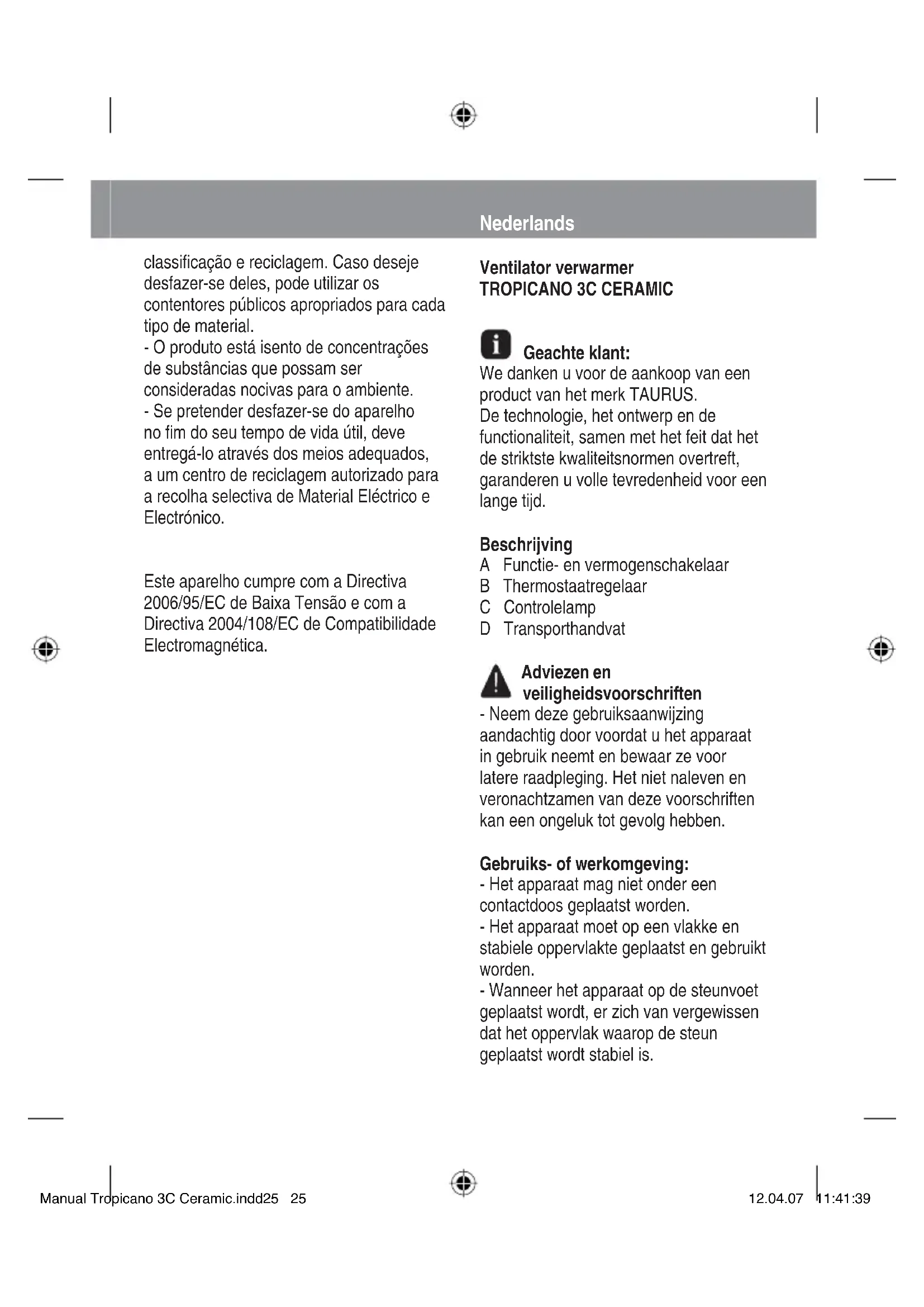 Geachte klant: We danken u voor de aankoop van een product van het merk TAURUS. De technologie, het ontwerp en de functionaliteit, samen met het feit dat het de striktste kwaliteitsnormen overtreft, garanderen u volle tevredenheid voor een lange tijd. Beschrijving A Functie- en vermogenschakelaar B Thermostaatregelaar C Controlelamp D Transporthandvat Adviezen en veiligheidsvoorschriften - Neem deze gebruiksaanwijzing aandachtig door voordat u het apparaat in gebruik neemt en bewaar ze voor latere raadpleging. Het niet naleven en veronachtzamen van deze voorschriften kan een ongeluk tot gevolg hebben. Gebruiks- of werkomgeving: - Het apparaat mag niet onder een contactdoos geplaatst worden. - Het apparaat moet op een vlakke en stabiele oppervlakte geplaatst en gebruikt worden. - Wanneer het apparaat op de steunvoet geplaatst wordt, er zich van vergewissen dat het oppervlak waarop de steun geplaatst wordt stabiel is. Manual Tropicano 3C Ceramic.indd25 25Manual Tropicano 3C Ceramic.indd25 25 12.04.07 11:41:3912.04.07 11:41:39- Het apparaat niet aan een programmeertoestel, tijdschakelaar of ander apparaat verbinden dat het apparaat automatisch inschakelt omdat er risico bestaat op brand indien het apparaat afgedekt is of incorrect geplaatst is. - WAARSCHUWING: Om oververhitting te vermijden, het apparaat niet afdekken. Elektrische veiligheid: - Het apparaat niet gebruiken wanneer het snoer of de stekker beschadigd is. - Voordat u het apparaat op het stroomnet aansluit, dient u de spanningsgegevens op het typeplaatje te vergelijken met de waarden van het stroomnet. - Het apparaat aansluiten op een stopcontact dat minimaal 10 Ampère aankan. - De stekker van het apparaat moet geschikt zijn voor het stopcontact. De stekker nooit wijzigen. Geen stekkeradapters gebruiken. - Bewaar of gebruik het toestel niet in openlucht. - Het apparaat niet gebruiken in de buurt van een bad, een douche of een zwembad. - Het stroomsnoer niet forceren. Het snoer nooit gebruiken om het apparaat op te tillen, te transporteren of om de stekker uit het stopcontact te trekken. - De staat van het stroomsnoer controleren. Beschadigde snoeren of snoeren die in de war geraakt zijn, verhogen het risico van een elektrische schok. - De stekker niet met natte handen aanraken. Gebruik en voorzorgsmaatregelen: - Vóór het gebruik, het stroomsnoer van het apparaat volledig afrollen. - Het apparaat niet gebruiken als de aan/ uitknop niet werkt. - Trek de stekker van het toestel uit het stopcontact wanneer u het niet gebruikt en voordat u het begint te reinigen of overgaat tot het onderhoud ervan. - Dit apparaat is bedoeld voor huishoudelijk gebruik, niet voor professioneel of industrieel gebruik. - Dit apparaat is bedoeld voor gebruik door volwassenen. Laat niet toe dat het apparaat gebruikt wordt door gehandicapten, kinderen of door personen die niet vertrouwd zijn met dit type producten. - Dit apparaat opbergen buiten het bereik van kinderen en/of gehandicapten. - Controleer of het ventilatierooster van het apparaat niet verstopt is door stof, vuil of andere voorwerpen. - Het instellen van de thermostaatregelaar op de minimumstand (MIN), garandeert geen permanente uitschakeling van het apparaat. - Een onjuist gebruik, of een gebruik dat niet overeenstemt met de gebruiksaanwijzing, kan gevaar inhouden en doet de garantie en de aansprakelijkheid van de fabrikant teniet. Gebruiksaanwijzing - Alvorens het apparaat aan te sluiten, het stroomsnoer volledig afrollen. - Steek de stekker van het toestel in het stopcontact. Manual Tropicano 3C Ceramic.indd26 26Manual Tropicano 3C Ceramic.indd26 26 12.04.07 11:41:4012.04.07 11:41:40- Het apparaat in werking stellen door middel van de keuzeschakelaar voor functies en vermogen. - De thermostaatregelaar naar de positie draaien die overeenkomt met de gewenste temperatuur. Ventilatorfunctie: - De ventilatorstand selecteren. - Selecteer de gewenste ventilatiestand. - Controleer of de thermostaatregelaar op het maximum staat. Verwarmingsfunctie: - De verwarmingsstand selecteren. - Het gewenste verwarmingsvermogen selecteren. - Controleer of de thermostaatregelaar op de gewenste temperatuur staat. Als u klaar bent met het gebruik van het apparaat: - De minimumpositie (MIN) selecteren door middel van de keuzeschakelaar voor de snelheidsregeling. -Het apparaat stoppen door de vermogensschakelaar op 0 in te stellen. - Trek de stekker uit het stopcontact. Transporthandvat: - Dit apparaat beschikt over een handvat bovenaan om het vlot en gemakkelijk te kunnen dragen. Thermische veiligheidsvoorziening: - Het apparaat beschikt over een thermische veiligheidsvoorziening die het apparaat beschermt tegen oververhitting. - Indien het apparaat afwisselend in- en uitschakelt zonder dat dit het gevolg is van de omgevingsthermostaat, ga dan na of er geen obstakel is dat de normale in- en uitgang van de lucht verhindert. - Wanneer het apparaat spontaan uitschakelt en niet terug inschakelt, trek de stekker dan uit het stopcontact en wacht 15 minuten alvorens de stekker terug in te steken. Indien het apparaat dan nog steeds niet werkt, begeef u dan naar één van de bevoegde technische diensten. Reiniging - Trek de stekker van het apparaat uit en laat het afkoelen alvorens het te reinigen. - Maak het apparaat schoon met een vochtige doek met een paar druppels afwasmiddel en maak het apparaat daarna goed droog. - Gebruik geen oplosmiddelen of producten met een zure of basisch ph, zoals bleekwater, noch schuurmiddelen, om het apparaat schoon te maken. - Dompel het apparaat niet onder in water of een andere vloeistof en houd het niet onder de kraan. Defecten en reparatie - Bij een defect, moet u het apparaat naar een erkende technische dienst brengen. Probeer het apparaat niet zelf te demonteren of te repareren, want dit kan gevaarlijk zijn. - Als de elektriciteitsaansluiting beschadigd is, moet deze vervangen worden zoals bij een defect. Manual Tropicano 3C Ceramic.indd27 27Manual Tropicano 3C Ceramic.indd27 27 12.