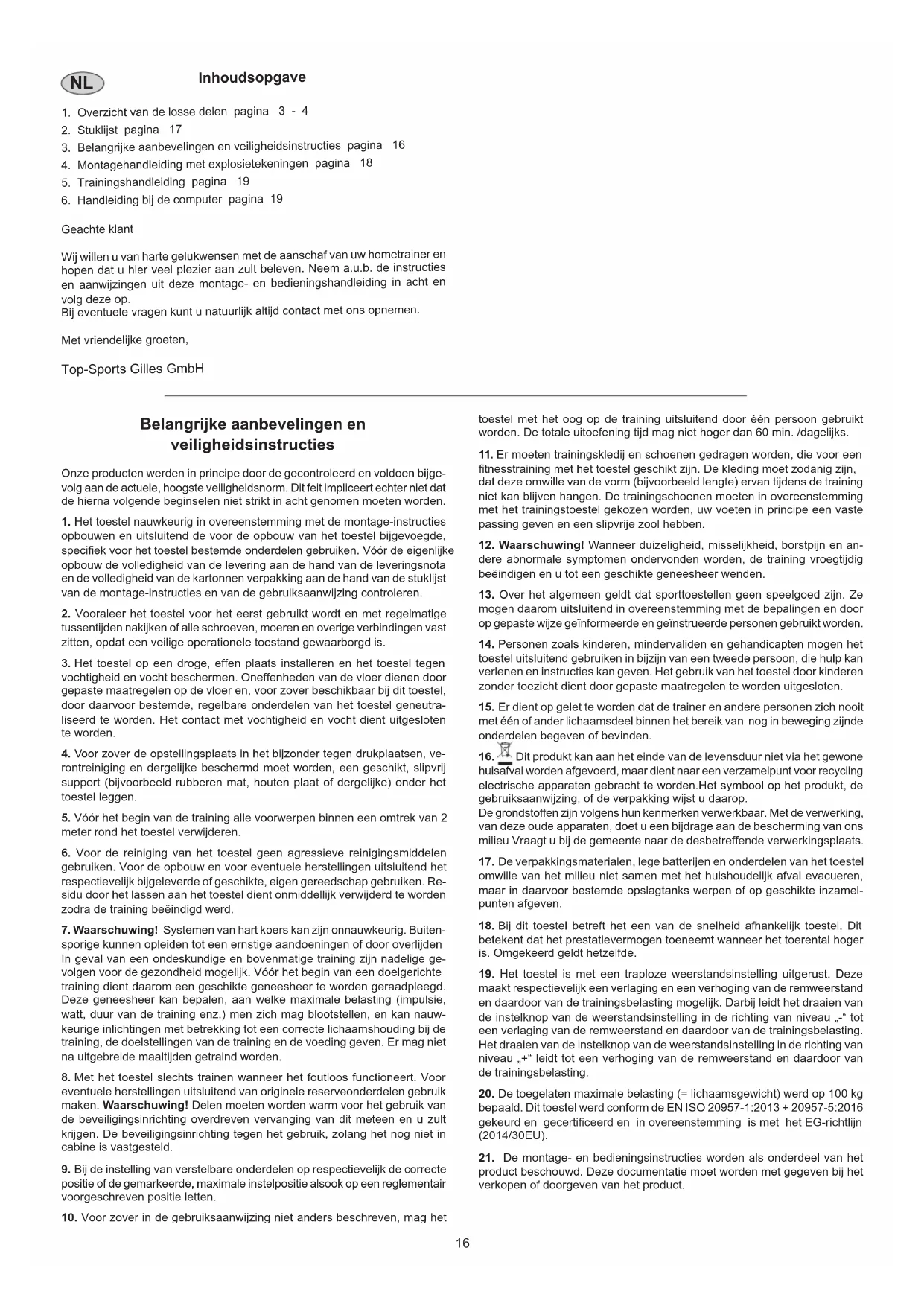 dere abnormale symptomen ondervonden worden, de training vroegtijdig beëindigen en u tot een geschikte geneesheer wenden.13. Over het algemeen geldt dat sporttoestellen geen speelgoed zijn. Ze mogen daarom uitsluitend in overeenstemming met de bepalingen en door op gepaste wijze geïnformeerde en geïnstrueerde personen gebruikt worden. 14. Personen zoals kinderen, mindervaliden en gehandicapten mogen het toestel uitsluitend gebruiken in bijzijn van een tweede persoon, die hulp kan verlenen en instructies kan geven. Het gebruik van het toestel door kinderen zonder toezicht dient door gepaste maatregelen te worden uitgesloten.15. Er dient op gelet te worden dat de trainer en andere personen zich nooit met één of ander lichaamsdeel binnen het bereik van nog in beweging zijnde onderdelen begeven of bevinden.16. Dit produkt kan aan het einde van de levensduur niet via het gewone huisafval worden afgevoerd, maar dient naar een verzamelpunt voor recycling electrische apparaten gebracht te worden.Het symbool op het produkt, de gebruiksaanwijzing, of de verpakking wijst u daarop.De grondstoffen zijn volgens hun kenmerken verwerkbaar. Met de verwerking, van deze oude apparaten, doet u een bijdrage aan de bescherming van ons milieu Vraagt u bij de gemeente naar de desbetreffende verwerkingsplaats.17. De verpakkingsmaterialen, lege batterijen en onderdelen van het toestel omwille van het milieu niet samen met het huishoudelijk afval evacueren, maar in daarvoor bestemde opslagtanks werpen of op geschikte inzamel-punten afgeven.18. Bij dit toestel betreft het een van de snelheid afhankelijk toestel. Dit betekent dat het prestatievermogen toeneemt wanneer het toerental hoger is. Omgekeerd geldt hetzelfde.19. Het toestel is met een traploze weerstandsinstelling uitgerust. Deze maakt respectievelijk een verlaging en een verhoging van de remweerstand en daardoor van de trainingsbelasting mogelijk. Darbij leidt het draaien van de instelknop van de weerstandsinstelling in de richting van niveau „-“ tot een verlaging van de remweerstand en daardoor van de trainingsbelasting. Het draaien van de instelknop van de weerstandsinstelling in de richting van niveau „+“ leidt tot een verhoging van de remweerstand en daardoor van de trainingsbelasting.20. De toegelaten maximale belasting (= lichaamsgewicht) werd op 100 kg bepaald. Dit toestel werd conform de EN ISO 20957-1:2013 + 20957-5:2016 gekeurd en gecerticeerd en in overeenstemming is met het EG-richtlijn (2014/30EU).21. De montage- en bedieningsinstructies worden als onderdeel van het product beschouwd. Deze documentatie moet worden met gegeven bij het verkopen of doorgeven van het product.