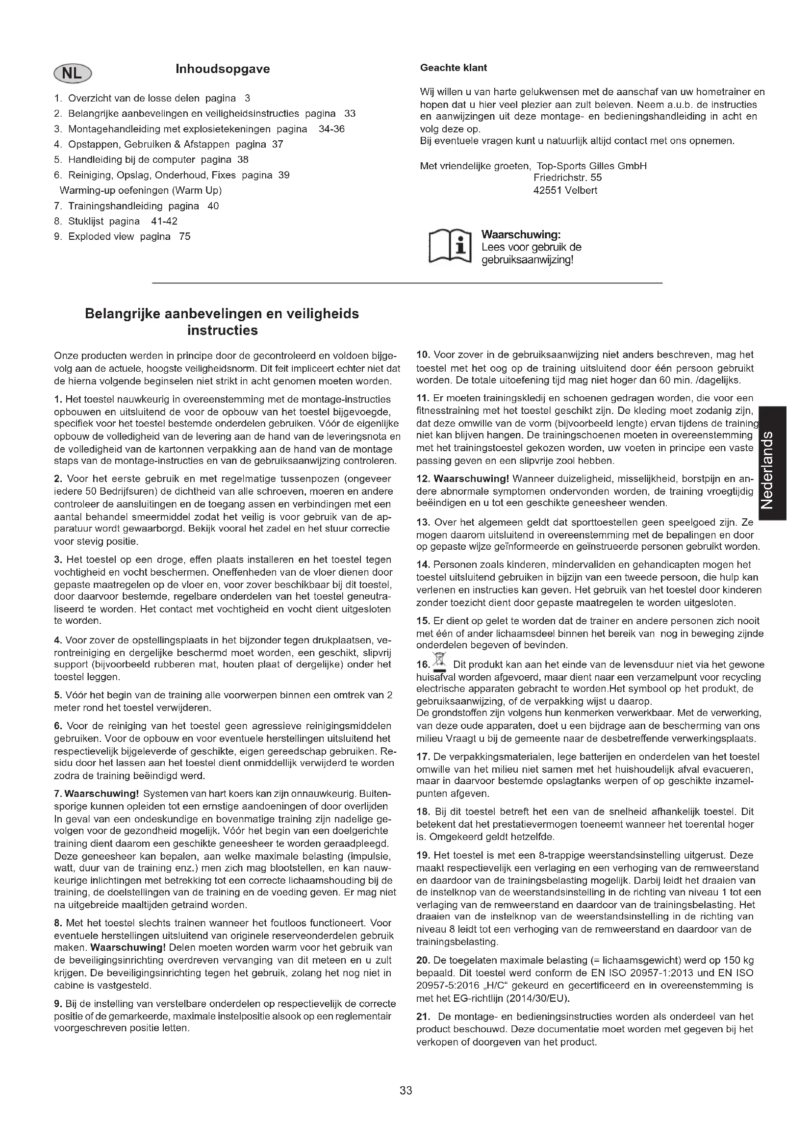 product beschouwd. Deze documentatie moet worden met gegeven bij het verkopen of doorgeven van het product. Geachte klant Wij willen u van harte gelukwensen met de aanschaf van uw hometrainer en hopen dat u hier veel plezier aan zult beleven. Neem a.u.b. de instructies en aanwijzingen uit deze montage- en bedieningshandleiding in acht en volg deze op. Bij eventuele vragen kunt u natuurlijk altijd contact met ons opnemen. Met vriendelijke groeten, Top-Sports Gilles GmbH Friedrichstr. 55 42551 Velbert Nederlands Waarschuwing: Lees voor gebruik de gebruiksaanwijzing!34 Montagehandleiding Neem alle losse onderdelen uit de verpakking, leg deze op de grond en bruto controleer aan de hand van de montageen staps of alle onderdelen aanwezig zijn. Hierbij moet er op worden gelet dat een aantal onderdelen rechtstreeks met het onderstel zijn verbonden en voorgemonteerd zijn. Bovendien zijn enkele andere losse delen ook al tot eenheden samengevoegd. Hierdoor kunt het apparaat gemakkelijker en sneller monteren. Montage tijd: 30 - 40 min. Stap 1: Montage van de voorste en van de achterste voet (20+27)