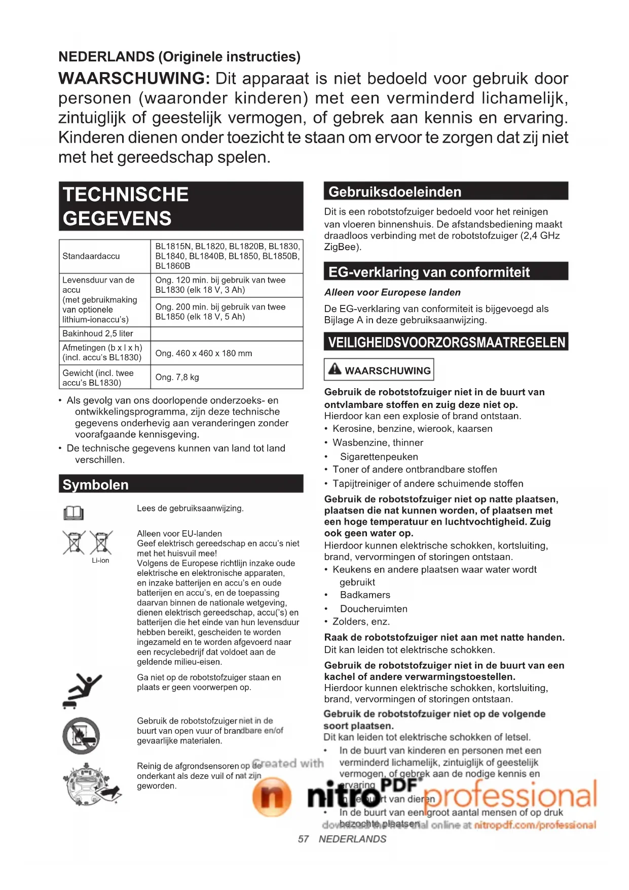 - De technische gegevens kunnen van land tot land verschillen. Symbolen Lees de gebruiksaanwijzing. Li-ion Alleen voor EU-landen Geef elektrisch gereedschap en accu’s niet met het huisvuil mee! Volgens de Europese richtlijn inzake oude elektrische en elektronische apparaten, en inzake batterijen en accu’s en oude batterijen en accu’s, en de toepassing daarvan binnen de nationale wetgeving, dienen elektrisch gereedschap, accu(’s) en batterijen die het einde van hun levensduur hebben bereikt, gescheiden te worden ingezameld en te worden afgevoerd naar een recyclebedrijf dat voldoet aan de geldende milieu-eisen. Ga niet op de robotstofzuiger staan en plaats er geen voorwerpen op. Gebruik de robotstofzuiger niet in de buurt van open vuur of brandbare en/of gevaarlijke materialen. Reinig de afgrondsensoren op de onderkant als deze vuil of nat zijn geworden. NEDERLANDS (Originele instructies) WAARSCHUWING: Dit apparaat is niet bedoeld voor gebruik door personen (waaronder kinderen) met een verminderd lichamelijk, zintuiglijk of geestelijk vermogen, of gebrek aan kennis en ervaring. Kinderen dienen onder toezicht te staan om ervoor te zorgen dat zij niet met het gereedschap spelen. Gebruiksdoeleinden Dit is een robotstofzuiger bedoeld voor het reinigen van vloeren binnenshuis. De afstandsbediening maakt draadloos verbinding met de robotstofzuiger (2,4 GHz ZigBee). EG-verklaring van conformiteit Alleen voor Europese landen De EG-verklaring van conformiteit is bijgevoegd als Bijlage A in deze gebruiksaanwijzing. VEILIGHEIDSVOORZORGSMAATREGELEN WAARSCHUWING Gebruik de robotstofzuiger niet in de buurt van ontvlambare stoffen en zuig deze niet op. Hierdoor kan een explosie of brand ontstaan.