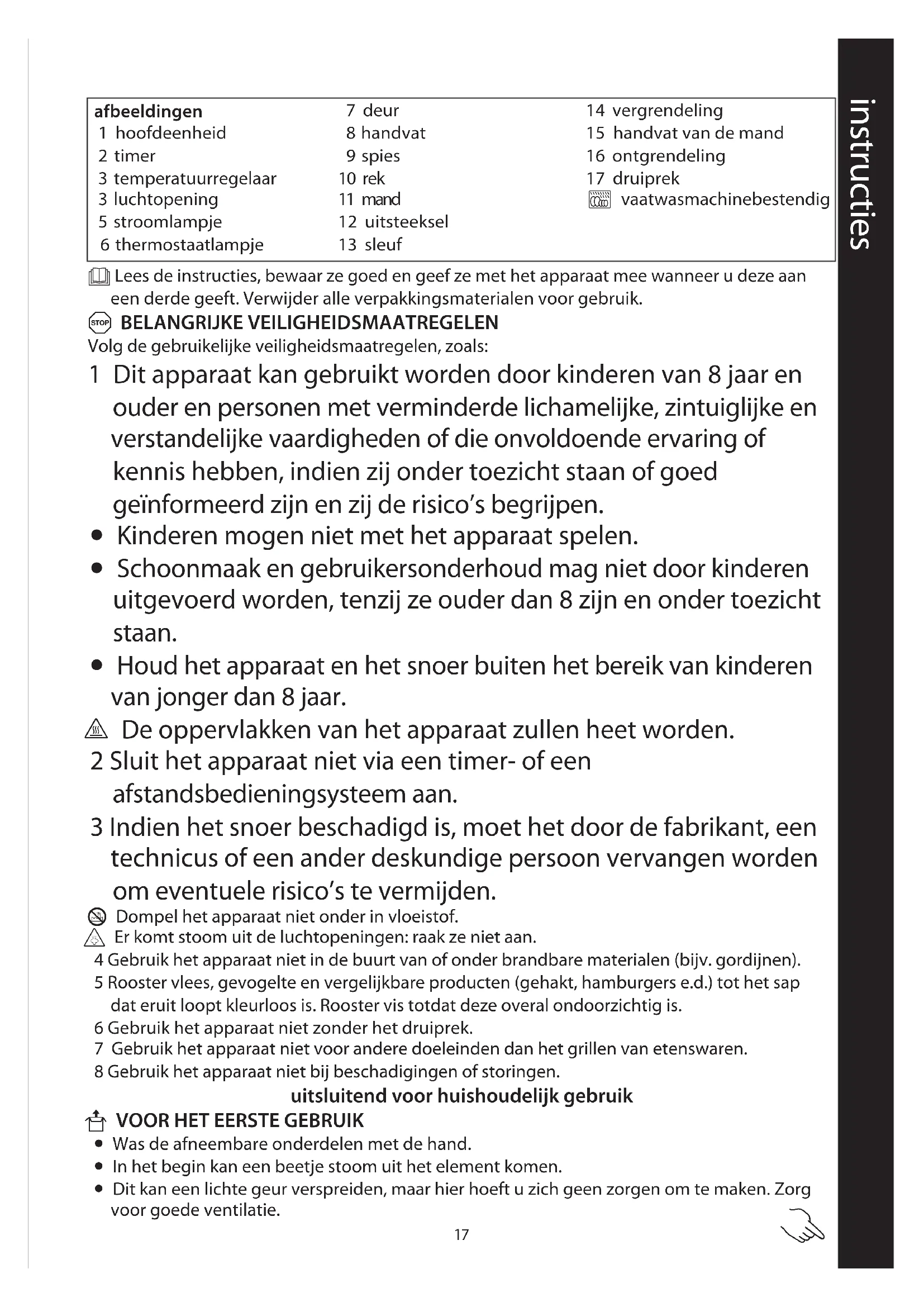 - Dit kan een lichte geur verspreiden, maar hier hoeft u zich geen zorgen om te maken. Zorg voor goede ventilatie. instructies afbeeldingen 1 hoofdeenheid 2 timer 3 temperatuurregelaar 3 luchtopening 5 stroomlampje 6 thermostaatlampje 7 deur 8 handvat 9 spies 10 rek 11 mand 12 uitsteeksel 13 sleuf 14 vergrendeling 15 handvat van de mand 16 ontgrendeling 17 druiprek ` vaatwasmachinebestendig18 d HOE HET WERKT