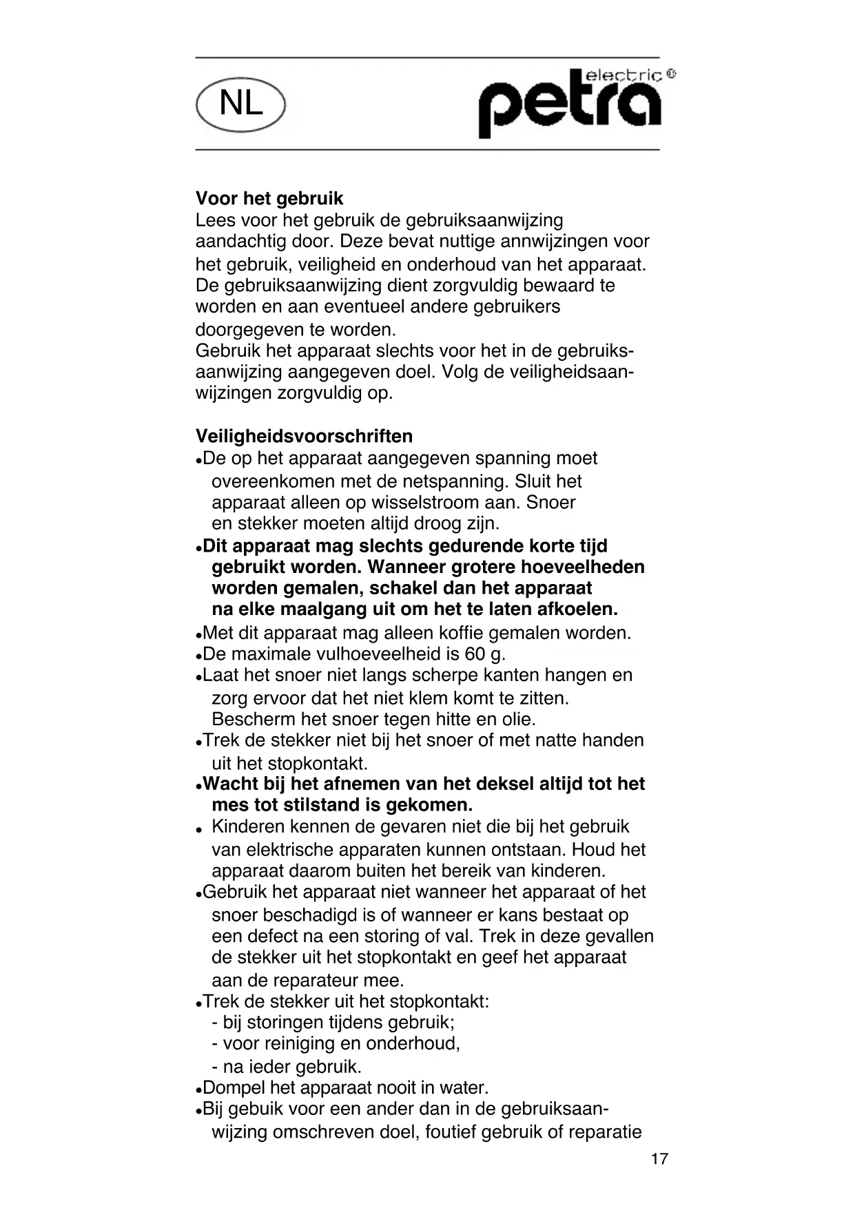 Kinderen kennen de gevaren niet die bij het gebruik van elektrische apparaten kunnen ontstaan. Houd het apparaat daarom buiten het bereik van kinderen. Gebruik het apparaat niet wanneer het apparaat of het snoer beschadigd is of wanneer er kans bestaat op een defect na een storing of val. Trek in deze gevallen de stekker uit het stopkontakt en geef het apparaat aan de reparateur mee. Trek de stekker uit het stopkontakt: - bij storingen tijdens gebruik; - voor reiniging en onderhoud, - na ieder gebruik. Dompel het apparaat nooit in water. Bij gebuik voor een ander dan in de gebruiksaan- wijzing omschreven doel, foutief gebruik of reparatie NL18 door een niet door ons bevoegde instelling, is de fabrikant niet aansprakelijk voor eventueel ontstane schaden. U kunt in deze gevallen ook geen aanspraak maken op de garantibepalingen. Het apparaat is niet geschikt voor professioneel gebruik. Ingebruikname Wrijf het deksel en het reservoir voor de eerste ingebruikname van binnen schoon met een vochtige doek en droog het na. Stop de stekker in het stopkontakt. Vul het reservoir en doe het deksel erop. De maximale vulhoeveelheid van 60 g is genoeg voor ongeveer 10 kopjes koffie. De koffiemolen mag uit veiligheidsredenen alleen met deksel in geburik genomen worden. Druk om te malen de schakelknop bij het deksel naar beneden, tot de gewenste fijnheidsgraad bereikt is. Deze kan tijdens het gebruik door het transparante deksel geobserveerd worden. Nadat hat mes tot stilstand is gekomen, kunt u de gemalen koffie uit de koffiemolen schudden. Trek eerst de stekker uit het stopkontakt. maximale vulstand19 Let op! Kans op verwonding! Wacht altijd tot de messen tot stilstand zijn gekomen! Reiniging en onderhoud Trek na gebruik de stekker uit het stopkontakt. Dompel het apparaat nooit onder in water, maar wrijf het met een vochtige doek schoon. Gebruik geen schuurmiddel. Indien u het mes wilt reinigen, kan het uit het apparaat gehaald worden. Draai het mes hiervoor tegen de klok in en trek naar boven toe los. Met een penseel kunnen pulver-resten uit het resorvoir verwijderd worden. Zet het mes hierna op de draai-as. Wanneer de motor op gang komt, wordt het mes automatisch vastgezet. Reparaties aan het apparaat, als ook het vervangen van een beschadigd snoer mogen alleen uitgevoerd worden door erkende reparateurs daar hiervoor speciaal gereedschap nodig is. Door onvakkundige reparaties kunnen aanzienlijke gevaren voor de gebruiker ontstaan. Het apparaat voldoet aan de Europese richtlijnen 73/23/EEG en 89/336/EEG. Dit product mag na afloop van zijn levensduur niet met het normale huishoudafval verwijderd worden, maar moet bij een verzamelplaats voor elektrische en elektronische apparaten worden afgegeven. Details zijn bij uw gemeentebestuur te verkrijgen. Technische veranderingen voorbehouden. CEpetra - electric Kundendienst Greisbacherstraße 6 D-89331 Burgau www.petra-electric.de Änderungen vorbehalten! - 061018 - 5416 0022