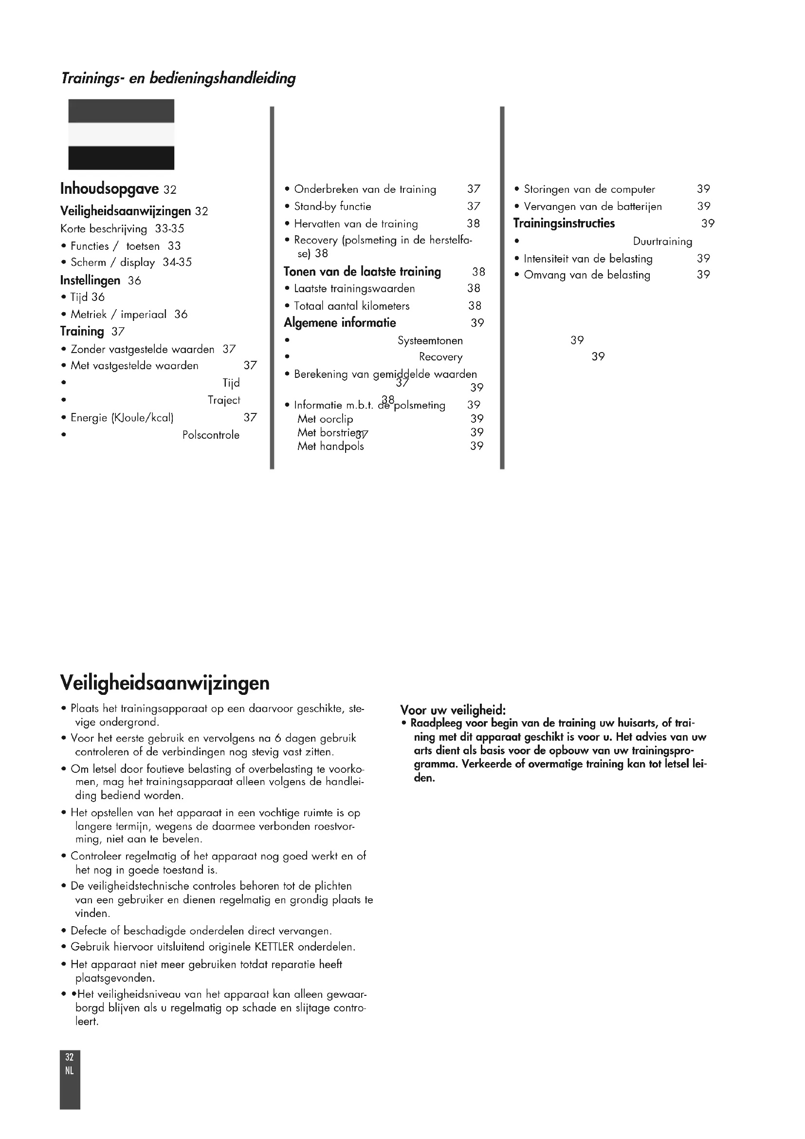 - Raadpleeg voor begin van de training uw huisarts, of trai- ning met dit apparaat geschikt is voor u. Het advies van uw arts dient als basis voor de opbouw van uw trainingspro- gramma. Verkeerde of overmatige training kan tot letsel lei- den. Inhoudsopgave 32 Veiligheidsaanwijzingen 32 Korte beschrijving 33-35