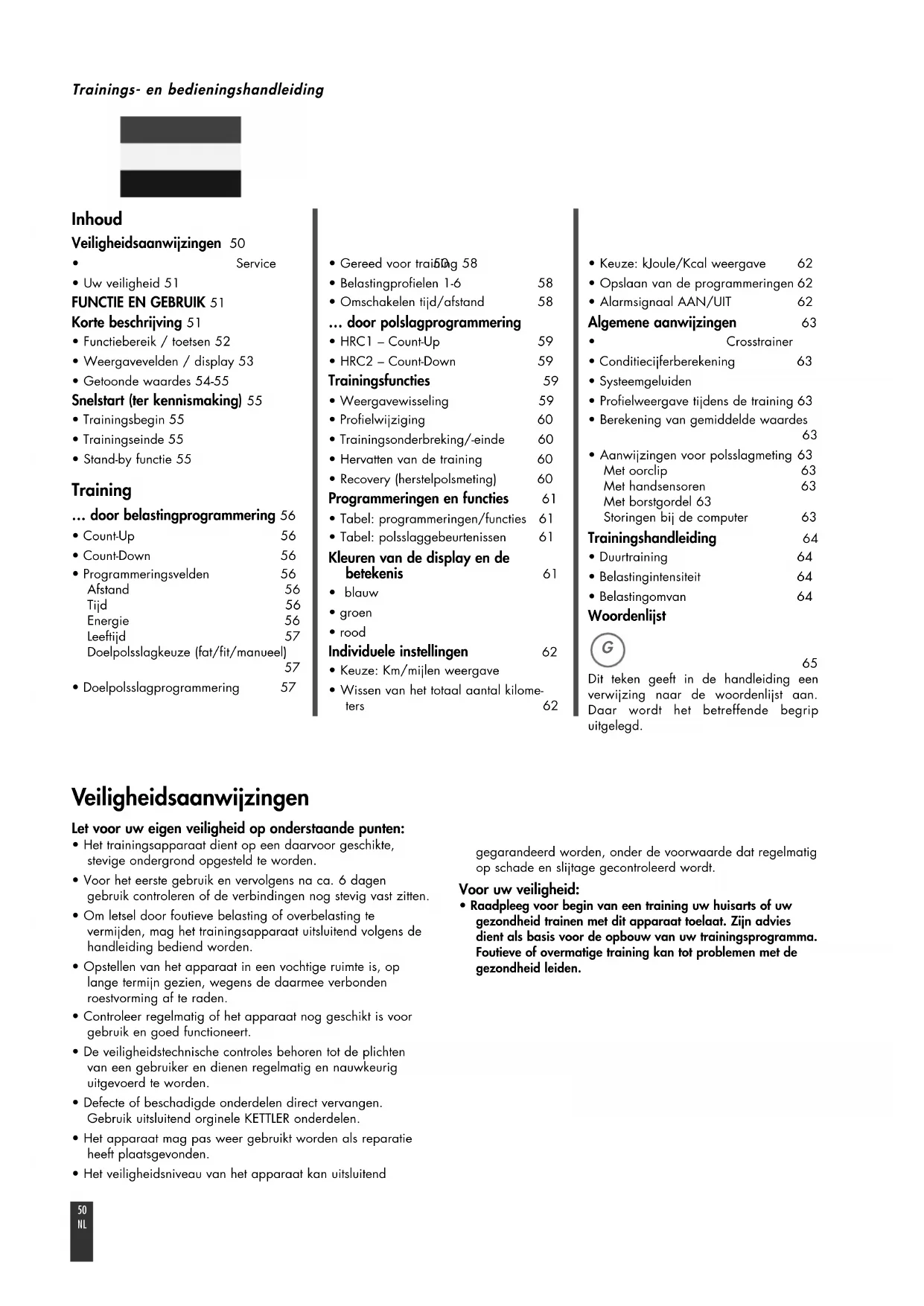- Het trainingsapparaat dient op een daarvoor geschikte,stevige ondergrond opgesteld te worden.• Voor het eerste gebruik en vervolgens na ca. 6 dagengebruik controleren of de verbindingen nog stevig vast zitten.• Om letsel door foutieve belasting of overbelasting tevermijden, mag het trainingsapparaat uitsluitend volgens dehandleiding bediend worden.• Opstellen van het apparaat in een vochtige ruimte is, oplange termijn gezien, wegens de daarmee verbondenroestvorming af te raden.• Controleer regelmatig of het apparaat nog geschikt is voorgebruik en goed functioneert.• De veiligheidstechnische controles behoren tot de plichtenvan een gebruiker en dienen regelmatig en nauwkeuriguitgevoerd te worden.• Defecte of beschadigde onderdelen direct vervangen.Gebruik uitsluitend orginele KETTLER onderdelen.• Het apparaat mag pas weer gebruikt worden als reparatieheeft plaatsgevonden.• Het veiligheidsniveau van het apparaat kan uitsluitendgegarandeerd worden, onder de voorwaarde dat regelmatigop schade en slijtage gecontroleerd wordt. Voor uw veiligheid: