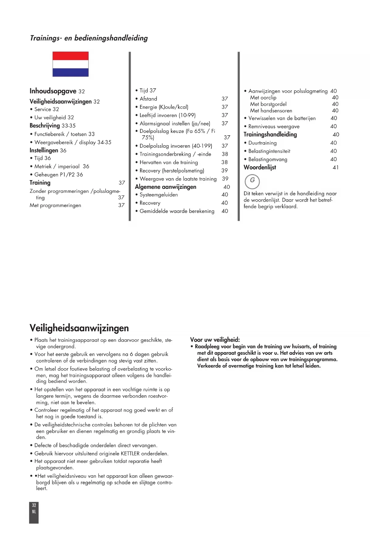 - Defecte of beschadigde onderdelen direct vervangen.• Gebruik hiervoor uitsluitend originele KETTLER onderdelen.• Het apparaat niet meer gebruiken totdat reparatie heeftplaatsgevonden.• •Het veiligheidsniveau van het apparaat kan alleen gewaar-borgd blijven als u regelmatig op schade en slijtage contro-leert. Trainings- en bedieningshandleiding