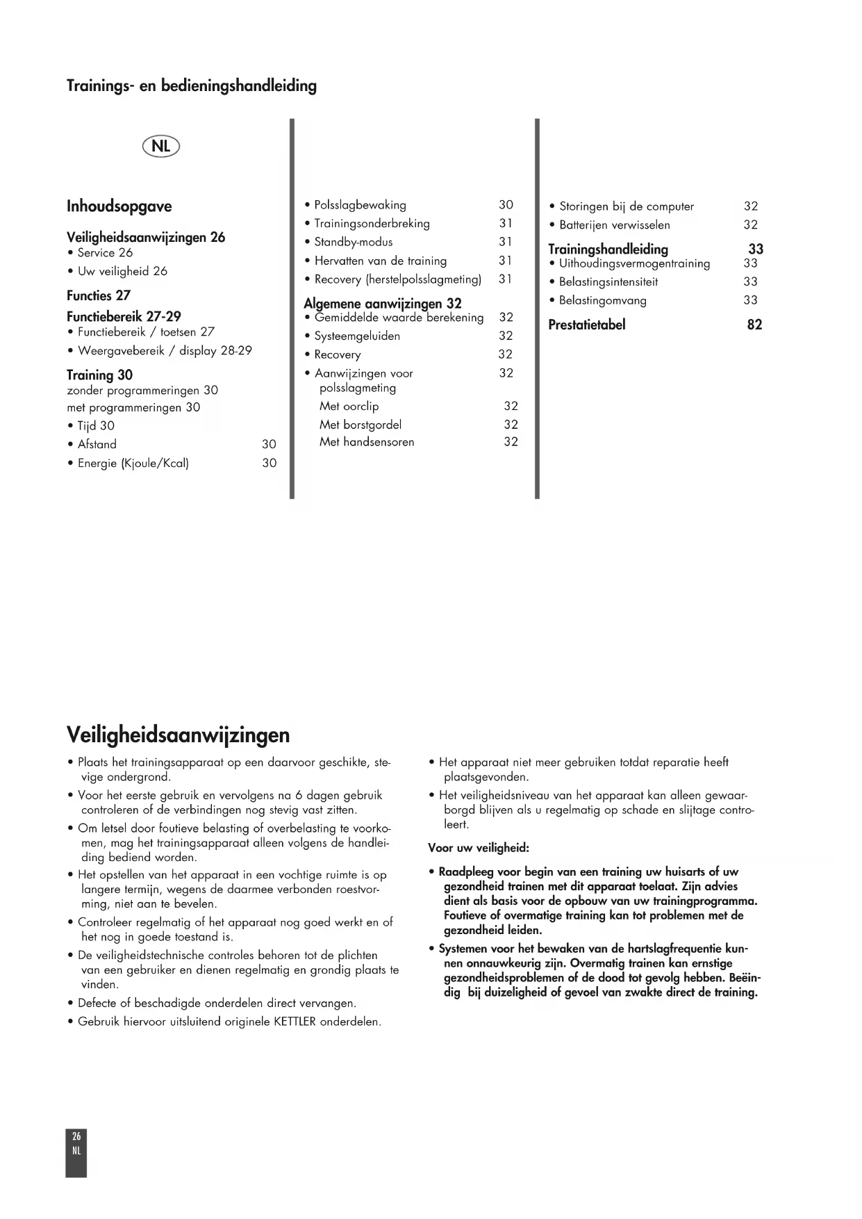 - Systemen voor het bewaken van de hartslagfrequentie kun- nen onnauwkeurig zijn. Overmatig trainen kan ernstige gezondheidsproblemen of de dood tot gevolg hebben. Beëin- dig bij duizeligheid of gevoel van zwakte direct de training. Inhoudsopgave Veiligheidsaanwijzingen 26