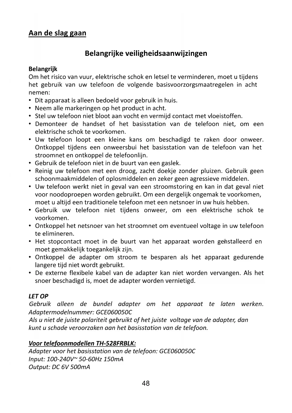 - De externe flexibele kabel van de adapter kan niet worden vervangen. Als het snoer beschadigd is, moet de adapter worden vernietigd. LET OP Gebruik alleen de bundel adapter om het apparaat te laten werken. Adaptermodelnummer: GCE060050C Als u niet de juiste polariteit gebruikt of het juiste voltage van de adapter, dan kunt u schade veroorzaken aan het basisstation van de telefoon. Voor telefoonmodellen TH-528FRBLK: Adapter voor het basisstation van de telefoon: GCE060050C Input: 100-240V~ 50-60Hz 150mA Output: DC 6V 500mA49 Inhoud van de verpakking