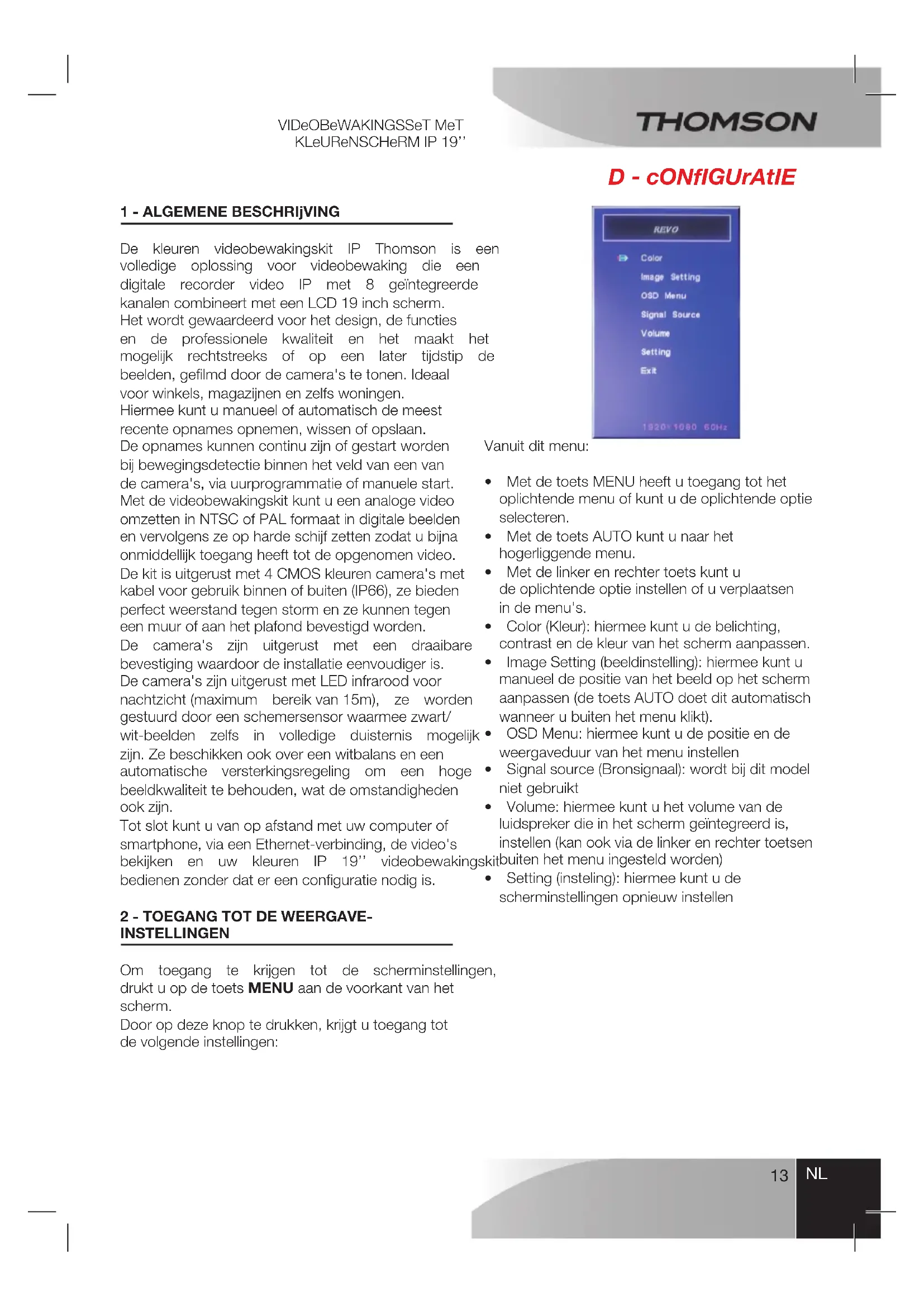 H - ExtrA PrODUctEN Heel wat extra producten zijn beschikbaar in het gamma videobewaking van Thomson: extra camera,verbindingskabelomeenbestaandekabel teverlengenofeenextracamerauitterusten,enz. Neemcontactopmetuwdistributeurofopwww. thomsonsecurity.euvoormeerinformatie.Videobewakingsset met kleuRenscheRm iP 19’’