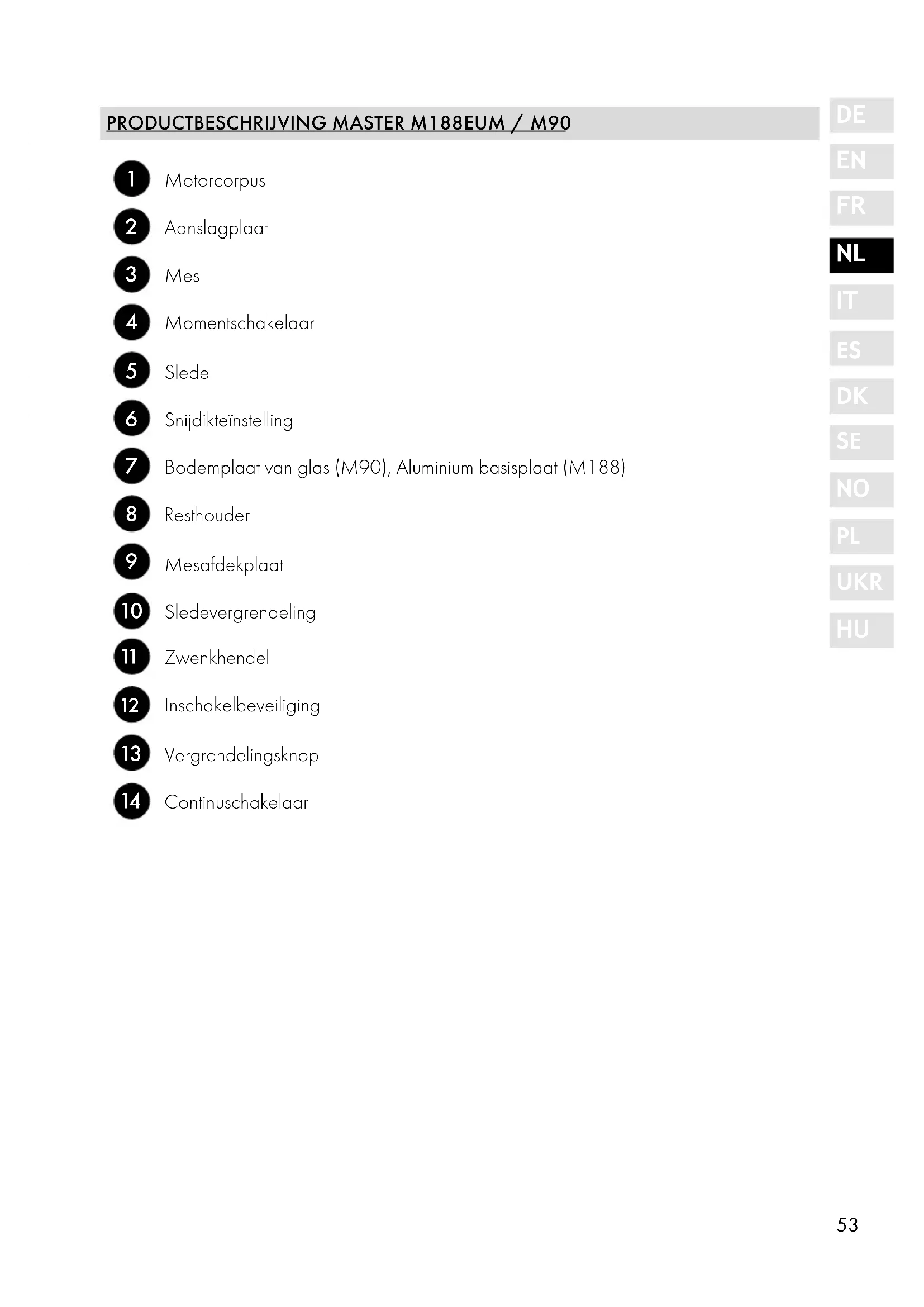 (M188 / M90/M95) De kantelfunctie is bijzonder geschikt voor het snijden van brood, harde worsten en groenten. Met de kantelfunctie wordt voor de60 aanvoer gebruik gemaakt van de natuurlijke zwaartekracht van het snijgoed. Ga als volgt te werk om het apparaat te kan- telen: ● Druk op de vergrendelingsknop. Het ap- paraat wordt ontgrendeld. ● Duw het apparaat omhoog zodat het 30° gekanteld is. ● Druk de zwenkhendel omhoog om de po- sitie vast te zetten. ● Het apparaat is pas beveiligd als het hoor- baar op zijn plaats vastklikt. ● Nu kunt u doorgaan zoals beschreven on- der "Ingebruikname". ● Duw de zwenkhendel omlaag en draai het apparaat weer terug na voltooiing van het snijden. ● De borgbout klikt vast door op het achter- ste deel van het profiel te drukken. REINIGING Reinig de buitenzijden van het apparaat met een zachte, vochtige doek. Bij sterke vervui- ling kan een zacht reinigingsmiddel worden gebruikt. SLEDE Om de slede beter te reinigen, is deze van het apparaat afneembaar. ● Druk de sledevergrendeling met de vinger omhoog. ● Houdt de sledevergrendeling ingedrukt en trek de slede naar u toe. ● Reinig alle onderdelen met een vochtige doek of onder stromend water. Geef één keer per maand enige dropjes harsvrije olie of vaseline op de slede gelei- ding. Verwijder overtollige olie/ overtollige vaseline met een zacht doek van katoen. BELANGRIJK! Slede niet in de vaatwasser reinigen! MES AFNEMEN Schroef van tijd tot tijd het mes los en reinig het apparaat van binnen. Met name als "sappig" snijgoed (groente, fruit, braadstukken, etc.) werden gesneden. Behandel het mes met de nodige zorgvuldigheid. ● Neem de slede weg. ● Draai de mesafdekplaat d.m.v. de zwarte greep omhoog totdat deze verticaal bo- ven de motorcorpus staat. Hierbij moet in de uitgangspositie eerst het vastklikpunt worden overwonnen. ● Nu kunt u deze met zachte druk van het mes weg afnemen. ● Maak het mes los door met een munt de schroef van het mes met de wijzers van de klok te draaien. VOORZICHTIG De snede van het mes is zeer scherp. Ge- vaar voor letsel! Hanteer voorzichtig met het mes. ● Reinig de binnenzijden van het mes en van de zwarte ring met een vochtige doek. ● Smeer de binnenzijden van het mes (mestandwiel) en van de zwarte ring in met vaseline. Gebruik geen bakolie of marga- rine/boter, deze worden na verloop van tijd harsachtig. ● Het inzetten van het mes gebeurt in de om- gekeerde volgorde.