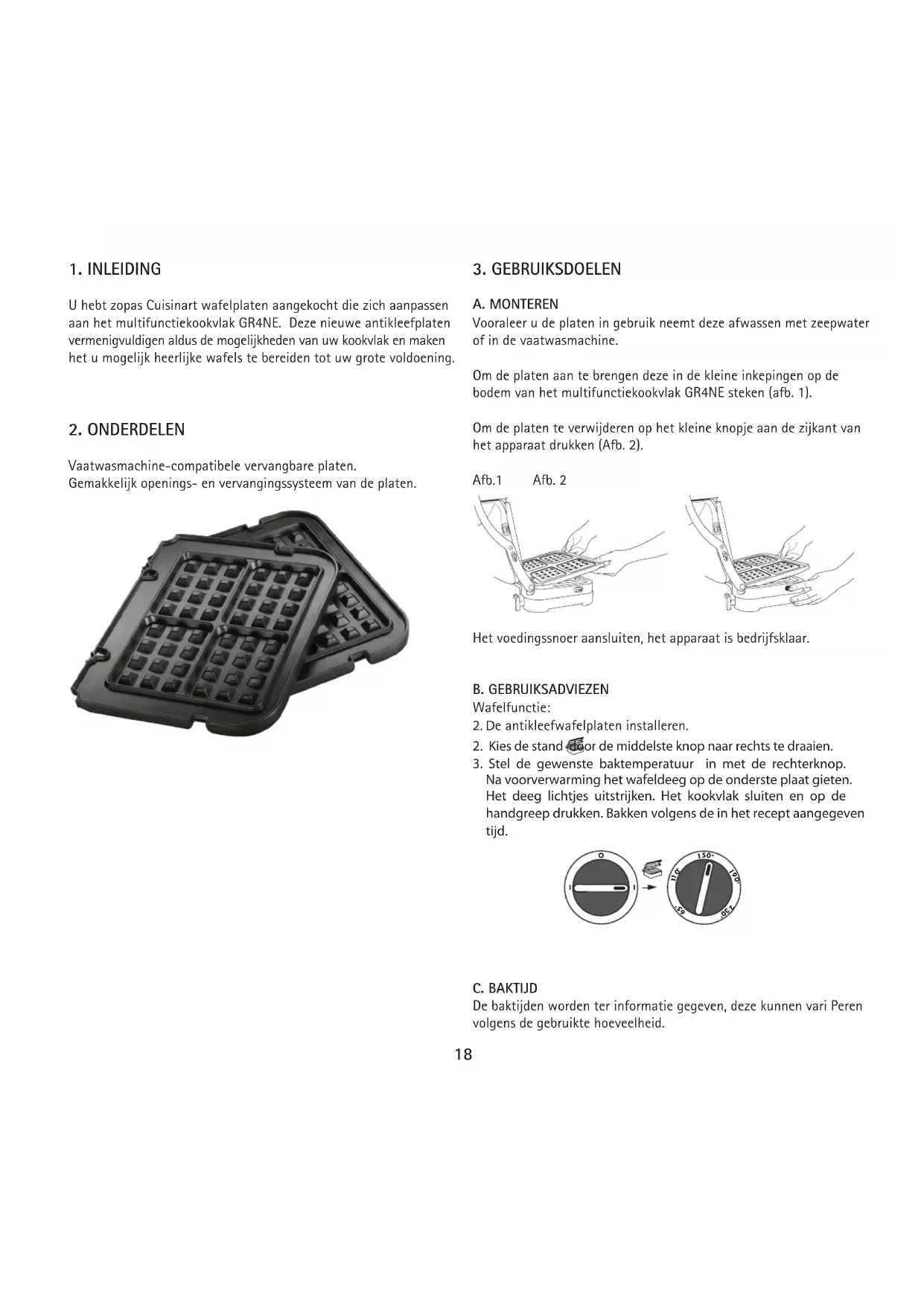 A. MONTEREN Vooraleerudeplateningebruikneemtdezeafwassenmetzeepwater ofindevaatwasmachine. Omdeplatenaantebrengendezeindekleineinkepingenopde bodem van het multifunctiekookvlak GR4NE steken (afb. 1). Omdeplatenteverwijderenophetkleineknopjeaandezijkantvan het apparaat drukken (Afb. 2). Afb.1 Afb. 2 Hetvoedingssnoeraansluiten,hetapparaatisbedrijfsklaar. B. GEBRUIKSADVIEZEN Wafelfunctie: