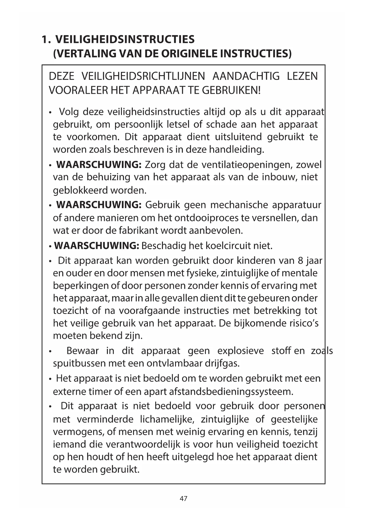 - WAARSCHUWING: Gebruik geen mechanische apparatuur of andere manieren om het ontdooiproces te versnellen, dan wat er door de fabrikant wordt aanbevolen.