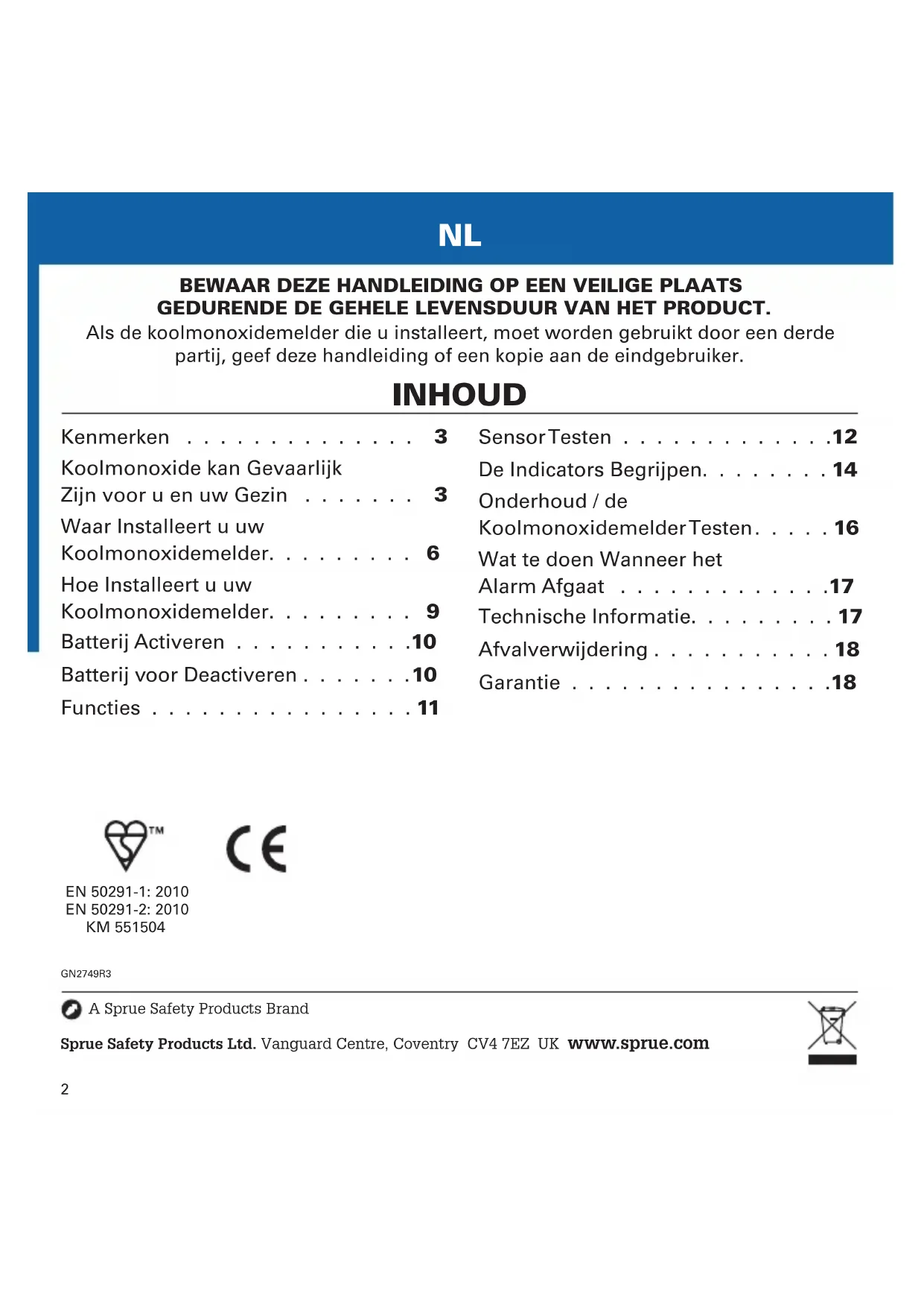 - Digitale kamerthermometer. EN 50291-1: 2010 EN 50291-2: 2010 KM 551504 GN2749R33 Sprue Safety Products Ltd. Vanguard Centre, Coventry CV4 7EZ UK www.sprue.com Sensor Testen . . . . . . . . . . . . .12 De Indicators Begrijpen. . . . . . . .14 Onderhoud / de Koolmonoxidemelder Testen . . . . .16 Wat te doen Wanneer het Alarm Afgaat . . . . . . . . . . . . .17 Technische Informatie. . . . . . . . .17 Afvalverwijdering . . . . . . . . . . .18 Garantie . . . . . . . . . . . . . . . .18 BEWAAR DEZE HANDLEIDING OP EEN VEILIGE PLAATS GEDURENDE DE GEHELE LEVENSDUUR VAN HET PRODUCT. Als de koolmonoxidemelder die u installeert, moet worden gebruikt door een derde partij, geef deze handleiding of een kopie aan de eindgebruiker. INHOUD NL KENMERKEN