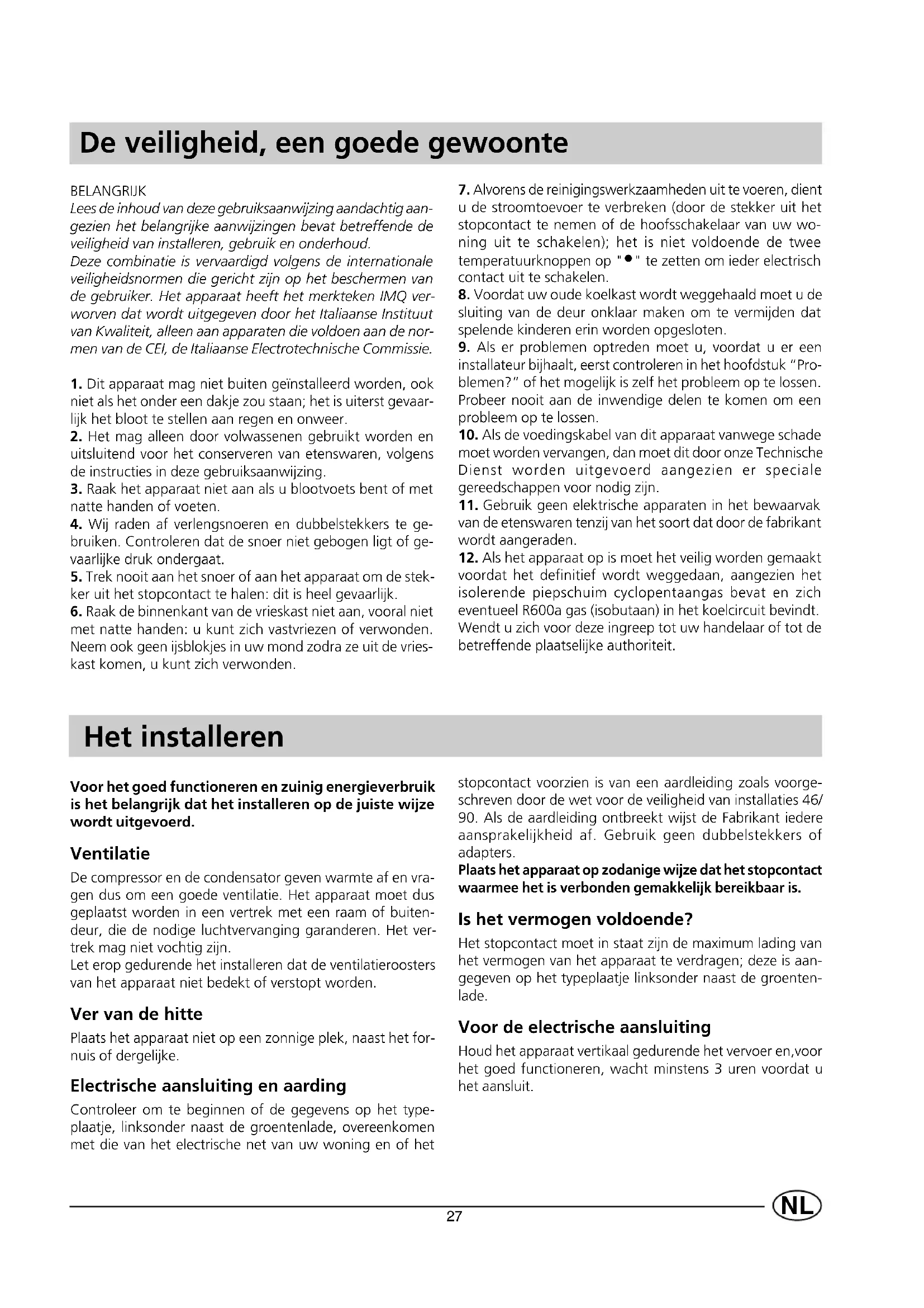 BELANGRIJK Lees de inhoud van deze gebruiksaanwijzing aandachtig aan- gezien het belangrijke aanwijzingen bevat betreffende de veiligheid van installeren, gebruik en onderhoud. Deze combinatie is vervaardigd volgens de internationale veiligheidsnormen die gericht zijn op het beschermen van de gebruiker. Het apparaat heeft het merkteken IMQ ver- worven dat wordt uitgegeven door het Italiaanse Instituut van Kwaliteit, alleen aan apparaten die voldoen aan de nor- men van de CEI, de Italiaanse Electrotechnische Commissie.