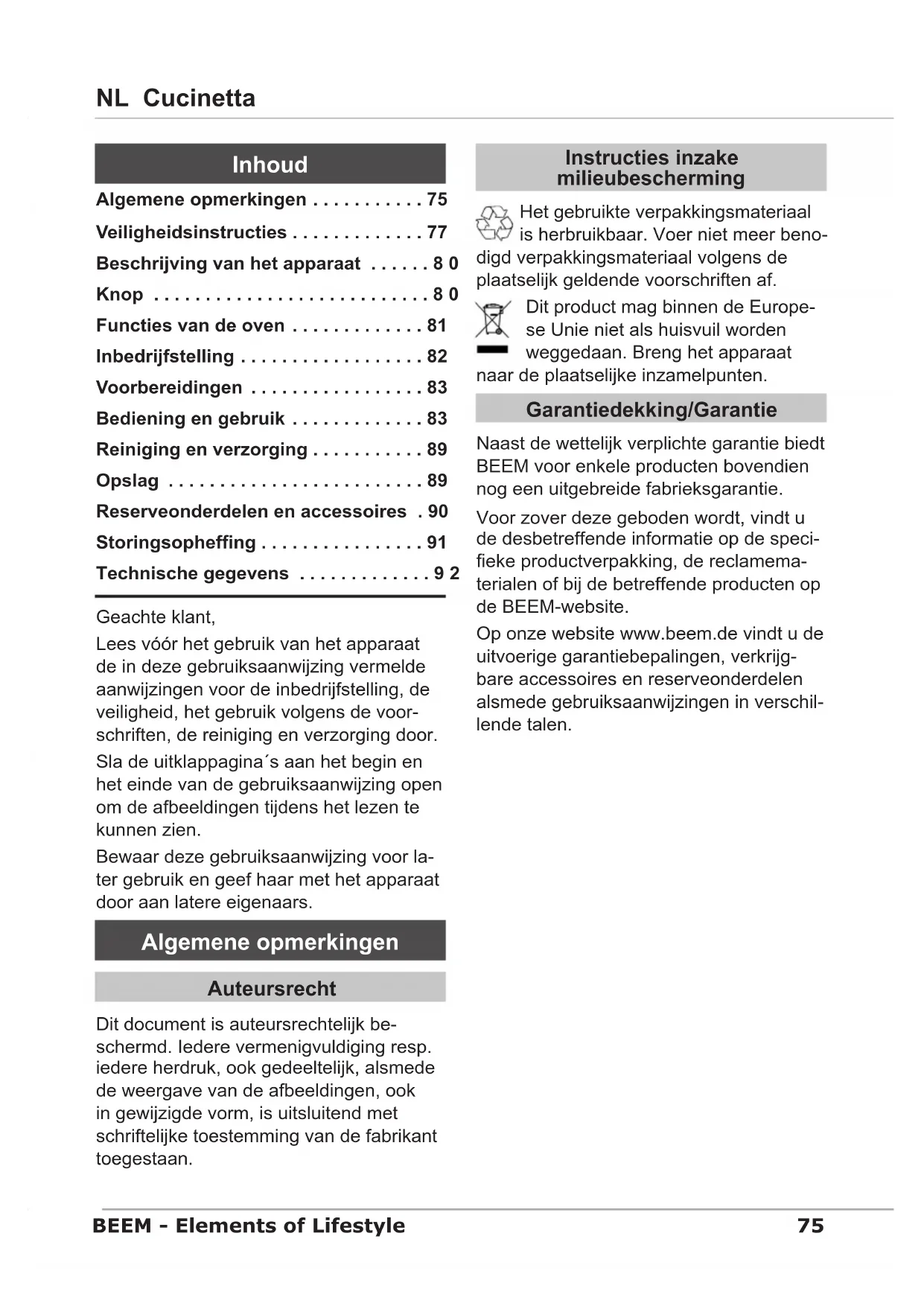 - Numeración conforme a la descripción del aparato73 ES Cucinetta BEEM - Elements of Lifestyle Solución de problemas El contenido de la siguiente tabla le ayudará a localizar y solucionar pequeños problemas. Problema Causa posible Solución La pantalla no se encien- de. Se ha disparado el interrup- tor automático en el cuadro de protección. Conecte el interruptor auto- mático. El indicador de control está averiado Informe al servicio de aten- ción al cliente. Se dispara el interruptor automático en el cuadro de protección. Hay demasiados aparatos conectados al mismo circui- to eléctrico. Reduzca el número de apara- tos conectados al circuito eléctrico. No se encuentra ningún fallo. Informe al servicio de aten- ción al cliente. Sale aceite por debajo del aparato. Bandeja recoge grasa no insertada. Insertar la bandeja recoge grasa. Bandeja recoge grasa llena. Vaciar la bandeja recoge grasa. INDICACIÓN Si no logra solucionar el problema con estas acciones, póngase en contacto con el ► servicio de atención al cliente.74 Cucinetta ES BEEM - Elements of Lifestyle Datos técnicos Modelo Cucinetta Horno de infrarrojos N.º de tipo B25.001 Dimensiones 450 x 380 x 270 mm (A x A x F) Peso aprox. 8,77 kg Tensión de servicio 220 - 240 V~ Frecuencia de red 50 Hz Consumo de potencia 1300 W Categoría de protección I75 NL Cucinetta BEEM - Elements of Lifestyle Geachte klant, Lees vóór het gebruik van het apparaat de in deze gebruiksaanwijzing vermelde aanwijzingen voor de inbedrijfstelling, de veiligheid, het gebruik volgens de voor- schriften, de reiniging en verzorging door. Sla de uitklappagina´s aan het begin en het einde van de gebruiksaanwijzing open om de afbeeldingen tijdens het lezen te kunnen zien. Bewaar deze gebruiksaanwijzing voor la- ter gebruik en geef haar met het apparaat door aan latere eigenaars. Algemene opmerkingen Auteursrecht Dit document is auteursrechtelijk be- schermd. Iedere vermenigvuldiging resp. iedere herdruk, ook gedeeltelijk, alsmede de weergave van de afbeeldingen, ook in gewijzigde vorm, is uitsluitend met schriftelijke toestemming van de fabrikant toegestaan. Instructies inzake milieubescherming Het gebruikte verpakkingsmateriaal is herbruikbaar. Voer niet meer beno- digd verpakkingsmateriaal volgens de plaatselijk geldende voorschriften af. Dit product mag binnen de Europe- se Unie niet als huisvuil worden weggedaan. Breng het apparaat naar de plaatselijke inzamelpunten. Garantiedekking/Garantie Naast de wettelijk verplichte garantie biedt BEEM voor enkele producten bovendien nog een uitgebreide fabrieksgarantie. Voor zover deze geboden wordt, vindt u de desbetreffende informatie op de speci- eke productverpakking, de reclamema- terialen of bij de betreffende producten op de BEEM-website. Op onze website www.beem.de vindt u de uitvoerige garantiebepalingen, verkrijg- bare accessoires en reserveonderdelen alsmede gebruiksaanwijzingen in verschil- lende talen. Algemene opmerkingen . . . . . . . . . . . 75 Veiligheidsinstructies . . . . . . . . . . . . . 77 Beschrijving van het apparaat ......80 Knop ...........................80 Functies van de oven . . . . . . . . . . . . . 81 Inbedrijfstelling . . . . . . . . . . . . . . . . . . 82 Voorbereidingen . . . . . . . . . . . . . . . . . 83 Bediening en gebruik . . . . . . . . . . . . . 83 Reiniging en verzorging . . . . . . . . . . . 89 Opslag . . . . . . . . . . . . . . . . . . . . . . . . . 89 Reserveonderdelen en accessoires . 90 Storingsophefng . . . . . . . . . . . . . . . . 91 Technische gegevens .............92 Inhoud76 Cucinetta NL BEEM - Elements of Lifestyle Gebruik volgens de voorschriften Dit apparaat is vooral voor niet-commer- cieel gebruik in gesloten ruimtes voor het roosteren, bakken, grillen, braden en ont- dooien van levensmiddelen bedoeld. Een ander of verdergaand gebruik geldt als oneigenlijk gebruik. WAARSCHUWING In geval van oneigenlijk gebruik en/ of niet voorzien gebruik van het appa- raat kunnen van het apparaat gevaren uitgaan. Het apparaat mag uitsluitend voor ► het beoogde, toegelaten gebruiks- doel worden gebruikt. Leef de in deze gebruiksaanwijzing ► beschreven voorschriften na. Claims en reclamaties van welke aard dan ook, die te herleiden zijn tot verkeerd of oneigenlijk gebruik, worden niet aanvaard. Het risico berust dan uitsluitend bij de ge- bruiker. Conformiteitsverklaring Bij deze verklaart BEEM dat dit apparaat aan de principiële eisen en de overige van toepassing zijnde bepalingen van de richtlijn 2006/95/EG, 2009/125/EG en 2004/108/EG voldoet. Gebruikte symbolen GEVAAR Wordt gebruikt voor een onmiddellijk dreigend gevaar dat ernstig of dodelijk lichamelijk letsel tot gevolg kan hebben. Ter voorkoming van het gevaar ► moeten de hier vermelde instructies worden nageleefd. WAARSCHUWING Wordt gebruikt voor een mogelijk ge- vaarlijke situatie die ernstig of dodelijk lichamelijk letsel zou kunnen veroorza- ken. Ter voorkoming van het gevaar ► moeten de hier vermelde instructies worden nageleefd. LET OP Wordt gebruikt voor een mogelijke gevaarlijke situatie die lichte lichamelijke letsels of materiële schade kan veroor- zaken. Ter voorkoming van het gevaar ► moeten de hier vermelde instructies worden nageleefd. OPMERKING Een opmerking bevat verdere ► informatie die de omgang met het apparaat eenvoudiger kan maken. Symbolen op het apparaat Symbool Betekenis Waarschuwing voor heet oppervlak.77 NL Cucinetta BEEM - Elements of Lifestyle Aansprakelijkheidsbeperkingen Wij aanvaarden geen aansprakelijkheid voor schades of vervolgschades in geval- len: waarbij de bedieningshandleiding niet ■ in acht genomen is, van oneigenlijk, niet toegelaten ge- ■ bruik, van een inadequate of onjuiste behan- ■ deling, van niet deskundig uitgevoerde repa- ■ raties, van niet door ons geautoriseerde mo- ■ dicaties, waarbij onderdelen of vervangende on- ■ derdelen van derden werden gebruik, waarbij ongeschikte aanvullende ■ onderdelen of accessoires werden gebr