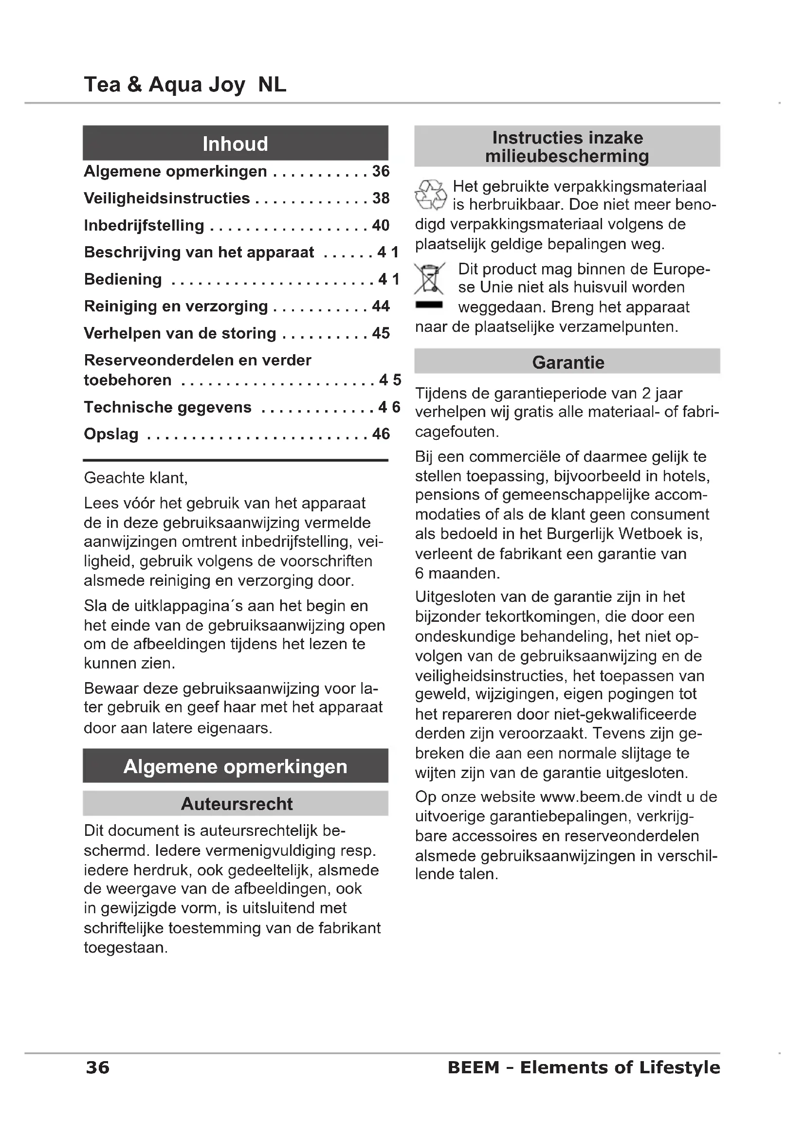 - selon le schéma dans la description de l'appareil35 fR Tea & Aqua Joy BEEM - Elements of Lifestyle Données techniques Modèle Samovar / Bouilloire d'eau et à thé Tea & Aqua Joy Numéro de série W12.001 Volume de remplissage réservoir d'eau 1,5 l Volume de remplissage de la théière 0,7 l Tension de service 220-240 VAC Fréquence réseau 50 Hz Puissance absorbée 1580-1880 W / 80 W Dimensions (H x La x P) 50 x 40 x 41 cm Poids env. 1,4 kg Classe de protection I Rangement Si vous n'utilisez pas l'appareil pendant une période prolongée, videz-le et net- toyez-le de la manière décrite au chapitre Nettoyage et entretien. Rangez l'appareil dans un endroit sec, propre et à l'abri du gel, où il ne sera pas exposé directement aux rayons du soleil.36 Tea & Aqua Joy NL BEEM - Elements of Lifestyle Geachte klant, Lees vóór het gebruik van het apparaat de in deze gebruiksaanwijzing vermelde aanwijzingen omtrent inbedrijfstelling, vei- ligheid, gebruik volgens de voorschriften alsmede reiniging en verzorging door. Sla de uitklappagina´s aan het begin en het einde van de gebruiksaanwijzing open om de afbeeldingen tijdens het lezen te kunnen zien. Bewaar deze gebruiksaanwijzing voor la- ter gebruik en geef haar met het apparaat door aan latere eigenaars. Algemene opmerkingen Auteursrecht Dit document is auteursrechtelijk be- schermd. Iedere vermenigvuldiging resp. iedere herdruk, ook gedeeltelijk, alsmede de weergave van de afbeeldingen, ook in gewijzigde vorm, is uitsluitend met schriftelijke toestemming van de fabrikant toegestaan. Instructies inzake milieubescherming Het gebruikte verpakkingsmateriaal is herbruikbaar. Doe niet meer beno- digd verpakkingsmateriaal volgens de plaatselijk geldige bepalingen weg. Dit product mag binnen de Europe- se Unie niet als huisvuil worden weggedaan. Breng het apparaat naar de plaatselijke verzamelpunten. Garantie Tijdens de garantieperiode van 2 jaar verhelpen wij gratis alle materiaal- of fabri- cagefouten. Bij een commerciële of daarmee gelijk te stellen toepassing, bijvoorbeeld in hotels, pensions of gemeenschappelijke accom- modaties of als de klant geen consument als bedoeld in het Burgerlijk Wetboek is, verleent de fabrikant een garantie van 6 maanden. Uitgesloten van de garantie zijn in het bijzonder tekortkomingen, die door een ondeskundige behandeling, het niet op- volgen van de gebruiksaanwijzing en de veiligheidsinstructies, het toepassen van geweld, wijzigingen, eigen pogingen tot het repareren door niet-gekwaliceerde derden zijn veroorzaakt. Tevens zijn ge- breken die aan een normale slijtage te wijten zijn van de garantie uitgesloten. Op onze website www.beem.de vindt u de uitvoerige garantiebepalingen, verkrijg- bare accessoires en reserveonderdelen alsmede gebruiksaanwijzingen in verschil- lende talen. Algemene opmerkingen . . . . . . . . . . . 36 Veiligheidsinstructies . . . . . . . . . . . . . 38 Inbedrijfstelling . . . . . . . . . . . . . . . . . . 40 Beschrijving van het apparaat ......41 Bediening .......................41 Reiniging en verzorging . . . . . . . . . . . 44 Verhelpen van de storing . . . . . . . . . . 45 Reserveonderdelen en verder toebehoren ......................45 Technische gegevens .............46 Opslag . . . . . . . . . . . . . . . . . . . . . . . . . 46 Inhoud37 NL Tea & Aqua Joy BEEM - Elements of Lifestyle WAARSCHUWING In geval van gebruik in strijd met de voorschriften en/of ander gebruik kun- nen van het apparaat gevaren uitgaan. Het apparaat mag uitsluitend vol- ► gens voorschrift worden gebruikt. De in deze gebruiksaanwijzing ► beschreven aanpak dient te worden nageleefd. Aansprakelijkheden, onverschillig van welke aard, die op gebruik in strijd met de voorschriften kunnen worden herleid, wor- den niet aanvaard. Het risico ligt uitsluitend bij de gebruiker. Houd bij commercieel gebruik rekening met een wijziging van de garantieperiode. Aansprakelijkheidsbeperkingen Alle in deze gebruiksaanwijzing vermelde technische informatie, gegevens en in- structies voldoen aan de stand van zaken op het tijdstip van druk. Aan de vermeldingen, afbeeldingen en beschrijvingen in deze handleiding kunnen dan ook geen rechten worden ontleend. De fabrikant aanvaardt geen aanspra- kelijkheid voor schade die voortkomt uit het negeren van de gebruiksaanwijzing, gebruik in strijd met de voorschriften, ondeskundige reparaties, ongeoorloofd uitgevoerde wijzigingen of gebruik van niet-toegestane reserveonderdelen en/of verbruiksmaterialen. Conformiteitsverklaring Bij deze verklaart BEEM dat dit apparaat aan de principiële eisen en de overige van toepassing zijnde bepalingen van de richt- lijn 2006/95/EG en 2004/108/EG voldoet. Een volledige conformiteitsverklaring vindt u op www.beem.de Gebruikte symbolen GEVAAR Wordt gebruikt voor een rechtstreeks dreigend gevaar dat zware lichamelijke letsels of de dood veroorzaakt. Ter voorkoming van het gevaar ► moeten de hier vermelde instructies worden nageleefd. WAARSCHUWING Wordt gebruikt voor een mogelijke ge- vaarlijke situatie die zware lichamelijke letsels of de dood zou kunnen veroor- zaken. Ter voorkoming van het gevaar ► moeten de hier vermelde instructies worden nageleefd. LET OP Wordt gebruikt voor een mogelijke gevaarlijke situatie die lichte lichamelijke letsels of materiële schade kan veroor- zaken. Ter voorkoming van het gevaar ► moeten de hier vermelde instructies worden nageleefd. OPMERKING Een opmerking bevat verdere ► informatie die de hantering met het apparaat eenvoudiger maken. Gebruik volgens de voorschriften Dit apparaat is uitsluitend voor niet-com- mercieel gebruik in gesloten ruimtes voor het verwarmen van water en het zetten van thee bedoeld. Een ander of daar bovenuit gaand gebruik geldt als niet volgens voorschrift.38 Tea & Aqua Joy NL BEEM - Elements of Lifestyle Veiligheidsinstructies Controleer het apparaat vóór gebruik ■ op van buiten zichtbare schade. Stel een beschadigd apparaat niet in be- drijf. Kinderen moeten onder toezicht st
