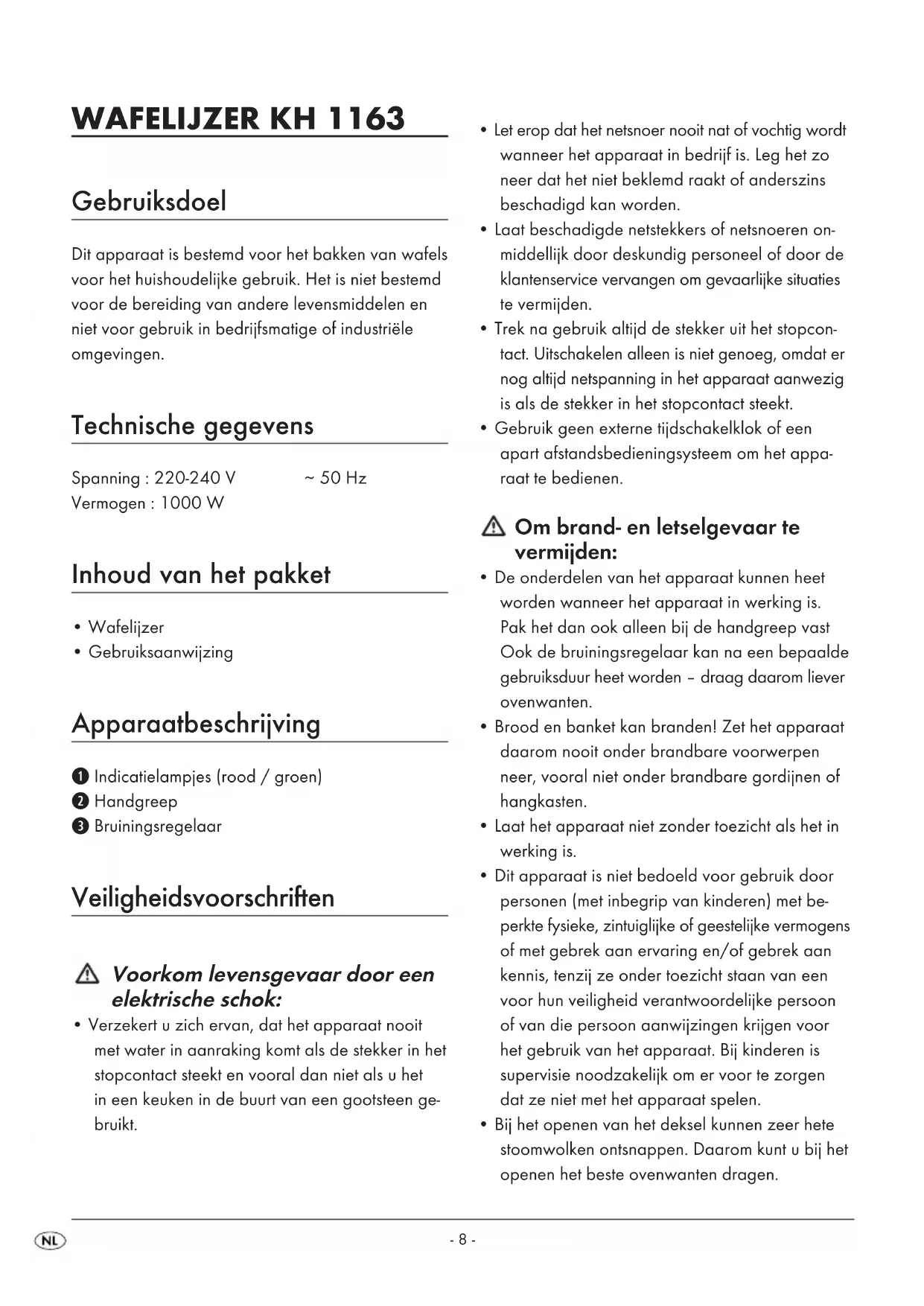 3 minutes à intensité maximale avec le batteur à main. IB_KH1163_E41971_LB2 18.12.2008 11:20 Uhr Seite 6- 7 - INHOUDSOPGAVE BLADZIJDE Gebruiksdoel 8 Technische gegevens 8 Inhoud van het pakket 8 Apparaatbeschrijving 8 Veiligheidsvoorschriften 8 Voor de eerste ingebruikname 9 Wafels bakken 9 Reinigen en onderhouden 10 Opbergen 11 Milieurichtlijnen 11 Importeur 11 Garantie en service 11 Tips 11 Recepten 12 Basisteig . . . . . . . . . . . . . . . . . . . . . . . . . . . . . . . . . . . . . . . . . . . . . . . . . . . . . . . . . . . . . . . . .18 Apfelwaffeln . . . . . . . . . . . . . . . . . . . . . . . . . . . . . . . . . . . . . . . . . . . . . . . . . . . . . . . . . . . . . .18 Schinkenwaffeln . . . . . . . . . . . . . . . . . . . . . . . . . . . . . . . . . . . . . . . . . . . . . . . . . . . . . . . . . . .18 Bewaar deze handleiding voor toekomstige vragen – en geef deze mee wanneer u het apparaat overdoet aan iemand anders! IB_KH1163_E41971_LB2 18.12.2008 11:20 Uhr Seite 7- 8 - WAFELIJZER KH 1163 Gebruiksdoel Dit apparaat is bestemd voor het bakken van wafels voor het huishoudelijke gebruik. Het is niet bestemd voor de bereiding van andere levensmiddelen en niet voor gebruik in bedrijfsmatige of industriële omgevingen. Technische gegevens Spanning : 220-240 V