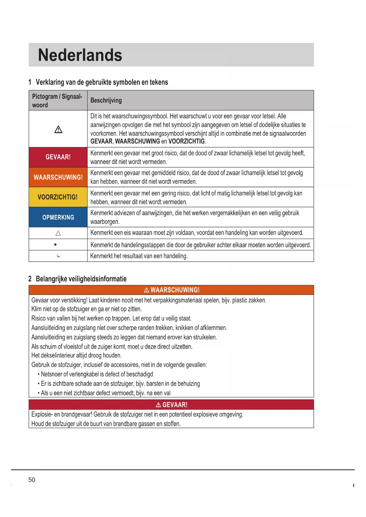 - Als u een niet zichtbaar defect vermoedt, bijv. na een val l GEVAAR! Explosie- en brandgevaar! Gebruik de stofzuiger niet in een potentieel explosieve omgeving. Houd de stofzuiger uit de buurt van brandbare gassen en stoffen.51 l GEVAAR! Explosie- en brandgevaar! Gebruik de stofzuiger niet om het volgende op te zuigen:
