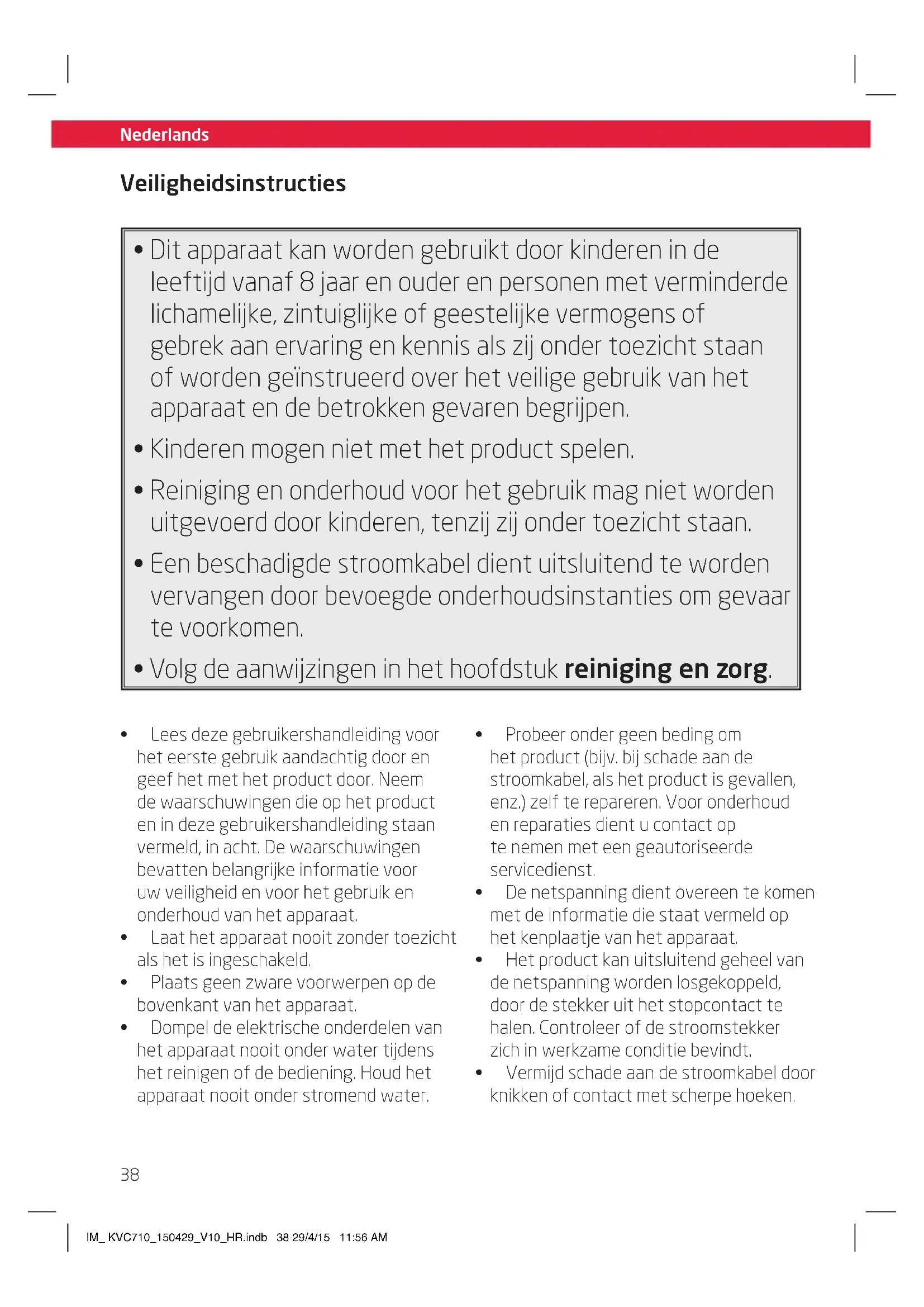 - Volg de aanwijzingen in het hoofdstuk reiniging en zorg. Veiligheidsinstructies