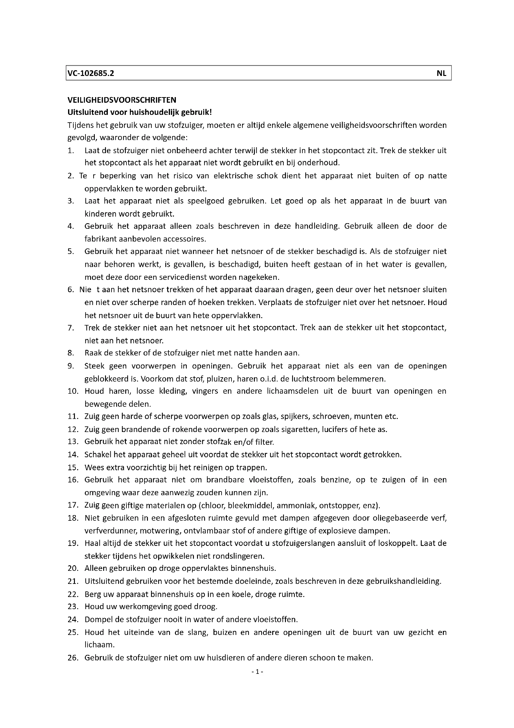 VEILIGHEIDSVOORSCHRIFTEN Uitsluitendvoorhuishoudelijkgebruik! Tijdenshetgebruikvanuwstofzuiger,moeteneraltijdenkelealgemeneveiligheidsvoorschriftenworden gevolgd,waaronderdevolgende: