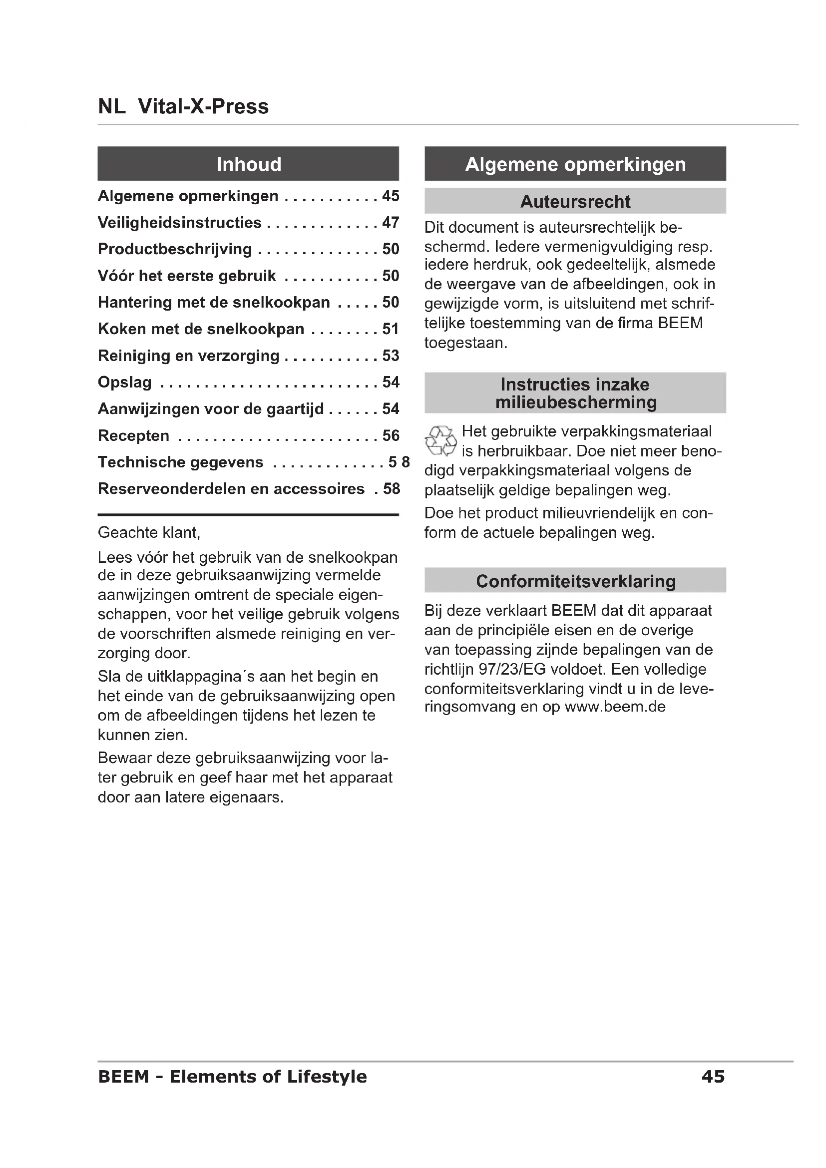 - Numérotation suivant la description de l'appareil45 NL Vital-X-Press BEEM - Elements of Lifestyle Geachte klant, Lees vóór het gebruik van de snelkookpan de in deze gebruiksaanwijzing vermelde aanwijzingen omtrent de speciale eigen- schappen, voor het veilige gebruik volgens de voorschriften alsmede reiniging en ver- zorging door. Sla de uitklappagina´s aan het begin en het einde van de gebruiksaanwijzing open om de afbeeldingen tijdens het lezen te kunnen zien. Bewaar deze gebruiksaanwijzing voor la- ter gebruik en geef haar met het apparaat door aan latere eigenaars. Algemene opmerkingen Auteursrecht Dit document is auteursrechtelijk be- schermd. Iedere vermenigvuldiging resp. iedere herdruk, ook gedeeltelijk, alsmede de weergave van de afbeeldingen, ook in gewijzigde vorm, is uitsluitend met schrif- telijke toestemming van de rma BEEM toegestaan. Instructies inzake milieubescherming Het gebruikte verpakkingsmateriaal is herbruikbaar. Doe niet meer beno- digd verpakkingsmateriaal volgens de plaatselijk geldige bepalingen weg. Doe het product milieuvriendelijk en con- form de actuele bepalingen weg. Conformiteitsverklaring Bij deze verklaart BEEM dat dit apparaat aan de principiële eisen en de overige van toepassing zijnde bepalingen van de richtlijn 97/23/EG voldoet. Een volledige conformiteitsverklaring vindt u in de leve- ringsomvang en op www.beem.de Algemene opmerkingen . . . . . . . . . . . 45 Veiligheidsinstructies . . . . . . . . . . . . . 47 Productbeschrijving . . . . . . . . . . . . . . 50 Vóór het eerste gebruik . . . . . . . . . . . 50 Hantering met de snelkookpan . . . . . 50 Koken met de snelkookpan . . . . . . . . 51 Reiniging en verzorging . . . . . . . . . . . 53 Opslag . . . . . . . . . . . . . . . . . . . . . . . . . 54 Aanwijzingen voor de gaartijd . . . . . . 54 Recepten . . . . . . . . . . . . . . . . . . . . . . . 56 Technische gegevens .............58 Reserveonderdelen en accessoires . 58 Inhoud46 Vital-X-Press NL BEEM - Elements of Lifestyle OPMERKING Een opmerking bevat verdere ► informatie die de hantering met het apparaat eenvoudiger maken. Gebruik volgens de voorschriften Dit product is voor niet-commercieel ge- bruik voor de bereiding van maaltijden op elektrische, gas- en inductiefornuizen bedoeld. Een ander of daar bovenuit gaand gebruik geldt als niet volgens voorschrift. WAARSCHUWING In geval van gebruik in strijd met de voorschriften en/of ander gebruik kun- nen van het apparaat gevaren uitgaan. Het apparaat mag uitsluitend vol- ► gens voorschrift worden gebruikt. De in deze gebruiksaanwijzing ► beschreven aanpak dient te worden nageleefd. Aansprakelijkheden, onverschillig van welke aard, die op gebruik in strijd met de voorschriften kunnen worden herleid, wor- den niet aanvaard. Het risico ligt uitsluitend bij de gebruiker. Garantiedekking/Garantie Naast de wettelijk verplichte garantie biedt BEEM voor enkele producten bovendien nog een uitgebreide fabrieksgarantie. Voor zover deze geboden wordt, vindt u de desbetreffende informatie op de specieke productverpakking, de reclamematerialen of bij de betreffende producten op de BEEM- website. Op onze website www.beem.de vindt u de uitvoerige garantiebepalingen, verkrijgbare accessoires en reserveonderdelen alsmede gebruiksaanwijzingen in verschillende talen. Gebruikte symbolen GEVAAR Wordt gebruikt voor een mogelijke ge- vaarlijke situatie die zware lichamelijke letsels of de dood zou kunnen veroor- zaken. Ter voorkoming van het gevaar ► moeten de hier vermelde instructies worden nageleefd. WAARSCHUWING Wordt gebruikt voor een mogelijke ge- vaarlijke situatie die lichamelijke letsels zou kunnen veroorzaken. Ter voorkoming van het gevaar ► moeten de hier vermelde instructies worden nageleefd. LET OP Wordt gebruikt voor een mogelijke gevaarlijke situatie die materiële schade kan veroorzaken. Ter voorkoming van het gevaar ► moeten de hier vermelde instructies worden nageleefd.47 NL Vital-X-Press BEEM - Elements of Lifestyle Aansprakelijkheidsbeperkingen Wij aanvaarden geen aansprakelijkheid voor schades of vervolgschades in geval- len: waarbij de bedieningshandleiding niet ■ in acht genomen is, van oneigenlijk, niet toegelaten ge- ■ bruik, van een inadequate of onjuiste behan- ■ deling, van niet deskundig uitgevoerde repa- ■ raties, van niet door ons geautoriseerde mo- ■ dicaties, waarbij onderdelen of vervangende on- ■ derdelen van derden werden gebruik, waarbij ongeschikte aanvullende ■ onderdelen of accessoires werden gebruikt. Veiligheidsinstructies Algemene veiligheidsinstructies Lees deze gebruiksaanwijzing en alle ► hierin vermelde aanwijzingen volledig door voordat u met de snelkookpan gaat werken. Niet-reglementair gebruik kan aanzienlijke schade veroorzaken. Laat de snelkookpan door niemand ► gebruiken die zich niet vooraf met de gebruiksaanwijzing vertrouwd heeft gemaakt. Geef de snelkookpan alleen samen ► met de gebruiksaanwijzing door aan derden. GEVAAR Gevaar voor verstikking door verpak- kingsmateriaal! Verpakkingsmateriaal mag niet ► als speelgoed worden gebruikt. Er heerst gevaar voor verstikking. Toezicht Laat de snelkookpan tijdens het ge- ► bruik niet zonder toezicht. Gebruik de snelkookpan niet in de ► buurt van kinderen. Deze snelkookpan is er niet voor be- ► doeld om door personen (ook kinde- ren) met lichamelijke, sensorische of geestelijke beperkingen of met ontbre- kende ervaring en/of kennis gebruikt te worden, tenzij ze onder toezicht staan van een voor hun veiligheid verant- woordelijke persoon of door deze per- soon instructies hebben verkregen hoe het apparaat moet worden bediend. Veilig gebruik WAARSCHUWING Neem de volgende instructies in acht om lichamelijk letsel te voorkomen: De snelkookpan staat onder druk. ► Controleer vóór het verwarmen altijd de juiste plaatsing van het deksel als beschreven in het hoofdstuk Sluiten van het deksel (pag. 51). Gebruik de snelkookpan nooit met een los geplaatst deksel. Controleer vóó