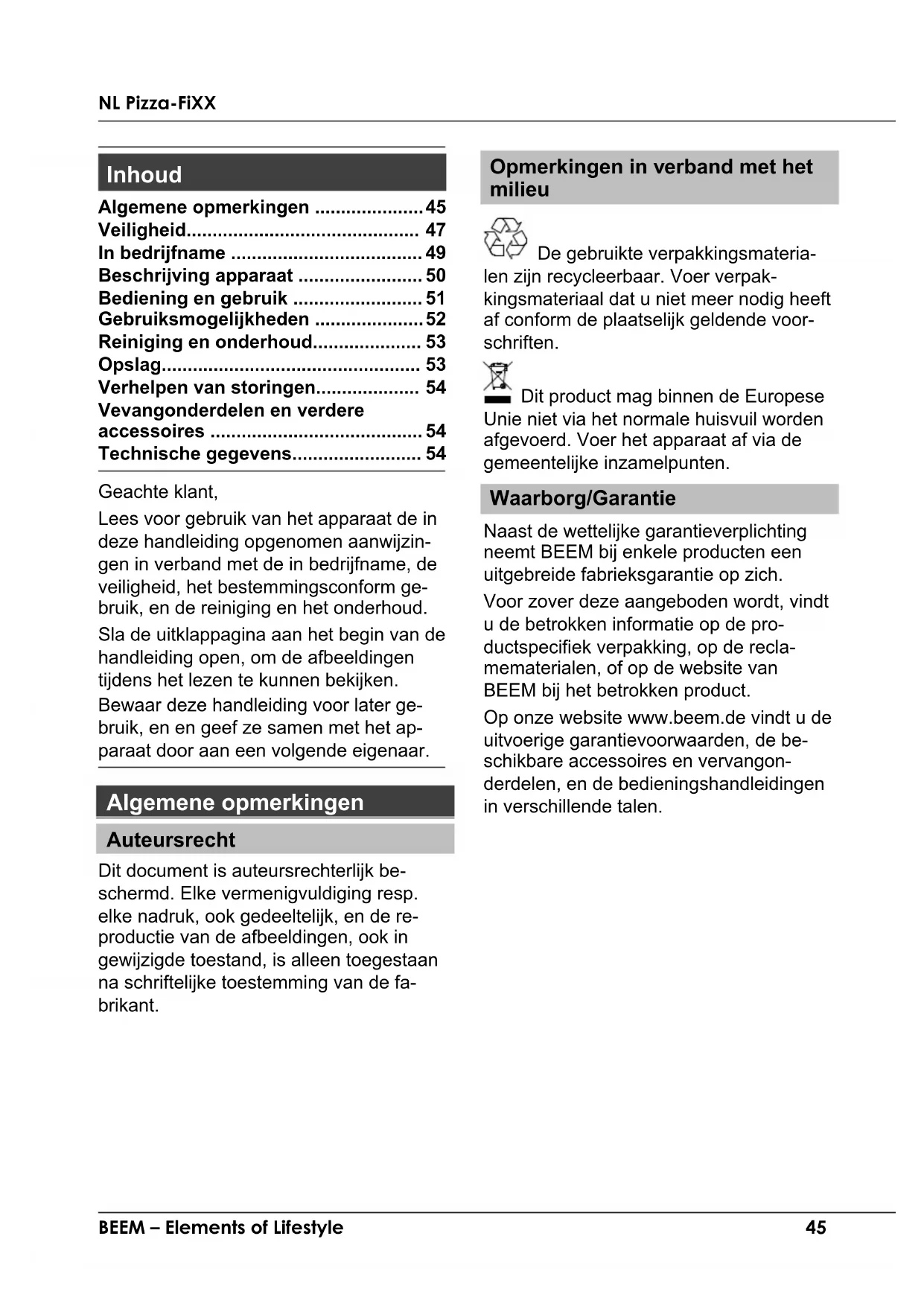 Geachte klant, Lees voor gebruik van het apparaat de in deze handleiding opgenomen aanwijzin- gen in verband met de in bedrijfname, de veiligheid, het bestemmingsconform ge- bruik, en de reiniging en het onderhoud. Sla de uitklappagina aan het begin van de handleiding open, om de afbeeldingen tijdens het lezen te kunnen bekijken. Bewaar deze handleiding voor later ge- bruik, en en geef ze samen met het ap- paraat door aan een volgende eigenaar. Algemene opmerkingen Auteursrecht Dit document is auteursrechterlijk be- schermd. Elke vermenigvuldiging resp. elke nadruk, ook gedeeltelijk, en de re- productie van de afbeeldingen, ook in gewijzigde toestand, is alleen toegestaan na schriftelijke toestemming van de fa- brikant. Opmerkingen in verband met het milieu De gebruikte verpakkingsmateria- len zijn recycleerbaar. Voer verpak- kingsmateriaal dat u niet meer nodig heeft af conform de plaatselijk geldende voor- schriften. Dit product mag binnen de Europese Unie niet via het normale huisvuil worden afgevoerd. Voer het apparaat af via de gemeentelijke inzamelpunten. Waarborg/Garantie Naast de wettelijke garantieverplichting neemt BEEM bij enkele producten een uitgebreide fabrieksgarantie op zich. Voor zover deze aangeboden wordt, vindt u de betrokken informatie op de pro- ductspecifiek verpakking, op de recla- mematerialen, of op de website van BEEM bij het betrokken product. Op onze website www.beem.de vindt u de uitvoerige garantievoorwaarden, de be- schikbare accessoires en vervangon- derdelen, en de bedieningshandleidingen in verschillende talen.Pizza-FiXX NL 46 BEEM – Elements of Lifestyle Gebruikte symbolen GEVAAR Wordt gebruikt voor een onmiddellijk dreigend gevaar, dat tot zware letsels of de dood voert. Ter vermijding van het gevaar de hierna opgesomde aanwijzingen volgen. WAARSCHUWING Wordt gebruikt voor een mogelijk ge- vaarlijke situatie, die tot zware letsels of de dood kan voeren. Ter vermijding van het gevaar de hierna opgesomde aanwijzingen volgen. VOORZICHTIG Wordt gebruikt voor een mogelijk ge- vaarlijke situatie, die kan leiden tot lichte kwetsuren. Ter vermijding van het gevaar de hierna opgesomde aanwijzingen volgen. LET OP Wordt gebruikt voor een situatie, die kan leiden tot materiële schade. Ter vermijding van het gevaar de hierna opgesomde aanwijzingen volgen. Aansprakelijkheidsbeperkingen Wij aanvaarden geen aansprakelijkheid bij schade of vervolgschade bij: