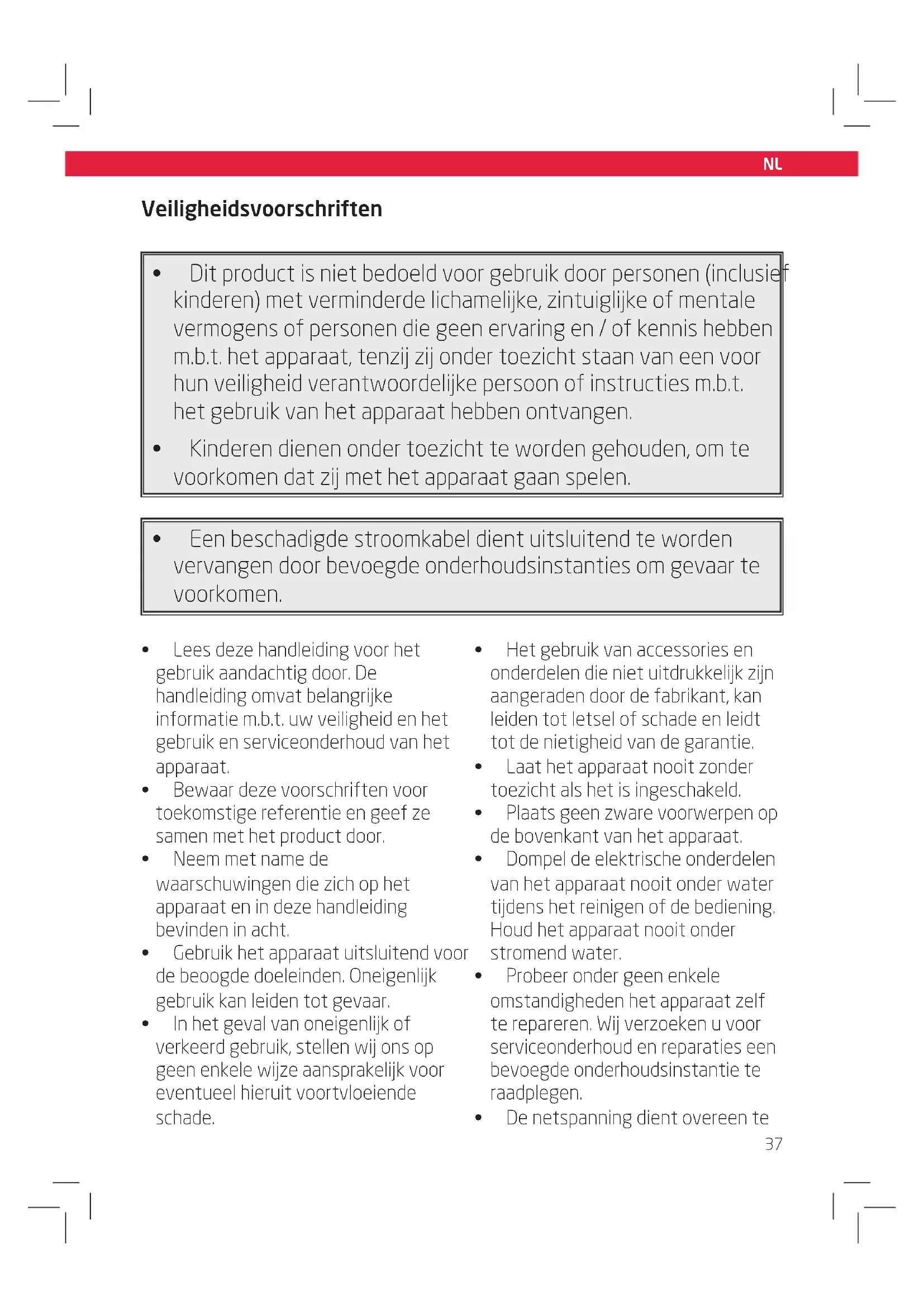 Koppel het apparaat los van het voedingsnet als het apparaat Niet in gebruik is of als er spreke is van storingen en alvorens accessoires te verbinden of te verwijderen en voor elke reinigingshandeling. - Als de stroomkabel of de behuizing van het apparaat is beschadigd of als het apparaat is geallen, dient het apparaat Niet更是 te worden gebruikt, totdat het apparaat is onderzoucht door een bevoegde onderhoudsinstantie.