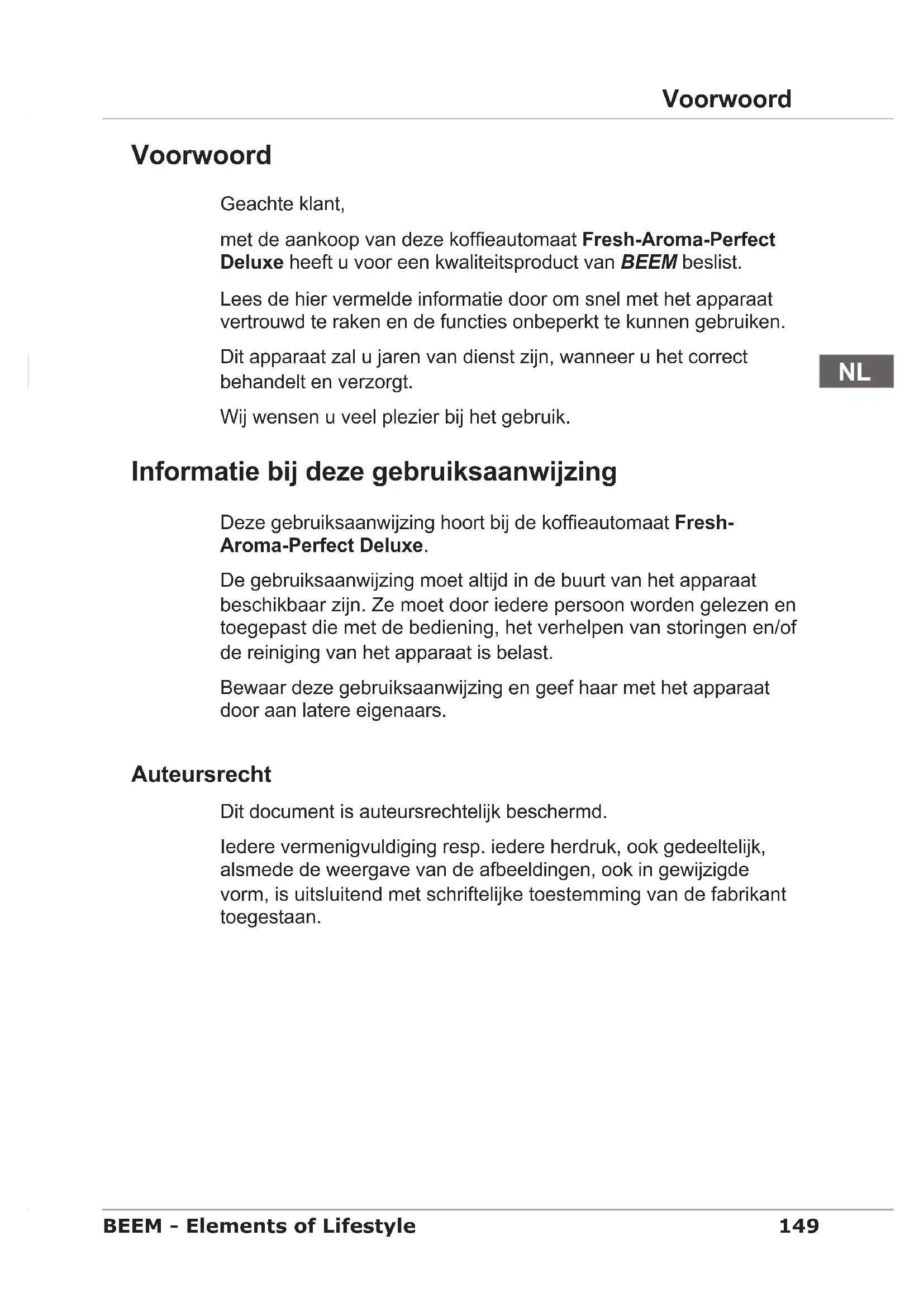 Voorwoord Geachte klant, met de aankoop van deze kofeautomaat Fresh-Aroma-Perfect Deluxe heeft u voor een kwaliteitsproduct van BEEM beslist. Lees de hier vermelde informatie door om snel met het apparaat vertrouwd te raken en de functies onbeperkt te kunnen gebruiken. Dit apparaat zal u jaren van dienst zijn, wanneer u het correct behandelt en verzorgt. Wij wensen u veel plezier bij het gebruik. Informatie bij deze gebruiksaanwijzing Deze gebruiksaanwijzing hoort bij de kofeautomaat Fresh- Aroma-Perfect Deluxe. De gebruiksaanwijzing moet altijd in de buurt van het apparaat beschikbaar zijn. Ze moet door iedere persoon worden gelezen en toegepast die met de bediening, het verhelpen van storingen en/of de reiniging van het apparaat is belast. Bewaar deze gebruiksaanwijzing en geef haar met het apparaat door aan latere eigenaars. Auteursrecht Dit document is auteursrechtelijk beschermd. Iedere vermenigvuldiging resp. iedere herdruk, ook gedeeltelijk, alsmede de weergave van de afbeeldingen, ook in gewijzigde vorm, is uitsluitend met schriftelijke toestemming van de fabrikant toegestaan.150 Informatie bij deze gebruiksaanwijzing BEEM - Elements of Lifestyle