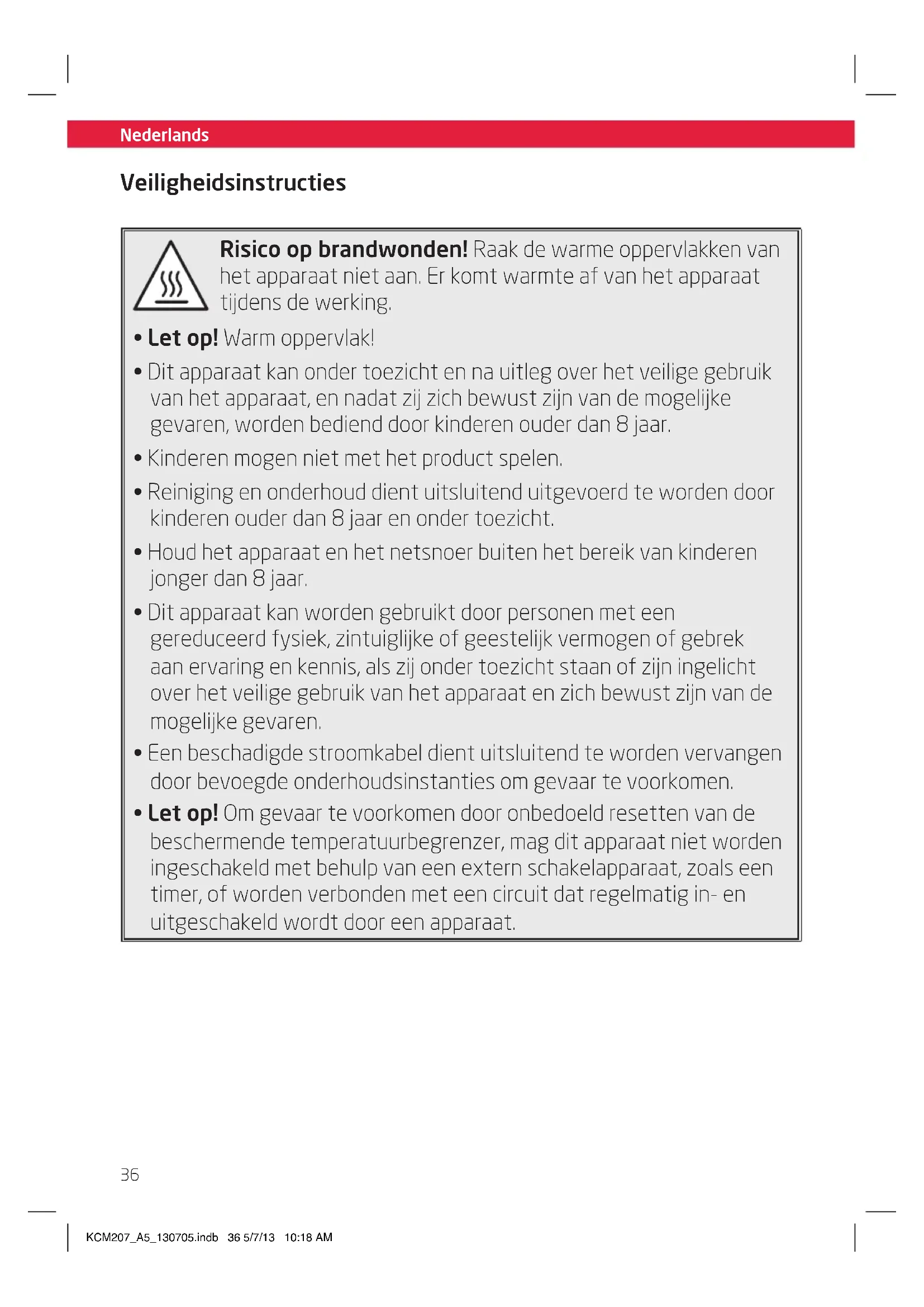 - Let op! Om gevaar te voorkomen door onbedoeld resetten van de beschermende temperatuurbegrenzer, mag dit apparaat niet worden ingeschakeld met behulp van een extern schakelapparaat, zoals een timer, of worden verbonden met een circuit dat regelmatig in- en uitgeschakeld wordt door een apparaat. KCM207_A5_130705.indb 36 5/7/13 10:18 AMNederlands