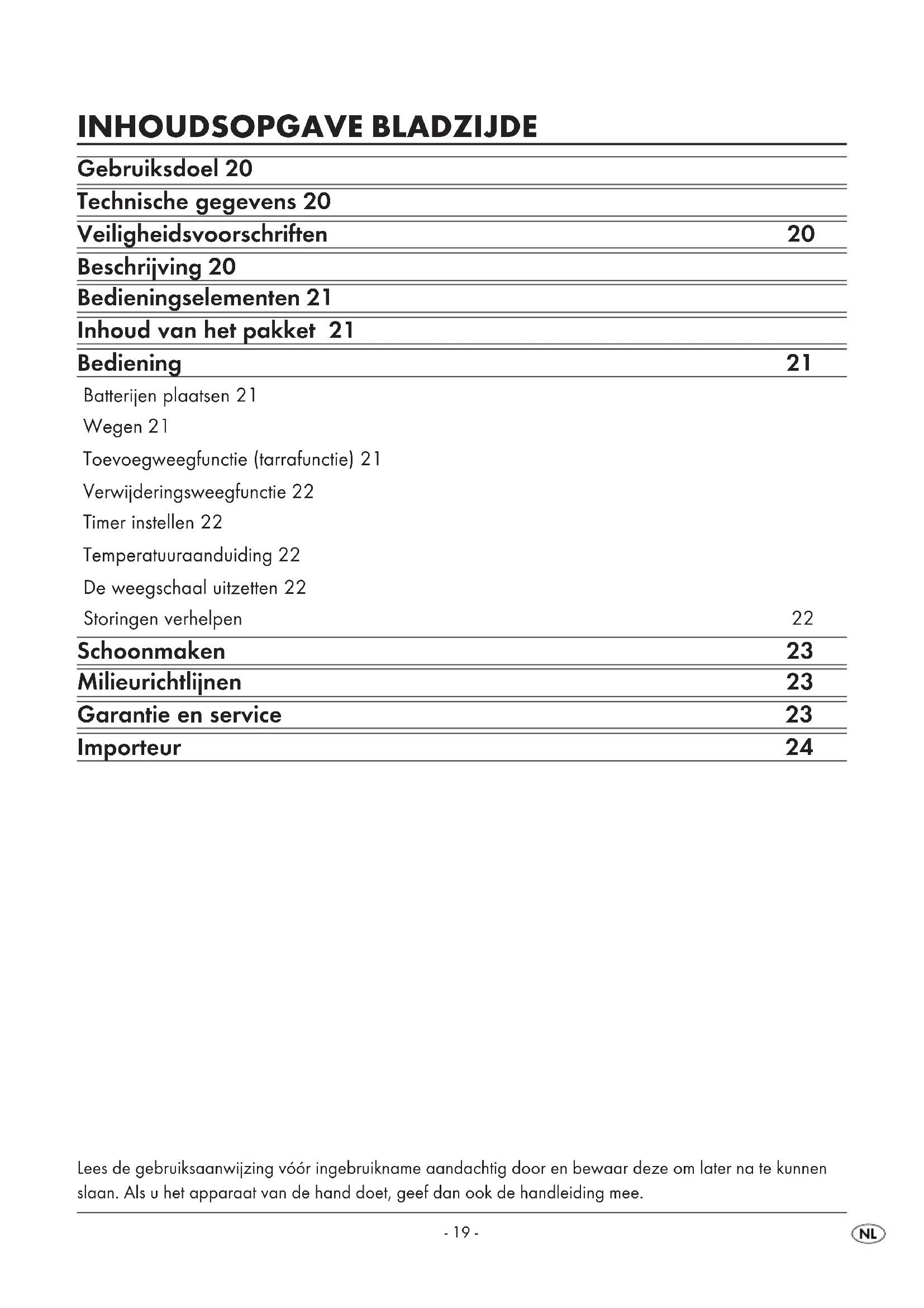 Attentie! Zorg ervoor dat er geen vloeistoffen in de weeg- schaal terecht kunnen komen. Door binnendringen- de vloeistoffen kan de weegschaal beschadigd raken. Neem de weegschaal af met een doek die licht bevochtigd is met mild zeepsop. Gebruik geen schuur- of oplosmiddelen. U kunt de schotel in de vaatwasser afwassen. De schotel is vaatwasserbe- stendig. Milieurichtlijnen Deponeer het apparaat in geen geval bij het normale huisvuil. Dit product is onderhevig aan de Europese richtlijn 2002/96/EC. Voer het apparaat af via een erkend afvalverwer- kingsbedrijf of via uw gemeentereiniging. Neem de bestaande voorschriften in acht. Neem in geval van twijfel contact op met de gemeentelijke reinigingsdienst. Batterijen Deponeer de batterijen in geen geval bij het norma- le huisvuil. Batterijen kunnen giftige stoffen bevatten die scha- delijk zijn voor het milieu. Ontdoe u daarom altijd van de batterijen in overeenstemming met de be- staande wettelijke bepalingen. Voer alle verpakkingsmaterialen op een milieuvriendelijke manier af. Garantie en service U heeft op dit apparaat 3 jaar garantie vanaf de aankoopdatum. Het apparaat is met de grootst mogelijke zorg vervaardigd en voorafgaand aan de levering nauwkeurig gecontroleerd. Bewaar a.u.b. de kassabon als aankoopbewijs. Mocht u aanspraak willen maken op de garantie, neem dan telefonisch contact op met uw serviceadres. Alleen op die manier is een kostenloze verzending van uw product gegarandeerd. De garantie geldt uitsluitend voor materiaal- of fabricagefouten, niet voor aan slijtage onderhevige delen of voor beschadigingen van breekbare on- derdelen, bijv. schakelaars of accu's. Het pro- duct is uitsluitend bestemd voor privé-gebruik en niet voor bedrijfsmatige doeleinden. Bij verkeerd gebruik en ondeskundige behandeling, bij gebruik van geweld en bij reparaties die niet door ons geautoriseerd servicefiliaal zijn uitge- voerd, vervalt de garantie. Uw wettelijke rechten worden door deze garantie niet ingeperkt. Kompernass Service Netherland Tel.: 0900 1240001 e-mail: support.nl@kompernass.com IB_KH1156_KOE1427_NL_1 09.04.2008 16:31 Uhr Seite 23- 24 - Importeur KOMPERNASS GMBH BURGSTRASSE 21